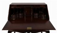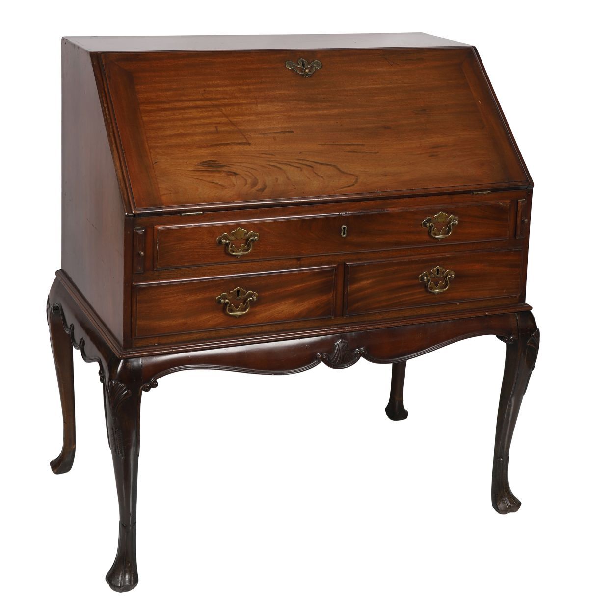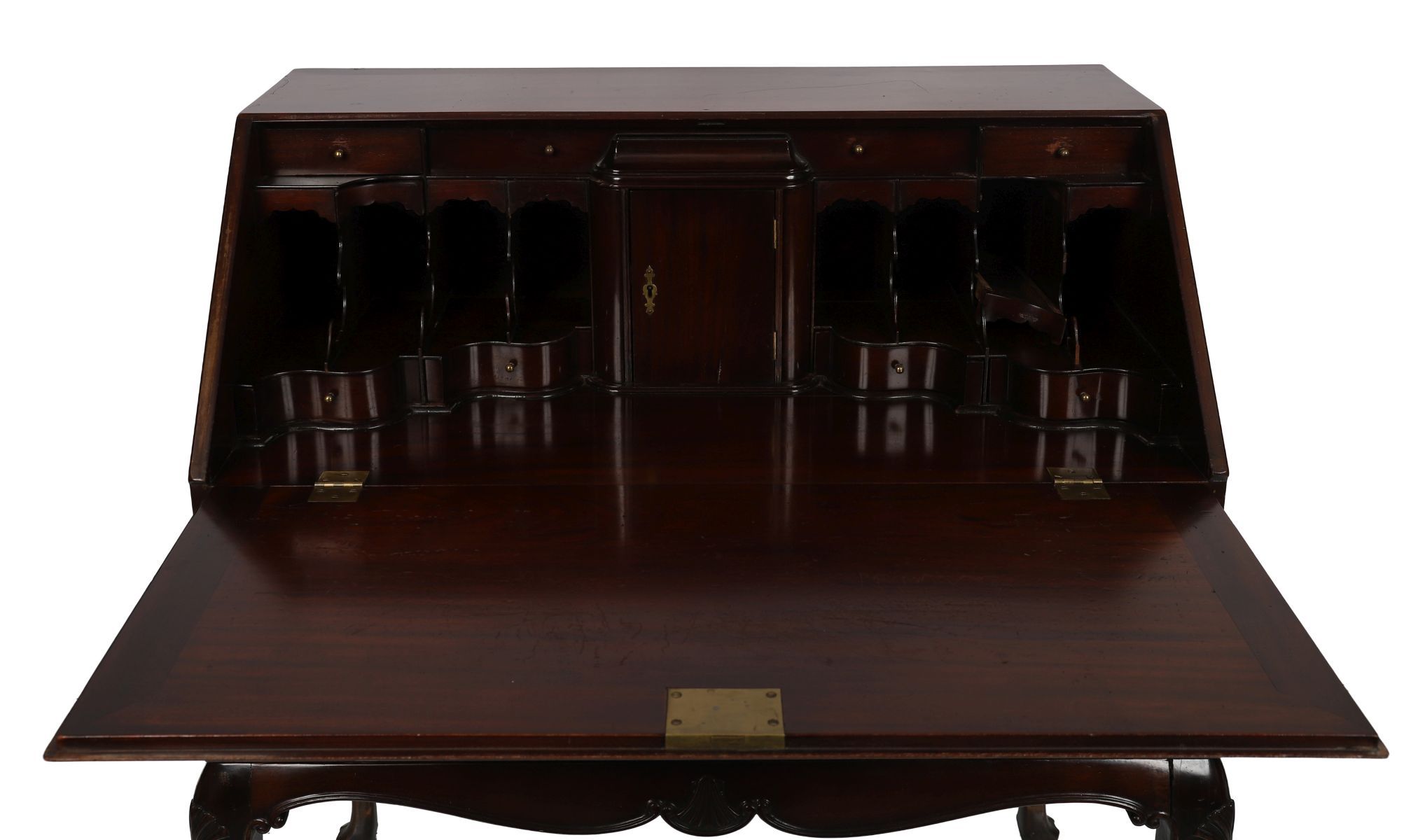 Fall-front bureau with fitted interior of drawers and pigeonholes, over two short and one long drawer, shaped apron with shell carving, cabriole legs with pad feet.