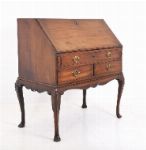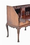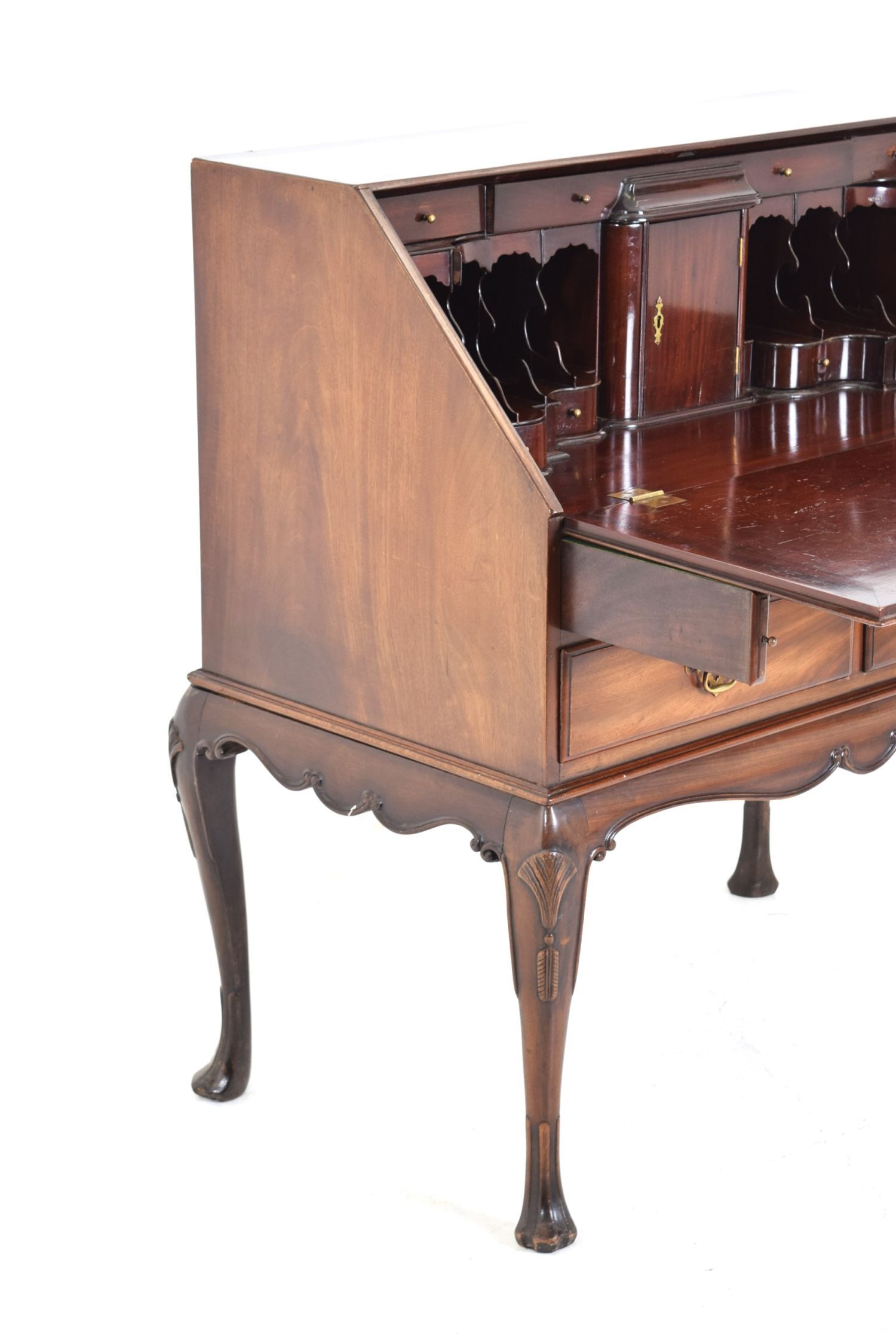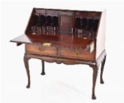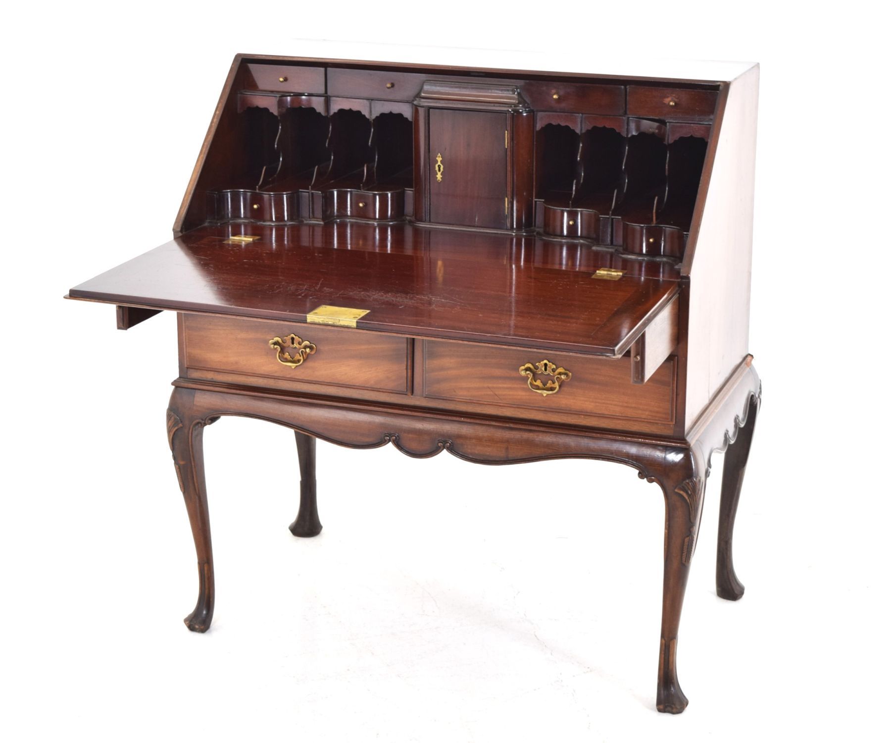 Fall-front bureau with fitted interior of drawers and pigeonholes, over two short and one long drawer, shaped apron with shell carving, cabriole legs with pad feet.