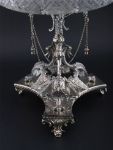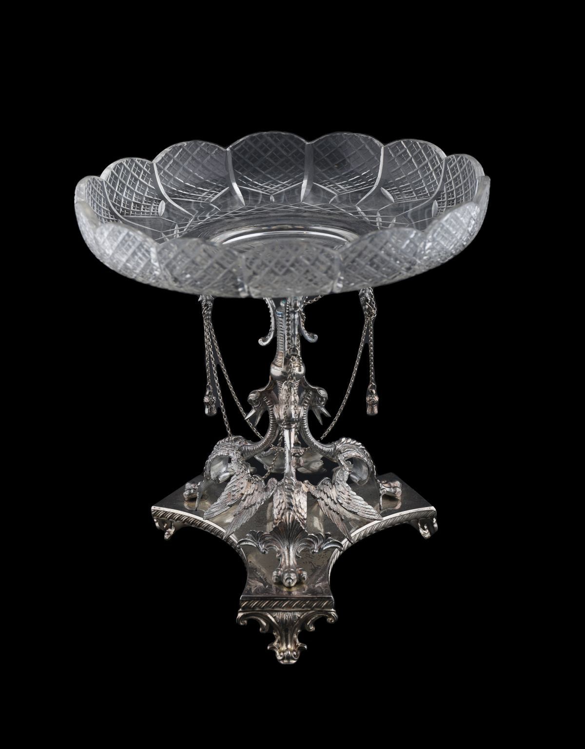 Deeply cut glass bowl with scalloped rim, raised on an ornate tripart silver-plated stand with winged figures and pendant chains, stamped Daniel & Arter, Birmingham.