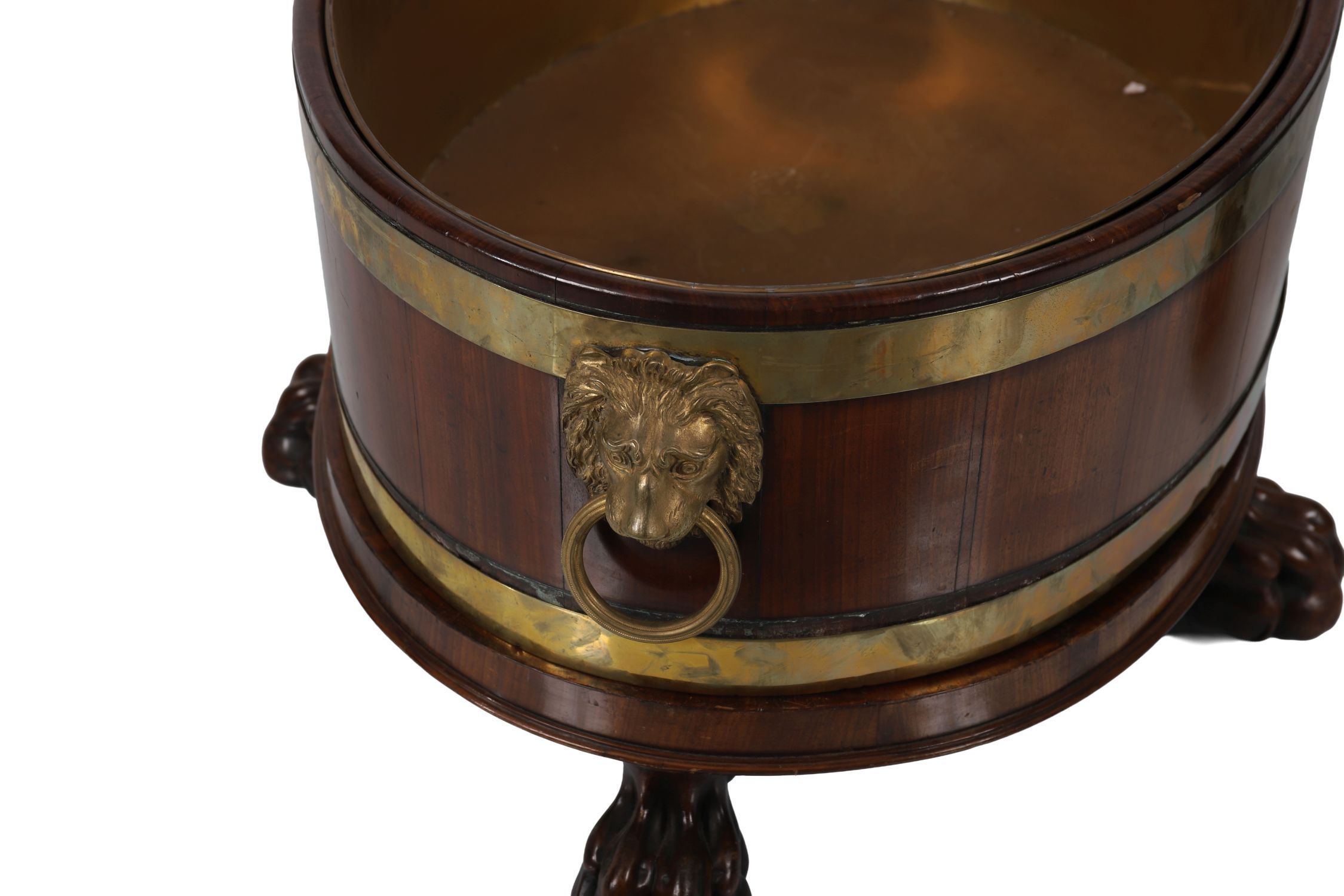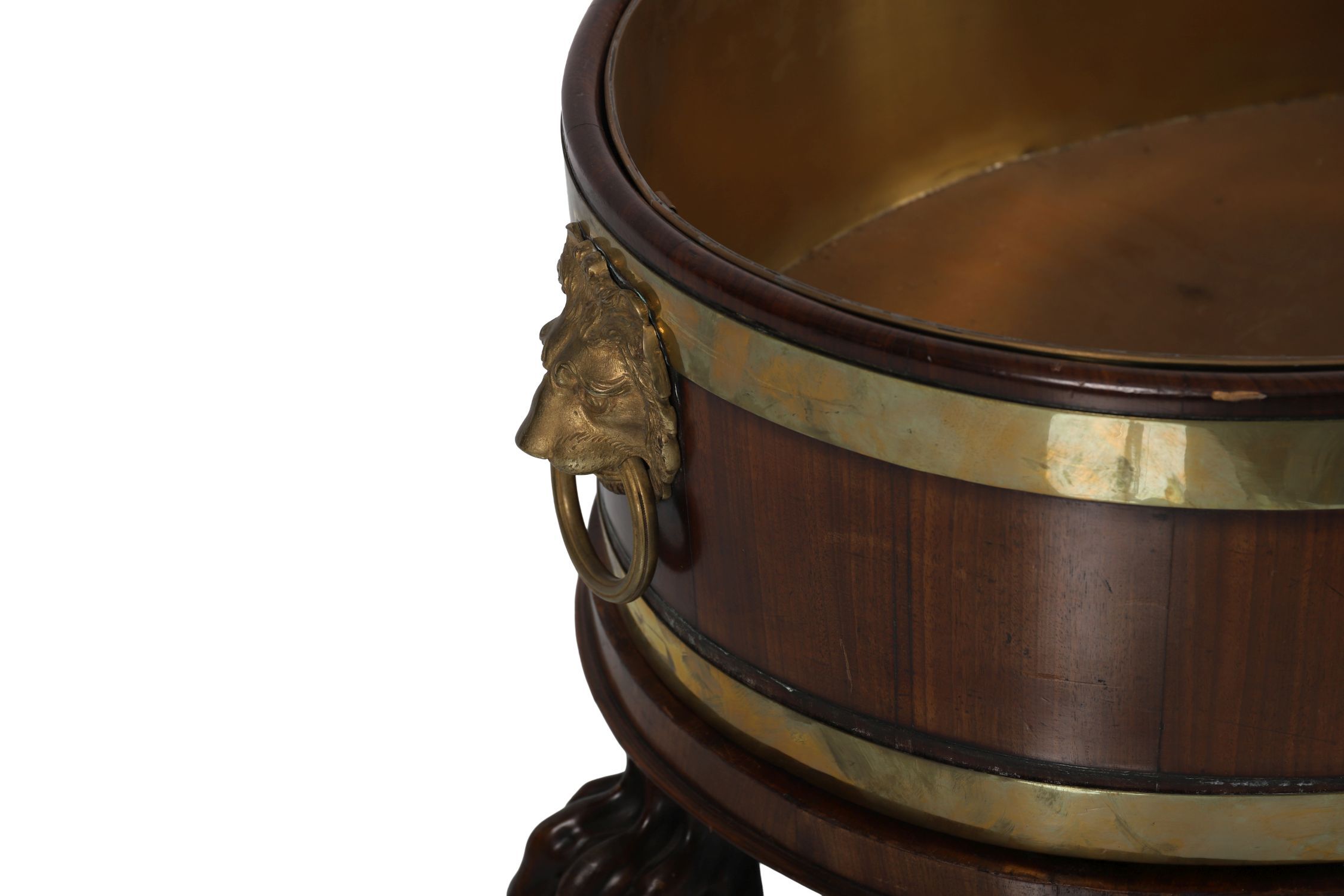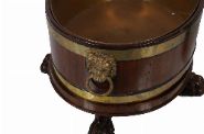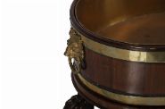 An Irish late 18th to early 19th-century oval mahogany wine cooler or cellarette, of coopered form with twin brass bands and lion-mask ring handles. Raised on well-carved paw feet, the body exhibits a rich, figured grain and retains a warm period patina.