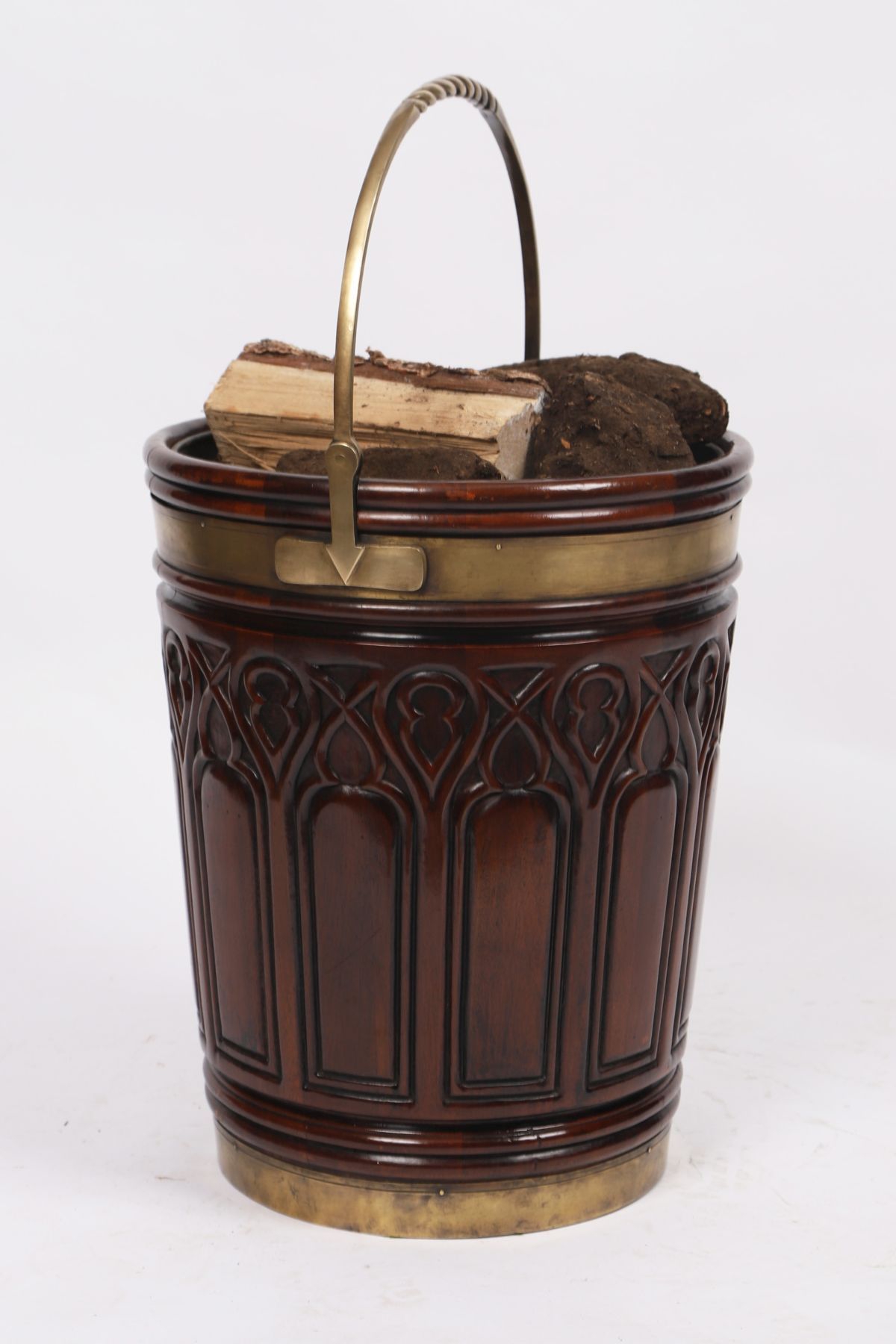the body of tapered Gothic panelled form complete with brass swing handle.