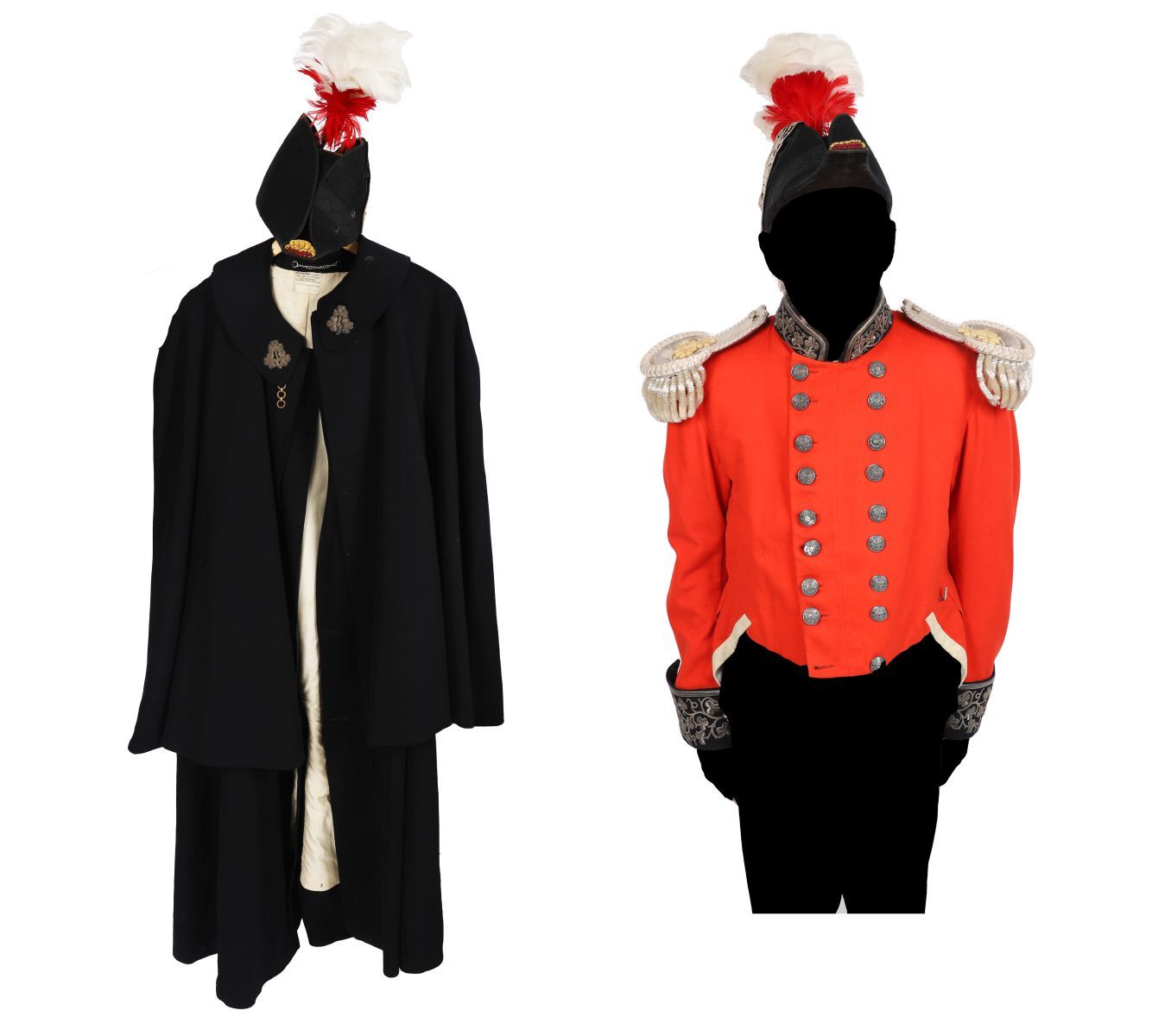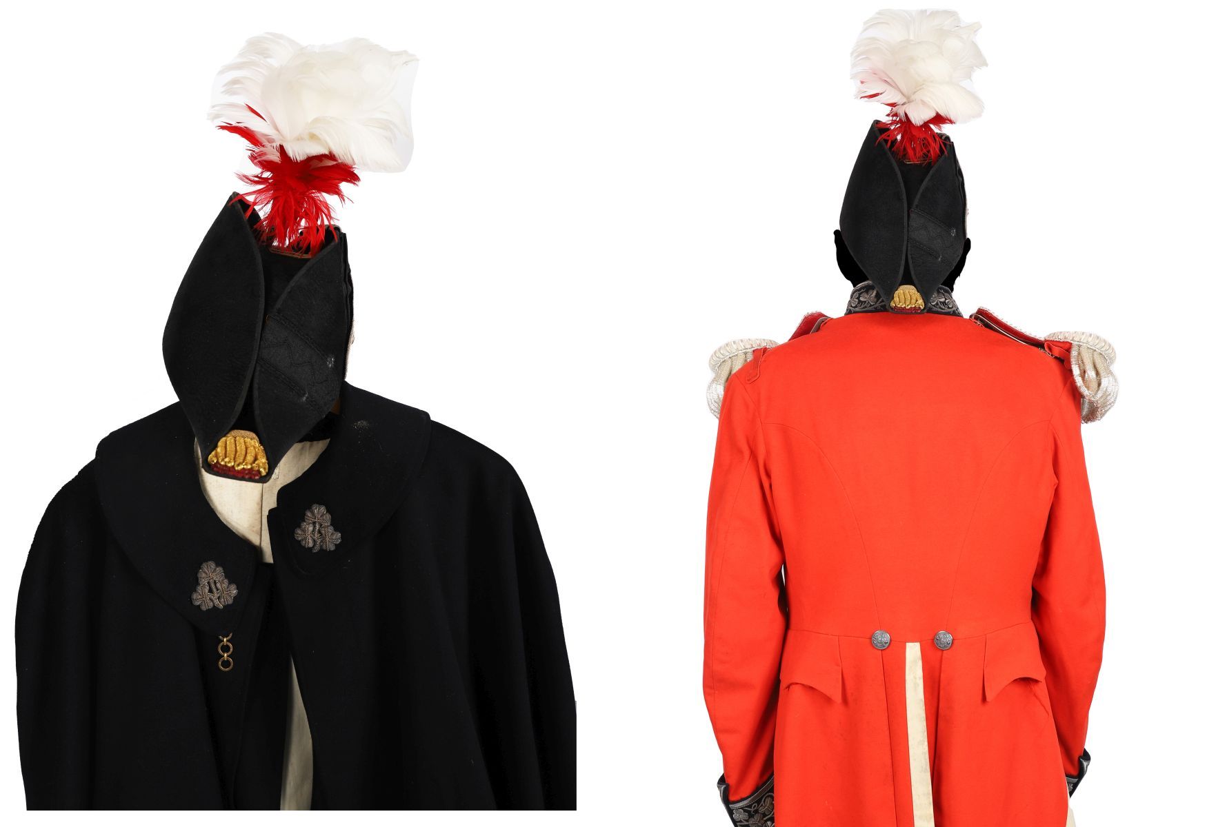 comprising a red tunic, dark trousers, epaulettes, a feather-plumed bicorn hat, and a dark overcoat.