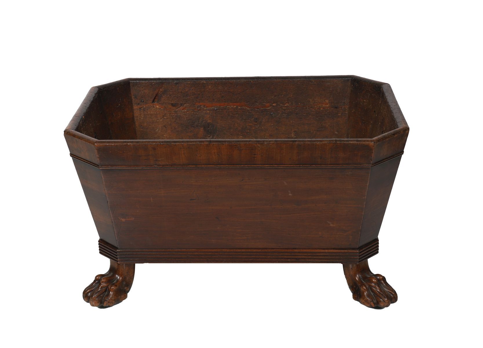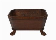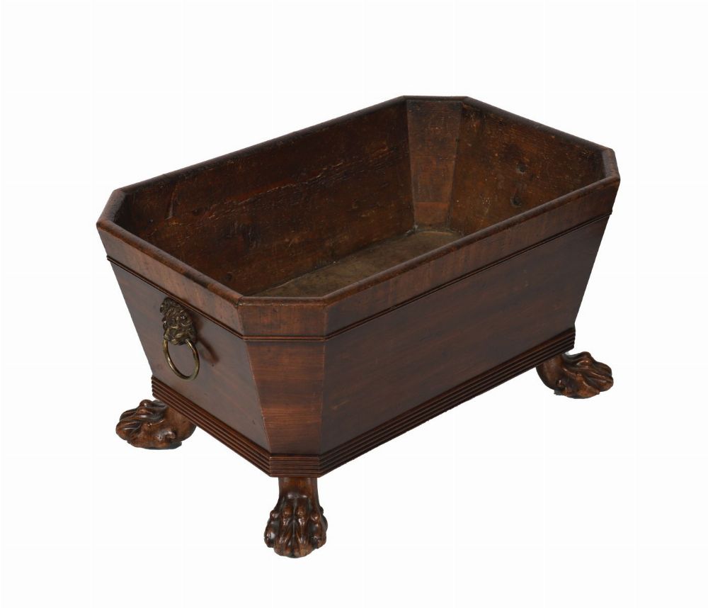 Circa 1820. Of sarcophagus form with hinged lid, cross-banded panels and brass ring handles to either side, raised on reeded paw feet. The interior fitted for bottles. Fine rich patina.