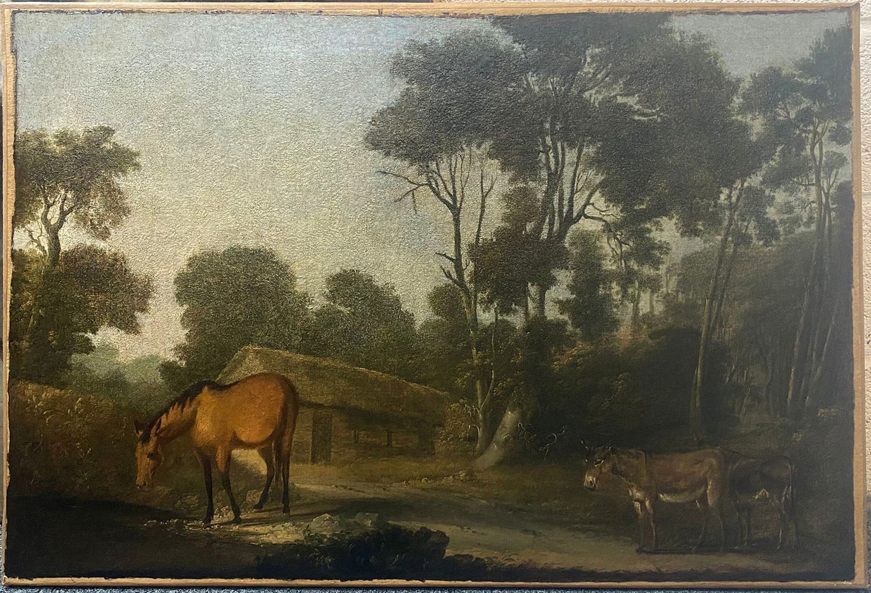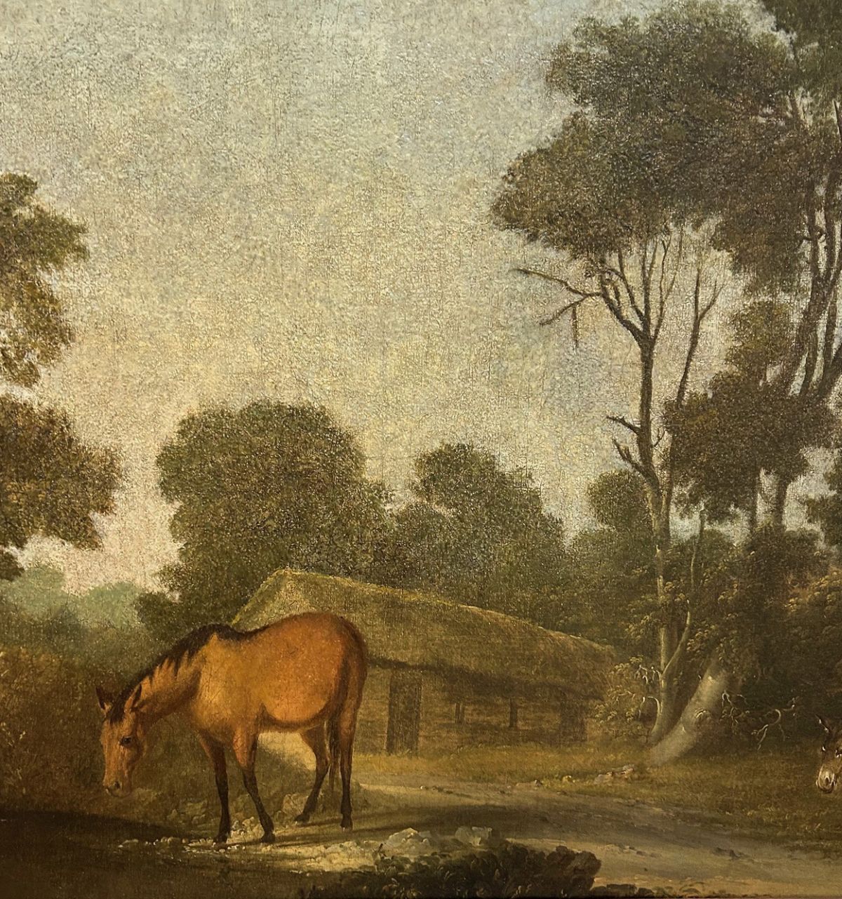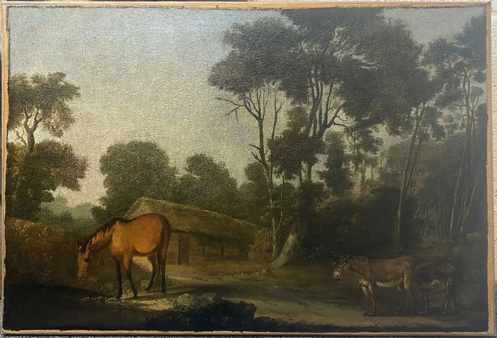 Landscape with Cottage, Horses and Donkeys in the foreground. Oil on canvas depicting a tranquil rural scene with a brown horse standing before a thatched cottage and two donkeys resting by a shaded woodland path. The work reflects Roberts’s characteristic sensitivity to atmosphere and balance of natural form, combining detailed foreground observation with a lyrical treatment of distance and light.