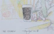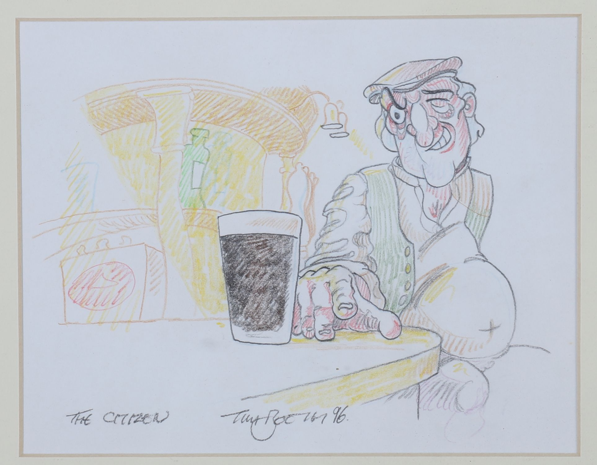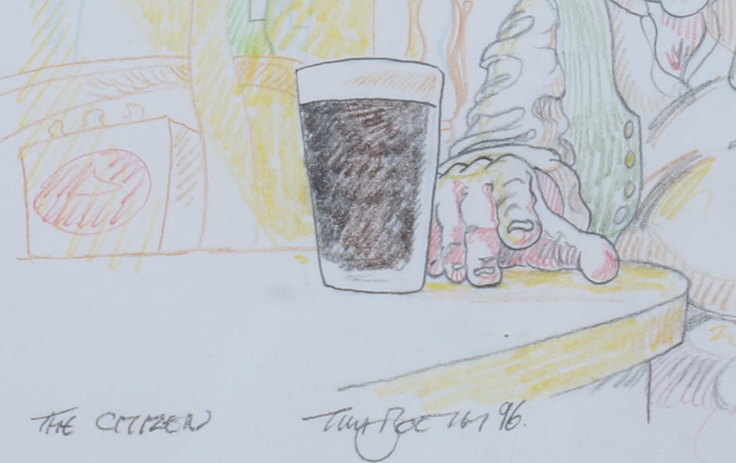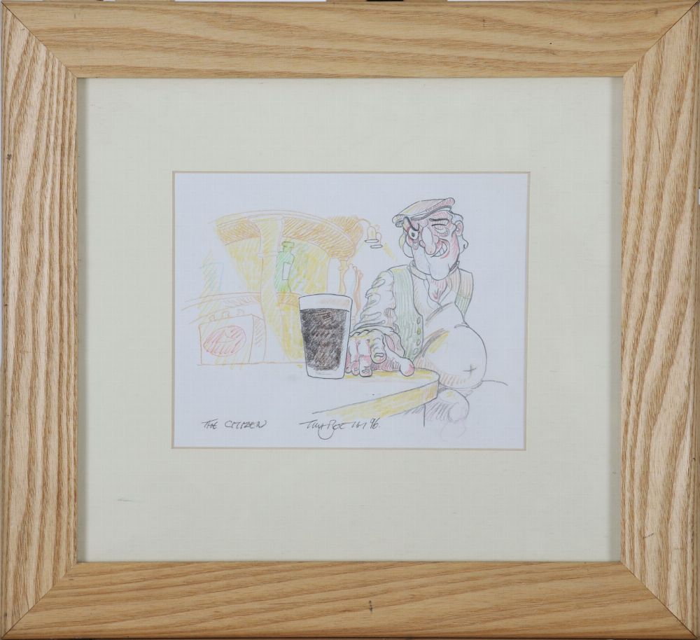 The Citizen – Coloured pencil on paper, signed and titled. A humorous interior scene with two figures in conversation beside a pint, rendered with cartoonish energy and warm colour.