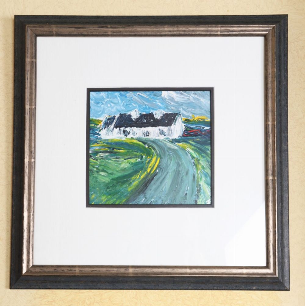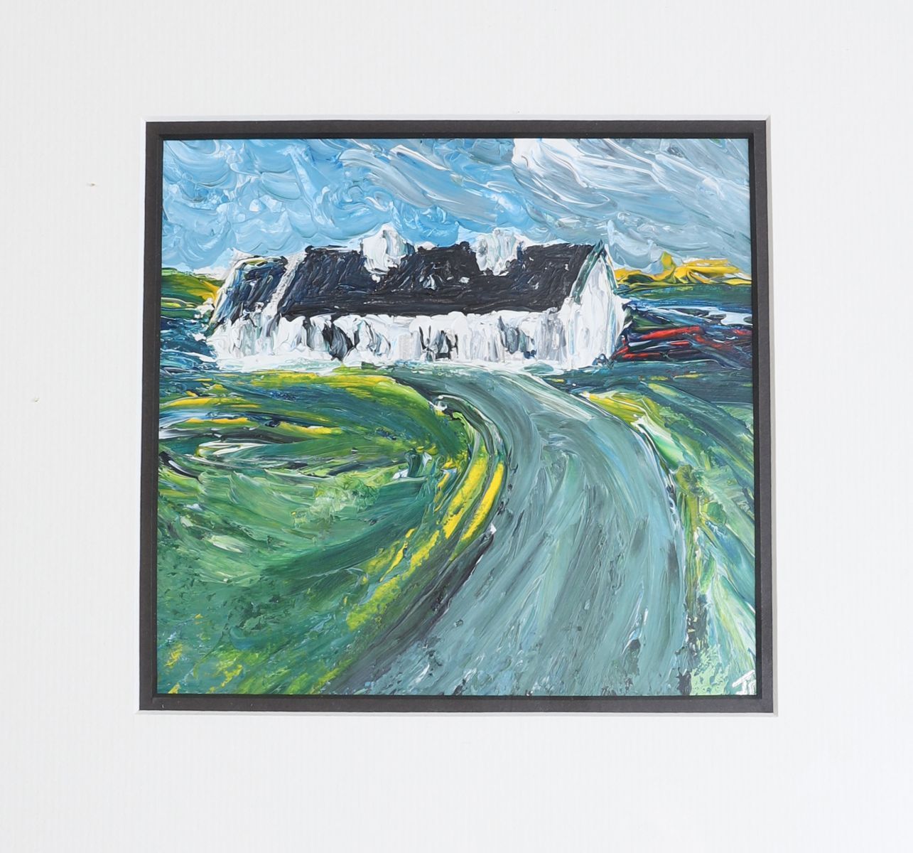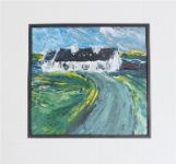 Oil on board, depicting a rural cottage set within an open landscape, painted with expressive brushwork and a strong sense of atmosphere. Presented in a glazed frame. 20th century.