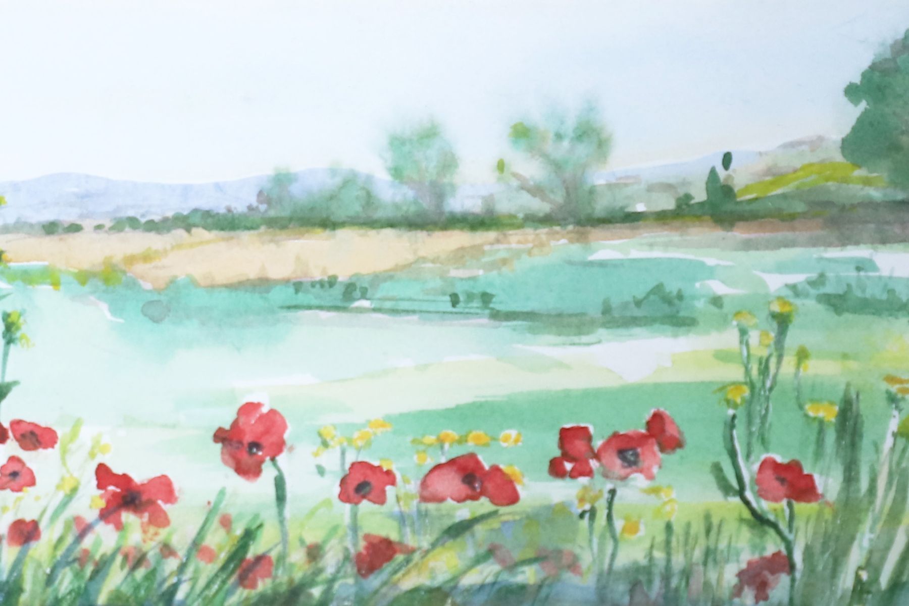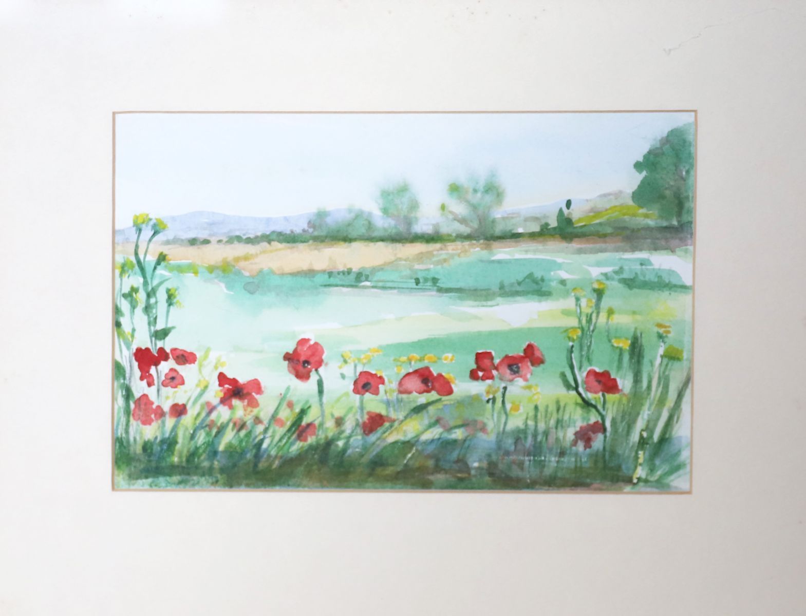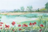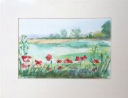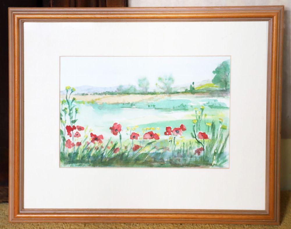 Irish School watercolour depicting a pastoral landscape enriched with flowering plants in the foreground.