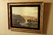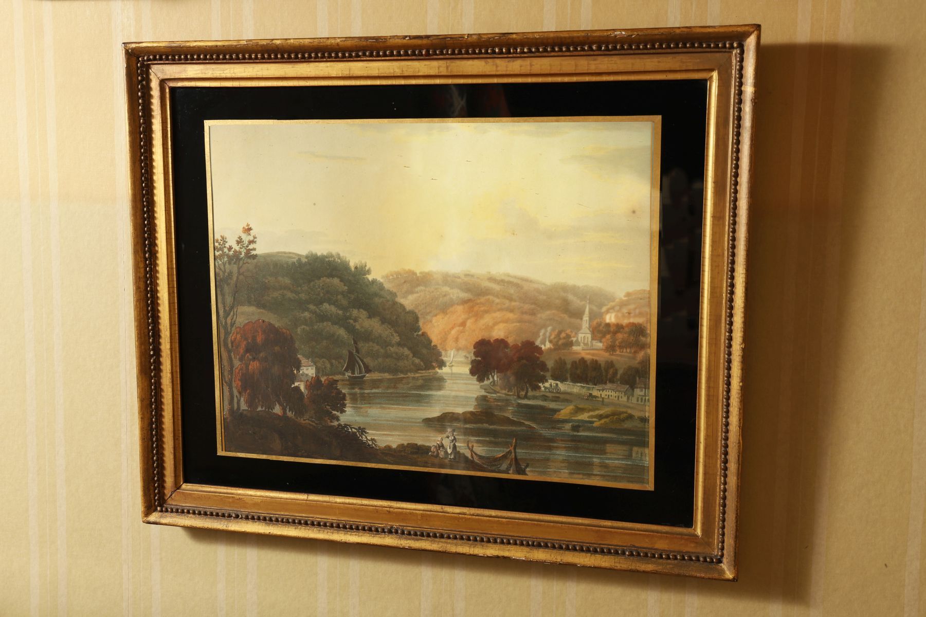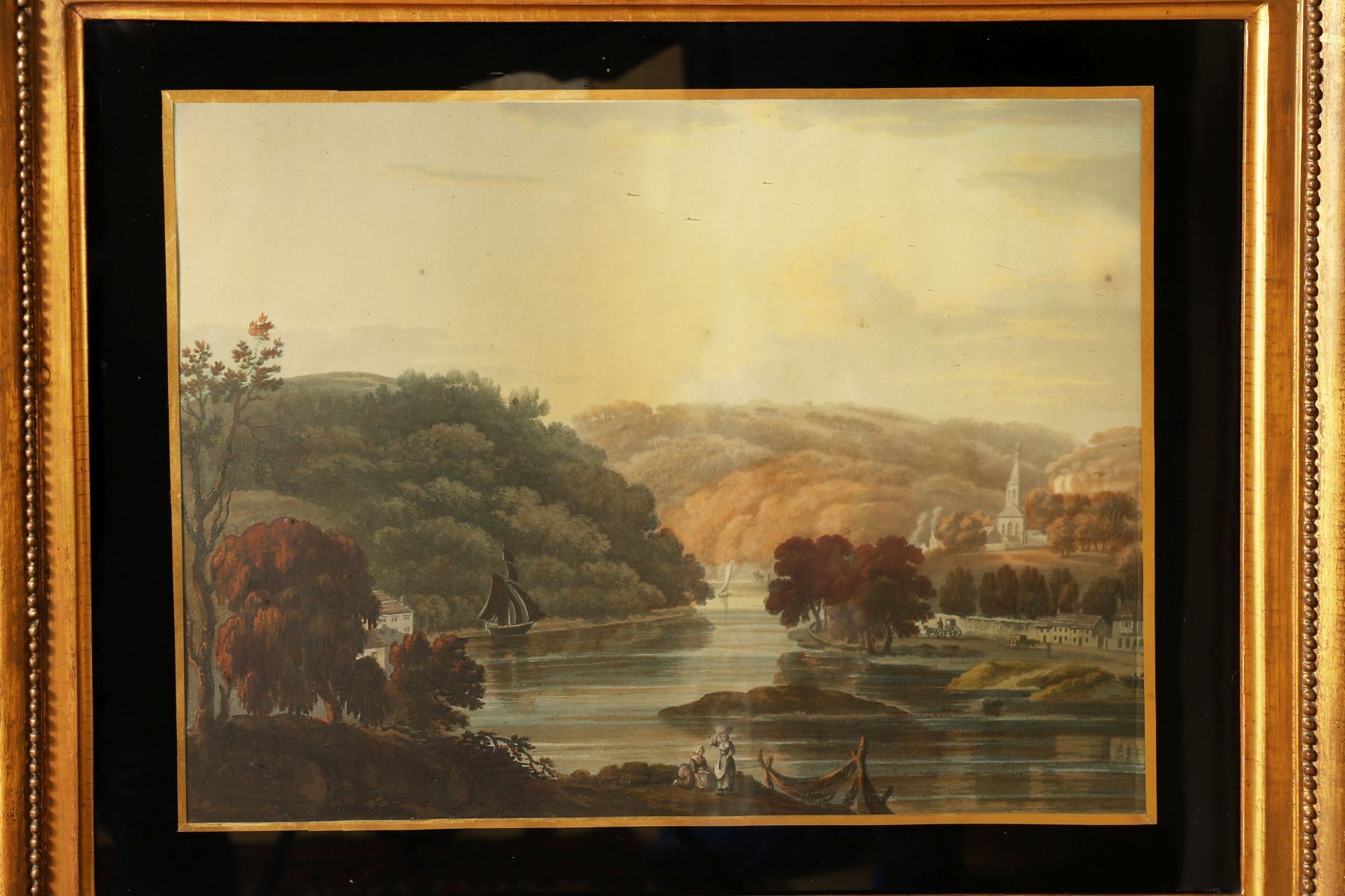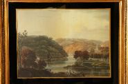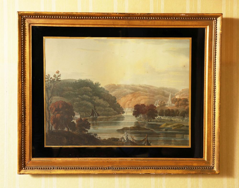 Engraving depicting a river winding through wooded hills with buildings and figures along the banks, rendered in a muted palette. From the collection of A. H. Crawford detailed verso and bearing trade label R. & W. Clarke, 40–41 Grand Parade, Cork. Enclosed in a verre églomisé mount and gilt frame. 19th century.