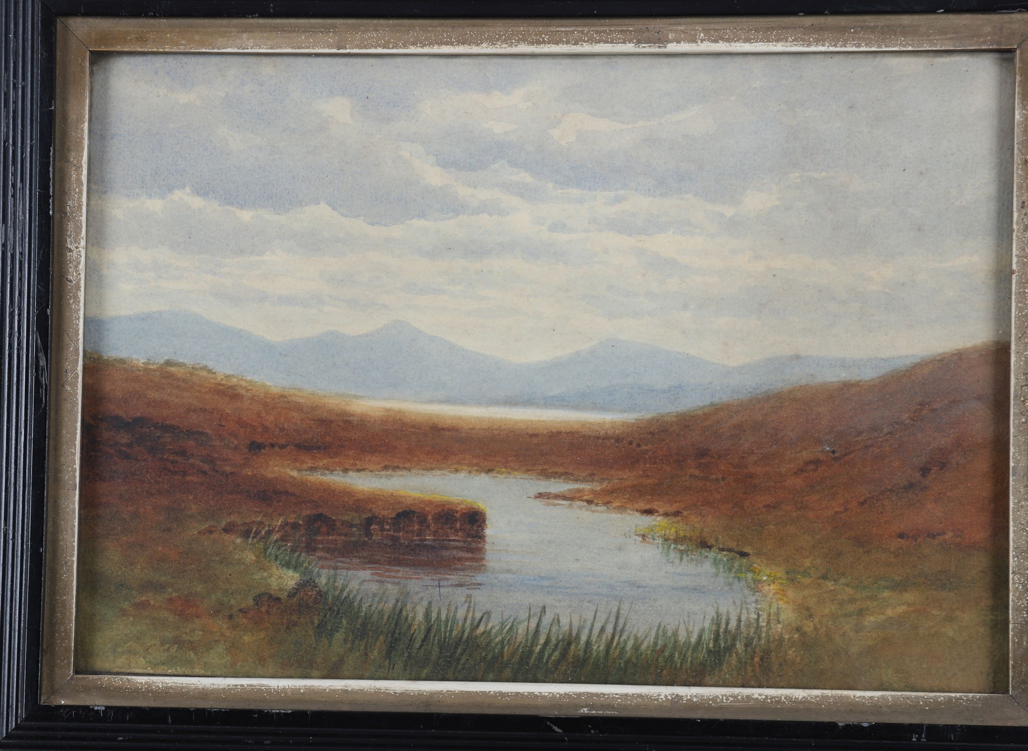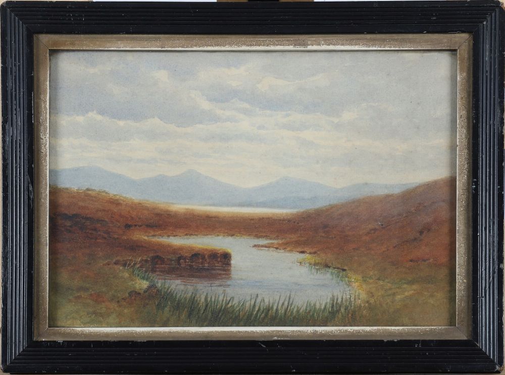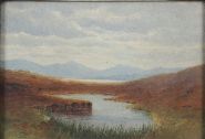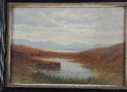 Lot Description: Irish School (20th century), Mountain Landscape with River, an atmospheric oil on board depicting a tranquil moorland scene with winding river in the foreground, framed by rolling bog and distant mountains beneath a softly clouded sky. Executed in a muted palette of earthy browns, greens, and greys with delicate attention to light and reflection.