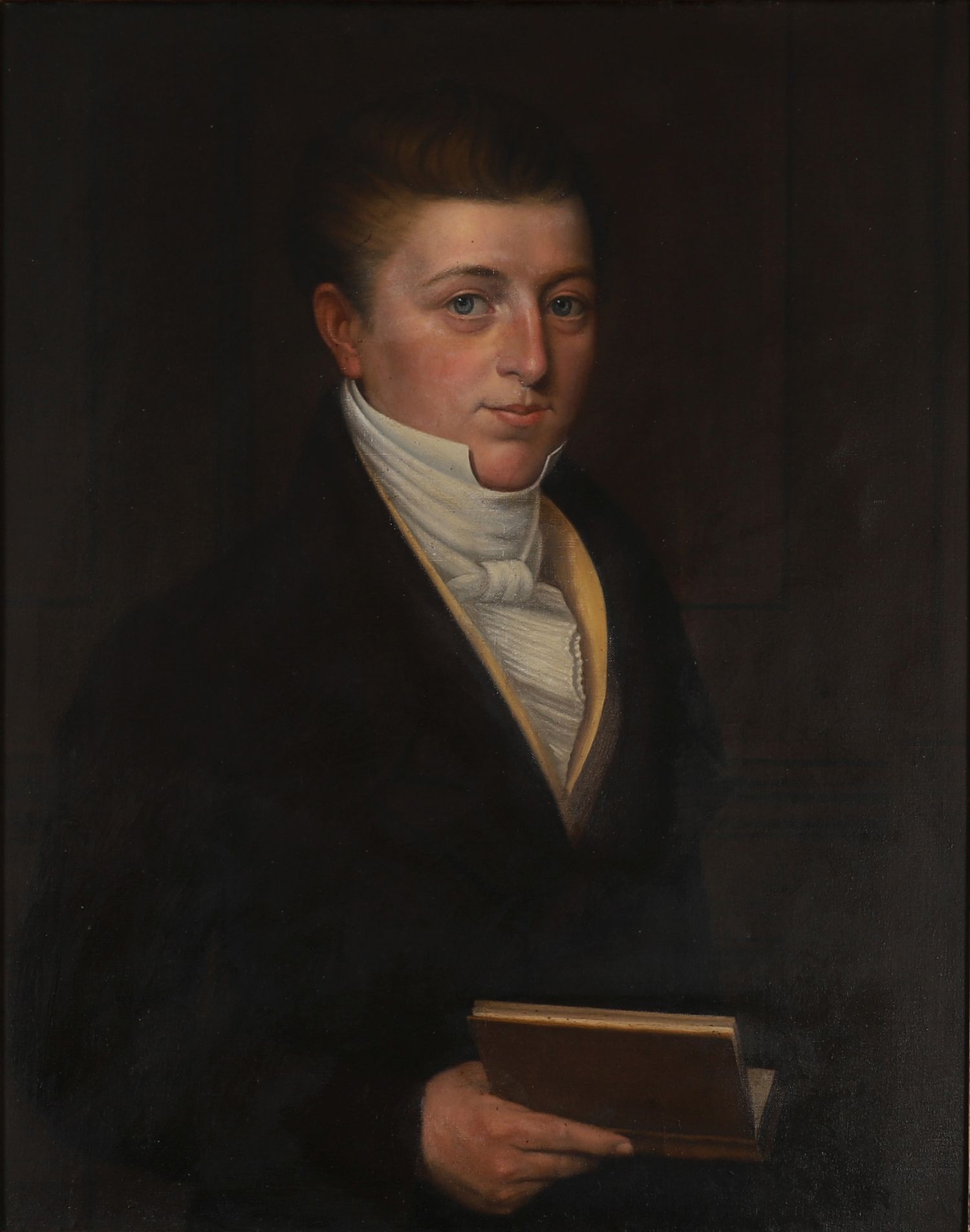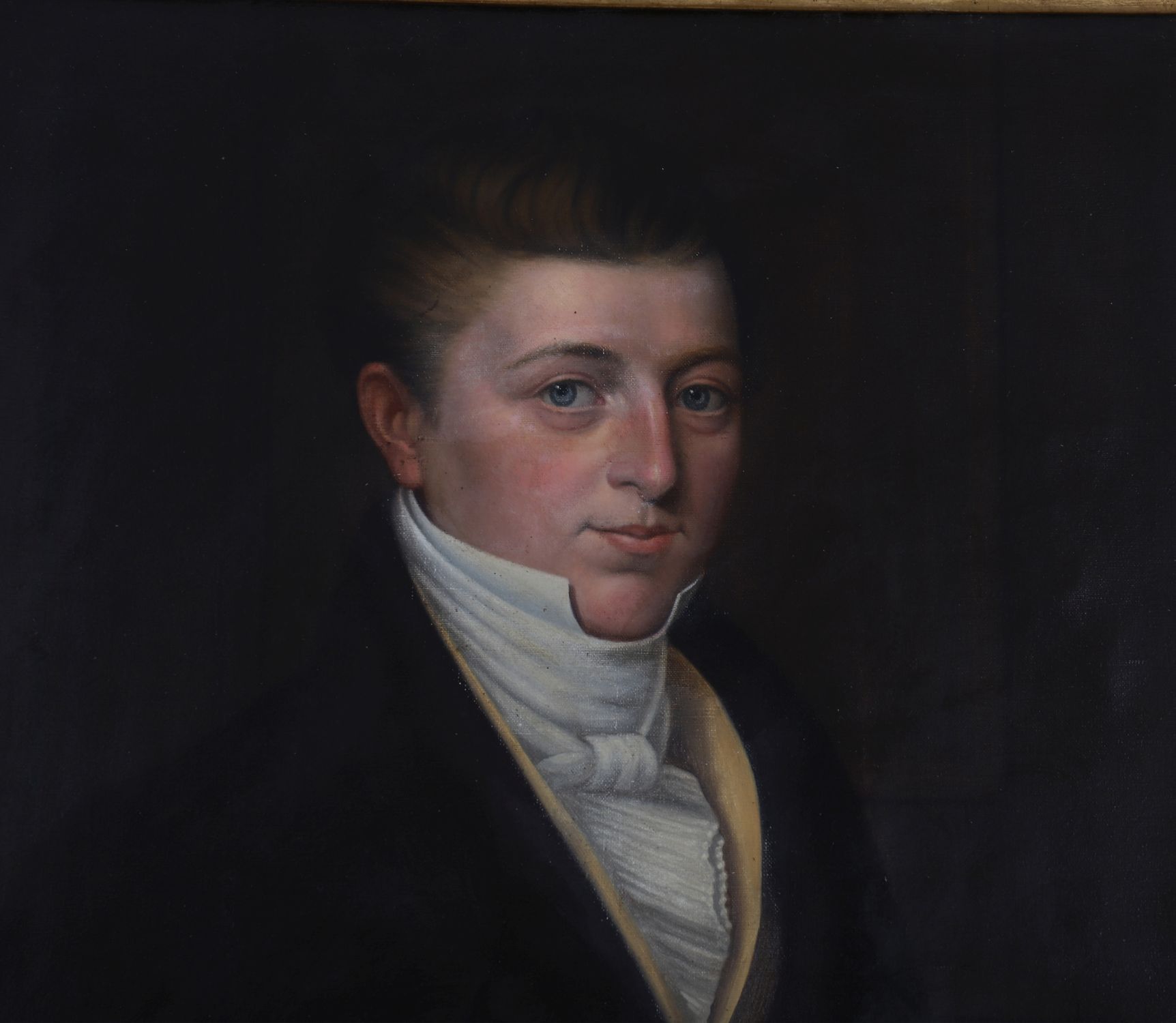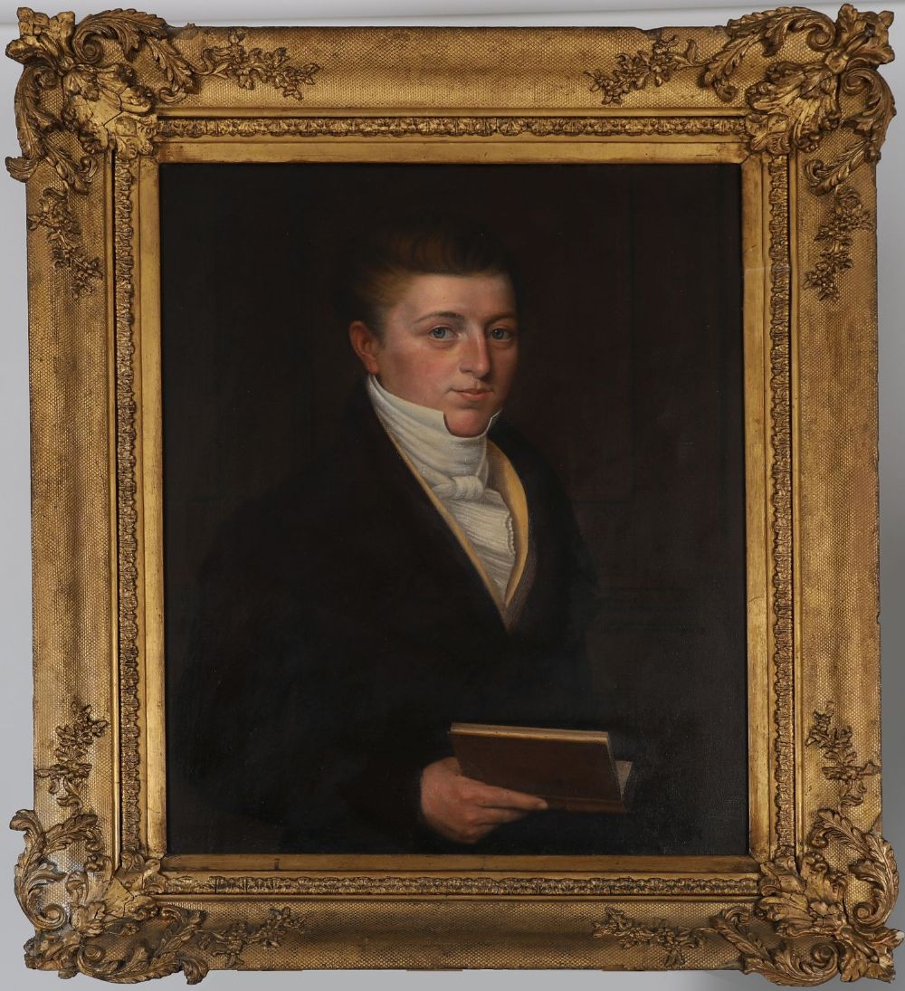 Oil on canvas. A finely executed early 19th-century oil on canvas, depicting a young gentleman traditionally identified as Thomas Carey, holding a closed book and dressed in formal attire with high white cravat and dark coat. Presented in an ornate carved and gilded frame of the period.