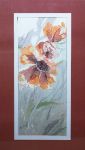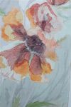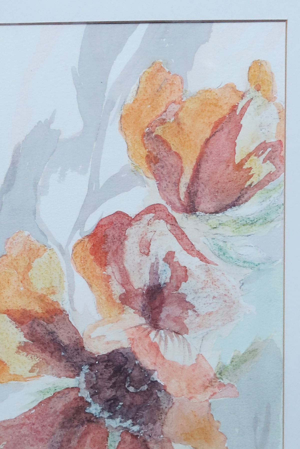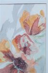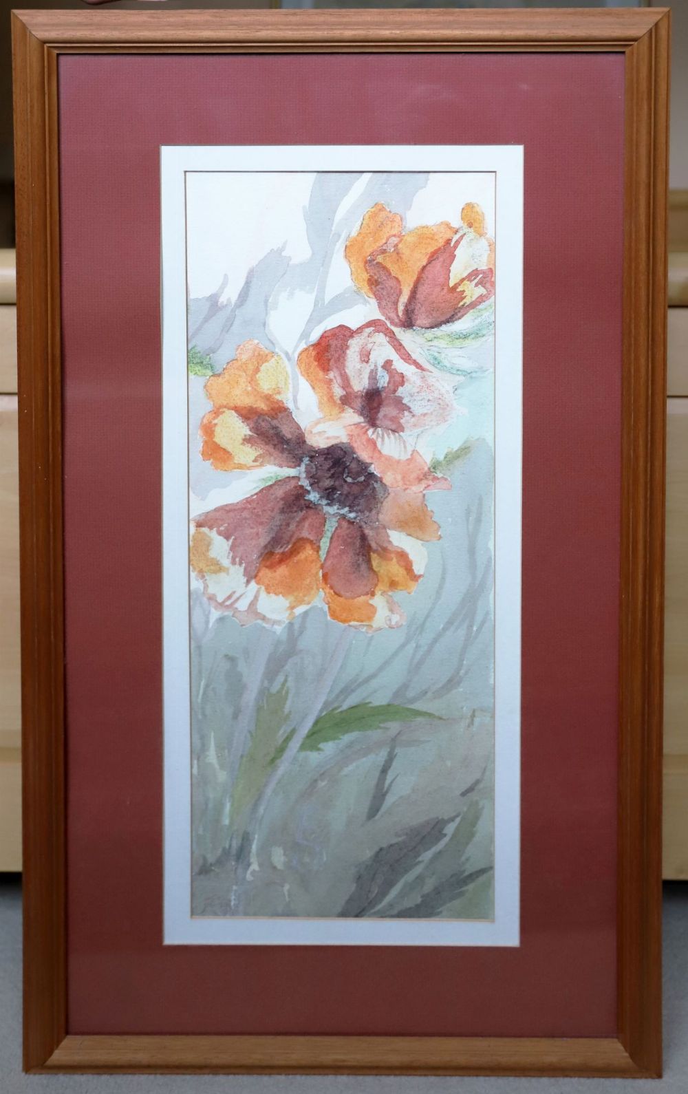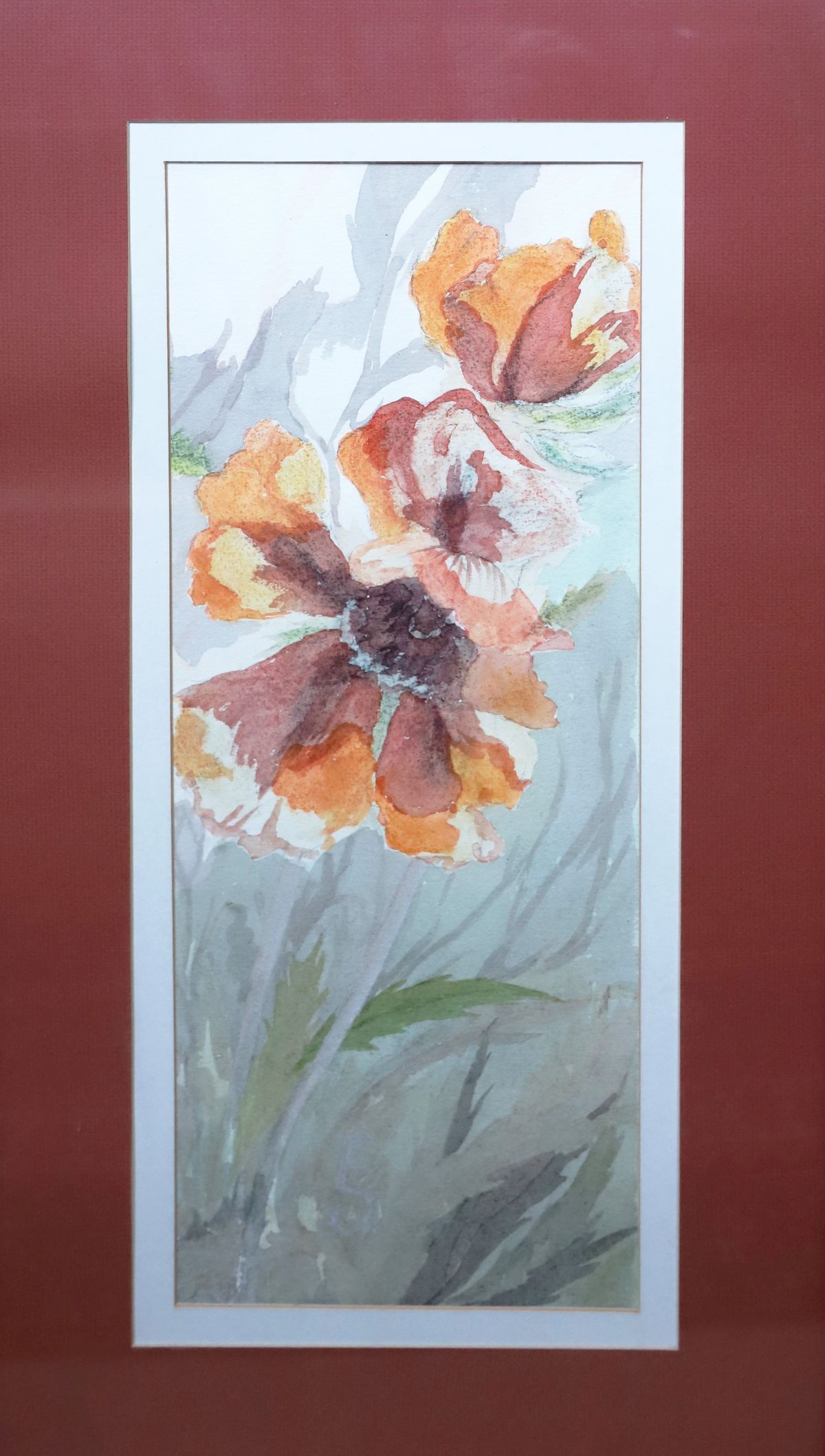 Watercolour still life depicting a flowering bloom rendered in warm ochre and earthy tones, set against a loose, abstract background. Framed.