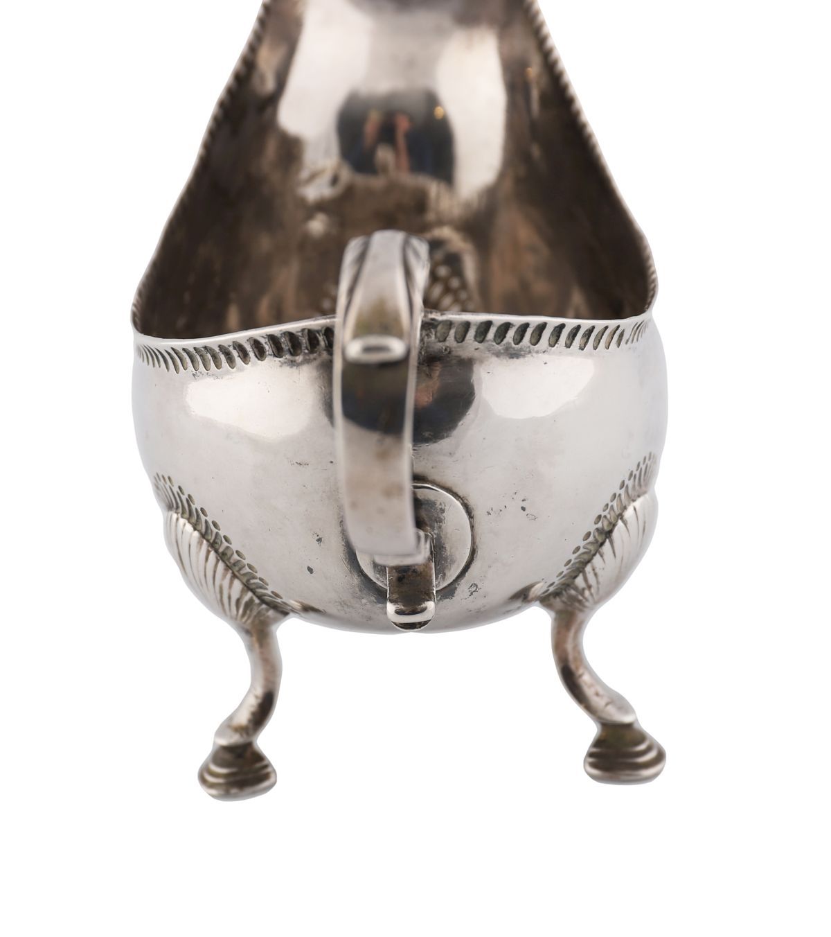 A George IV Irish silver sauce boat by Matthew West, of oval form with beaded rim, leaf-capped double scroll handle, and standing on three hoof feet. Weight 131g