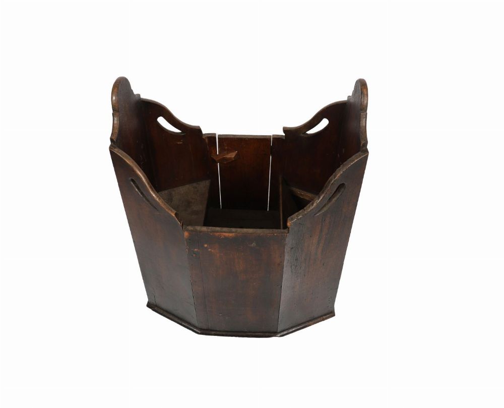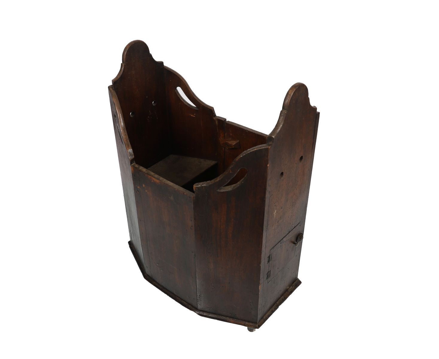 An 18th- to early 19th-century oak child's warming seat, of hexagonal form with hinged panels and ventilation holes to the base. Circa 1800.