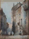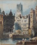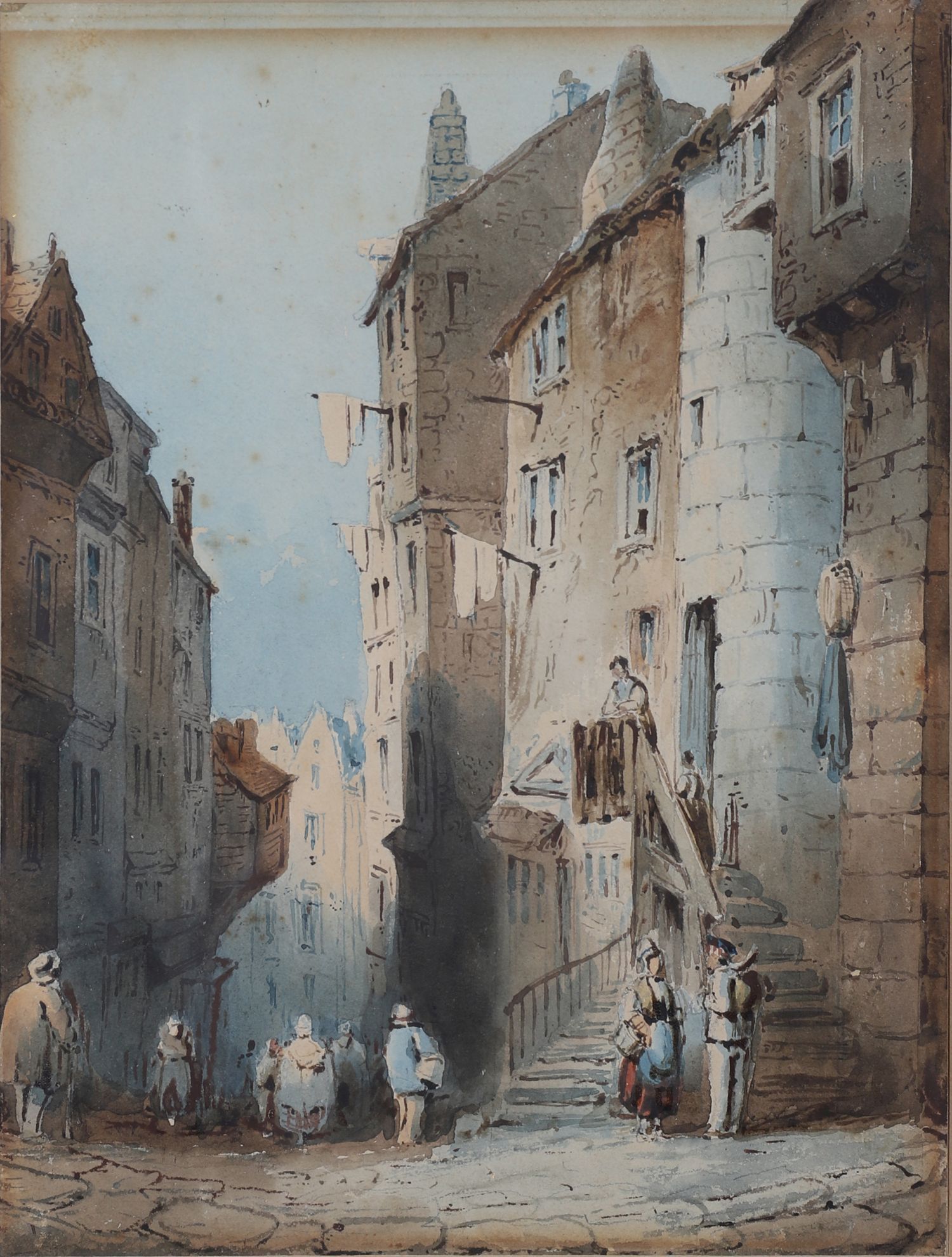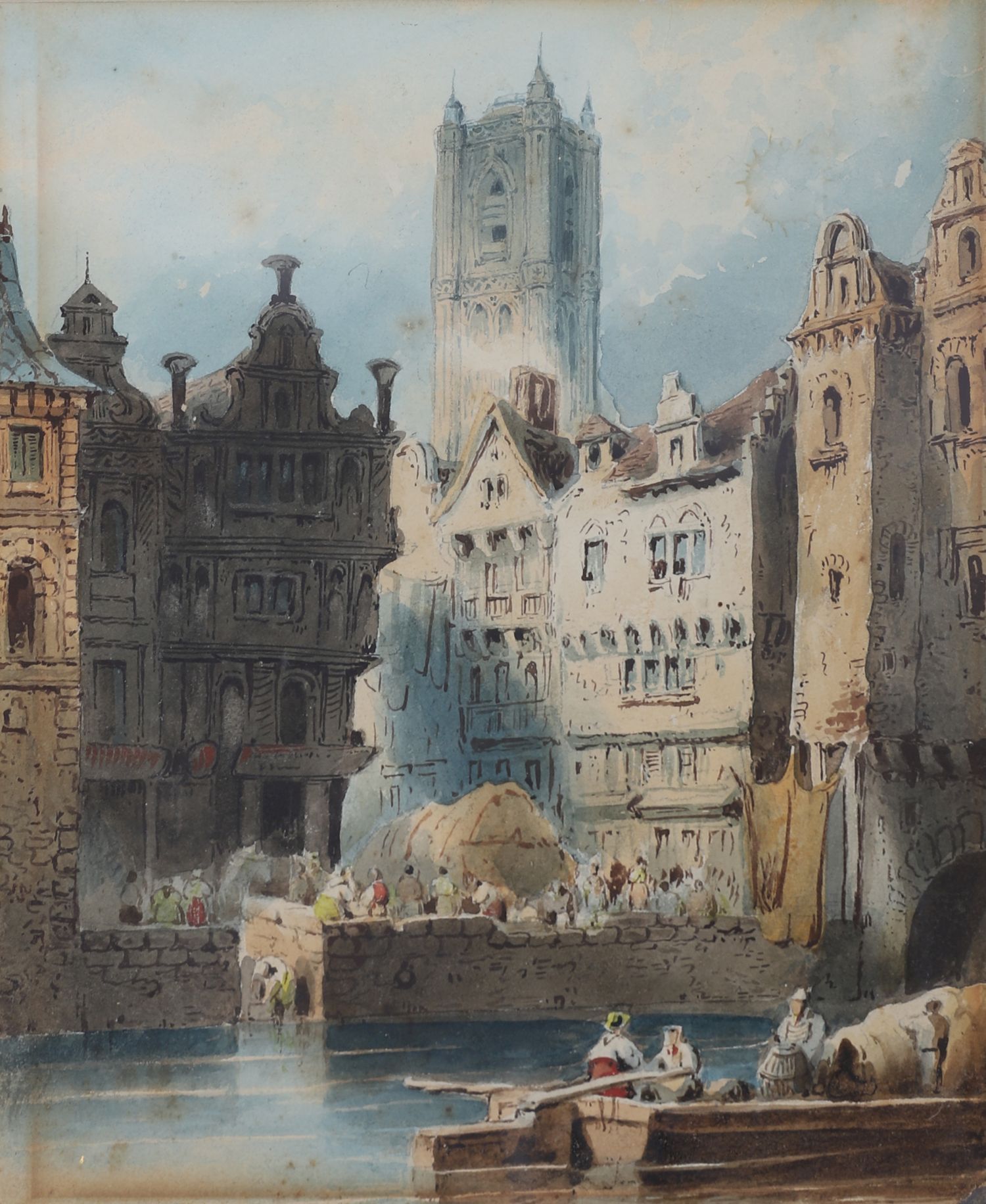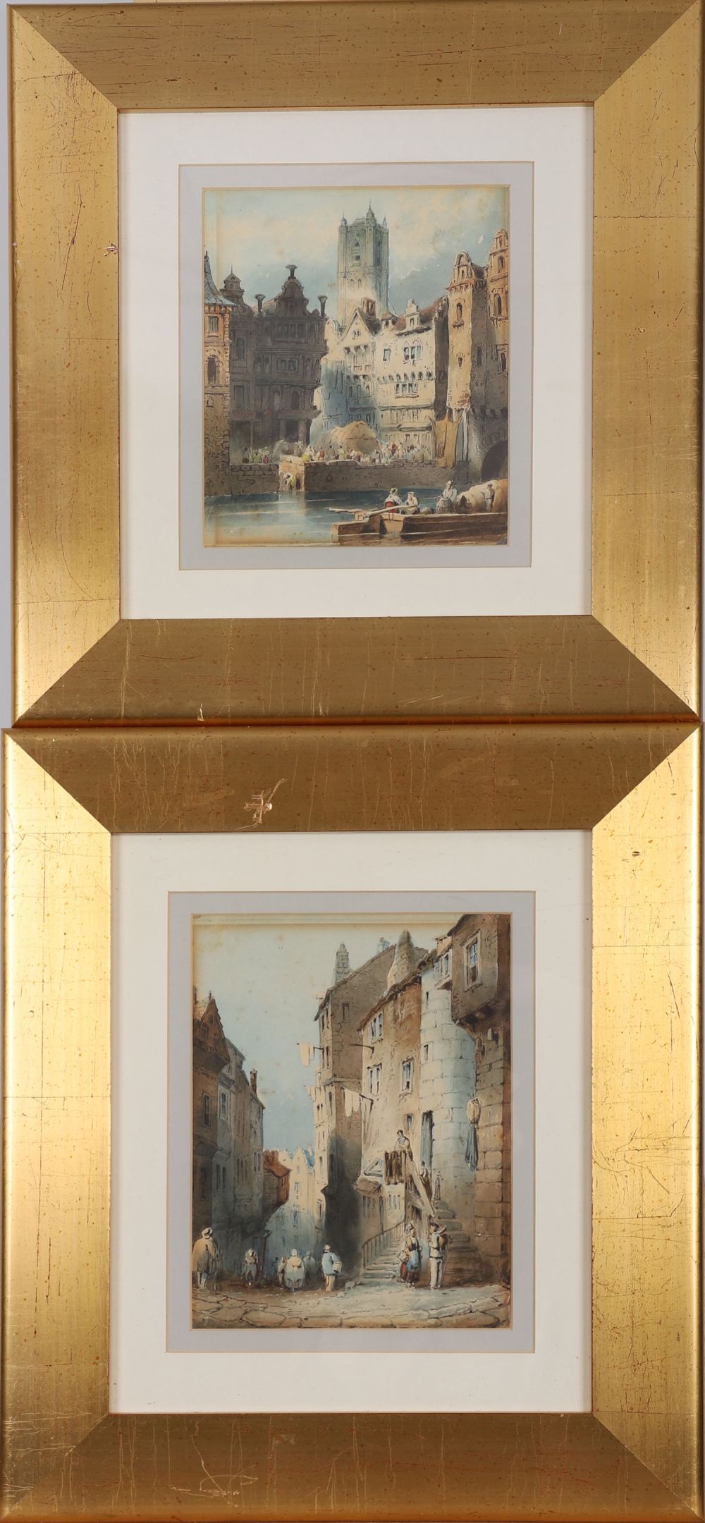 A pair of finely executed 19th century watercolours, each depicting Continental town and architectural views with figures in the foreground. Both mounted and framed in matching gilt frames. Watercolour.