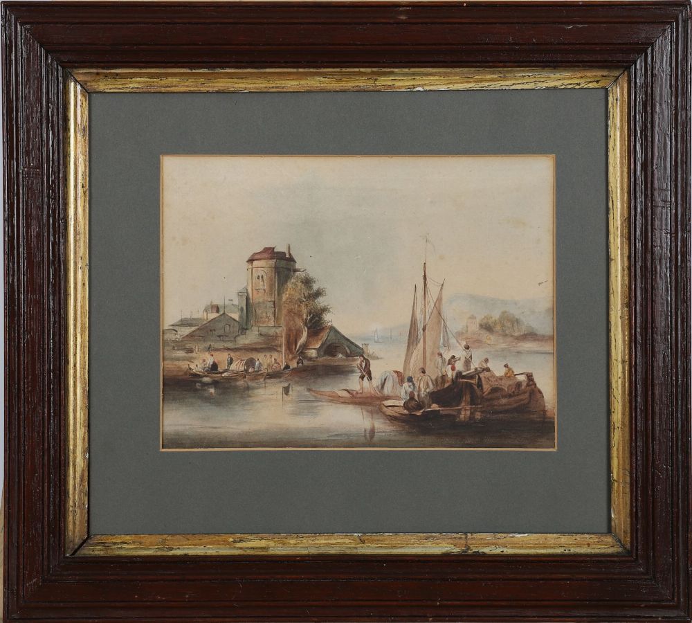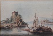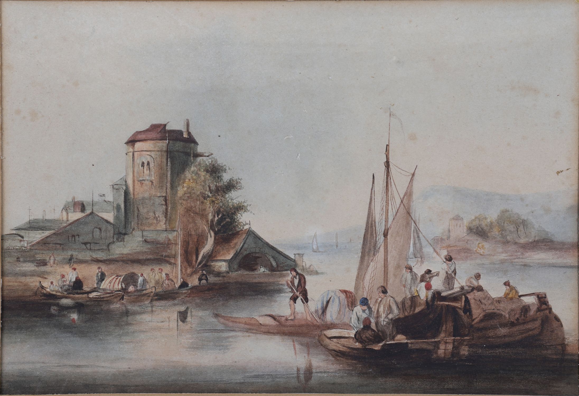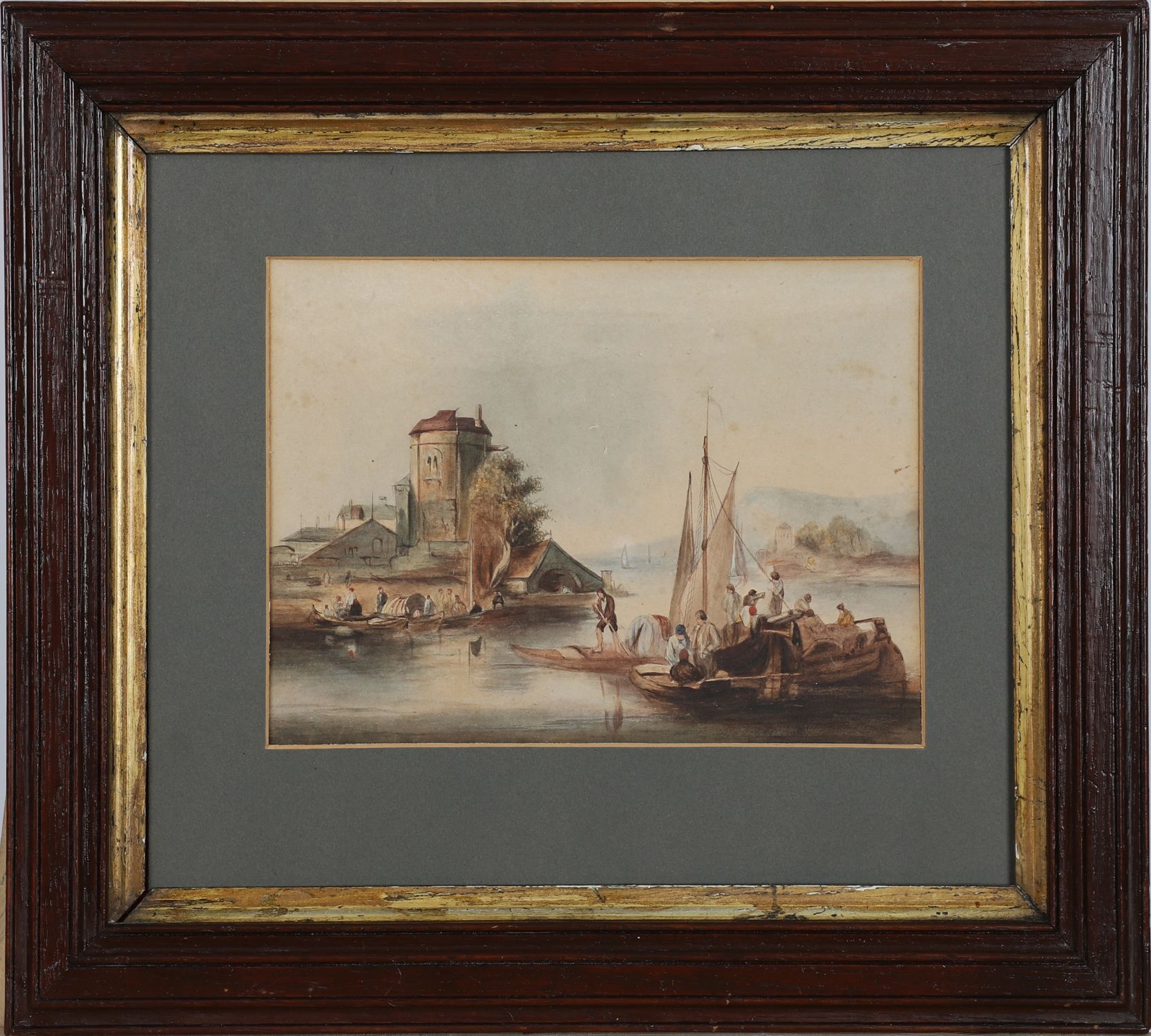A 19th century watercolour depicting figures, boats, and a riverside tower, rendered in muted tones. Framed and glazed. Watercolour.