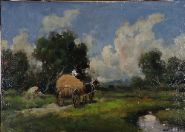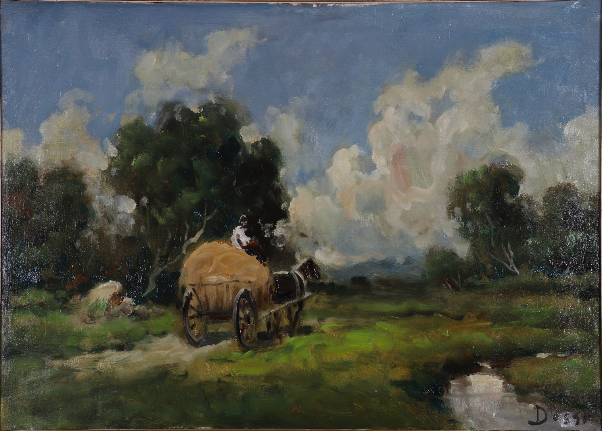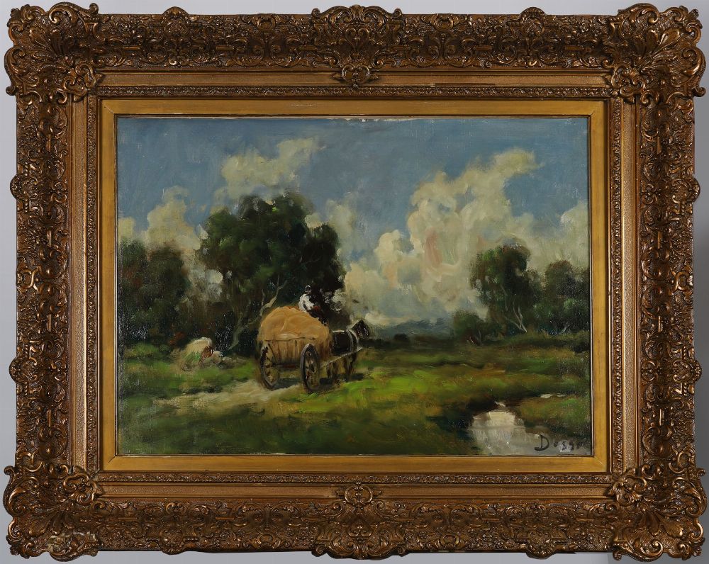 Oil on canvas depicting a horse-drawn hay cart crossing a verdant field, beneath a wide sky. Signed lower right (unverified). Presented in a decorative gilt frame. Oil on canvas.