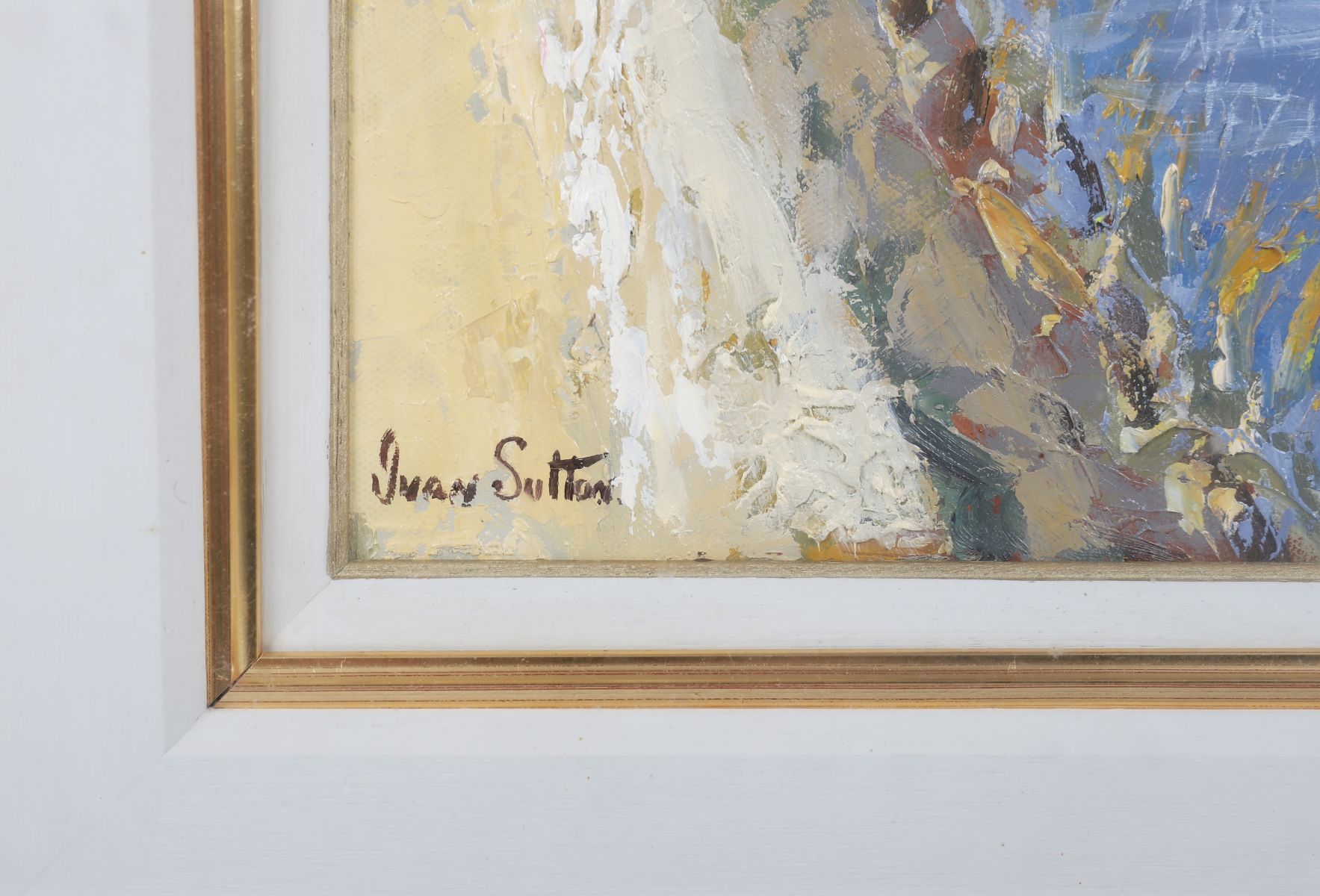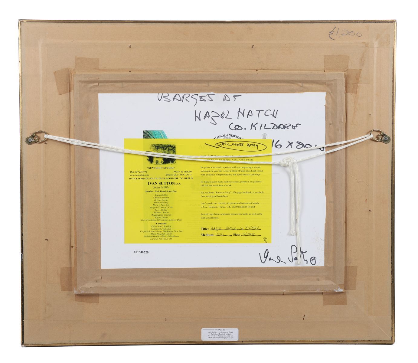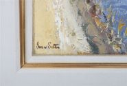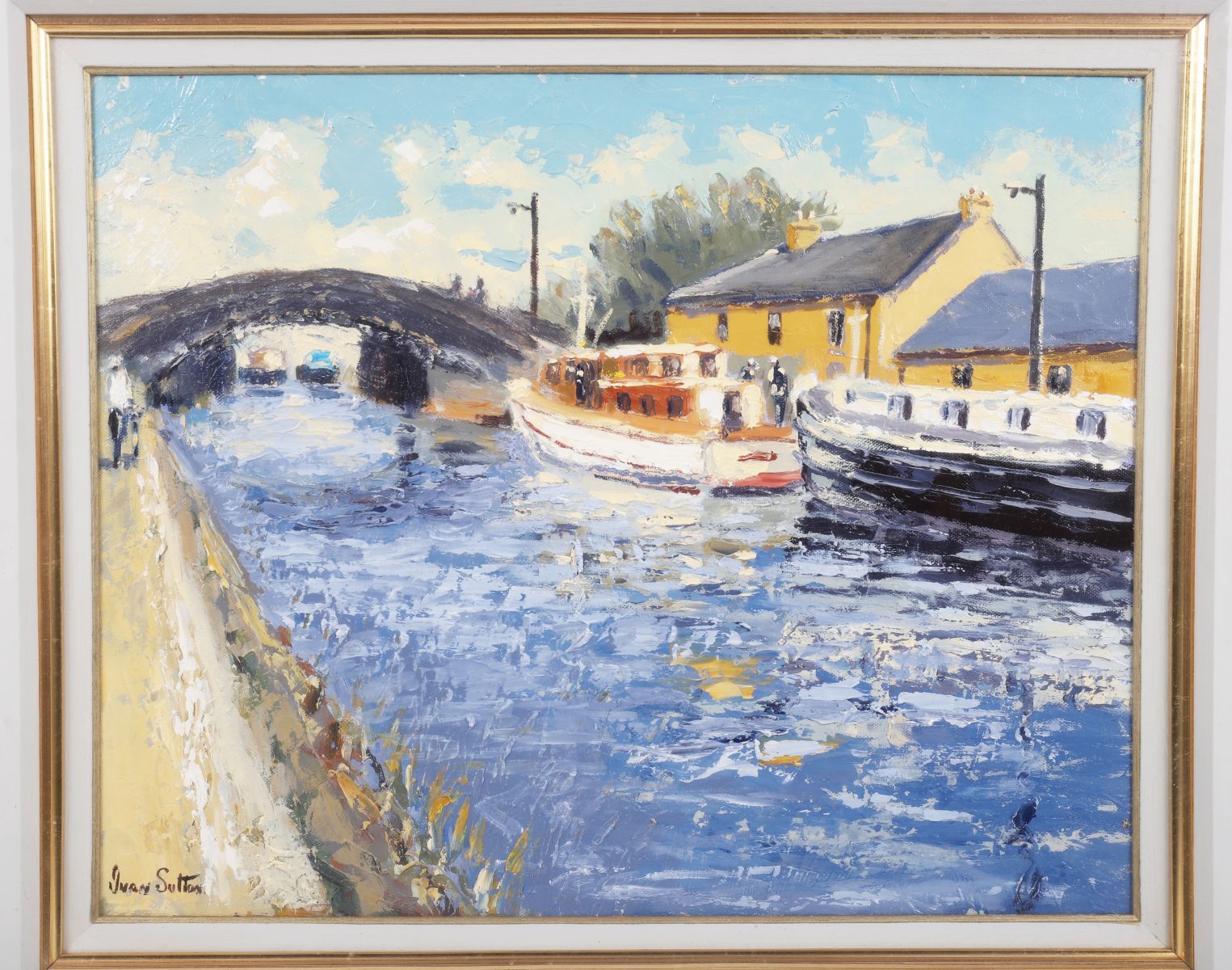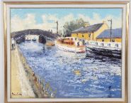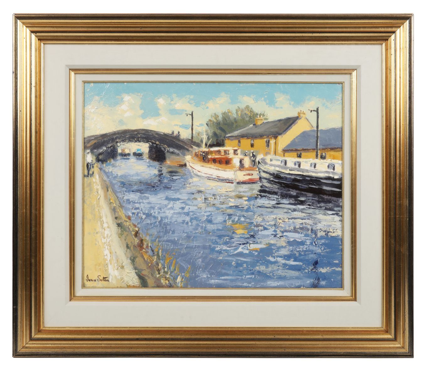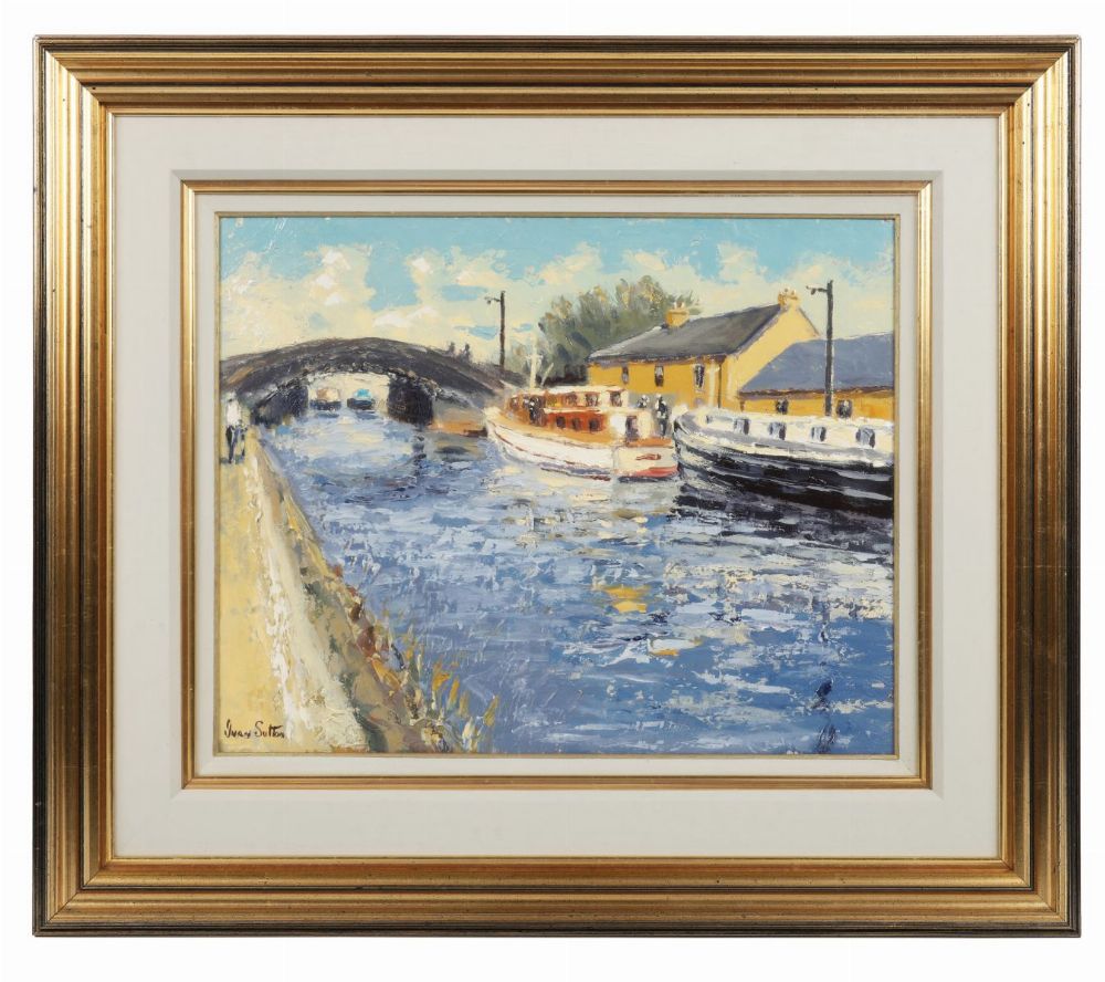 Depicting canal barges moored along the Grand Canal at Hazel Hatch, County Kildare, this work displays Sutton’s characteristic textured brushwork and tonal harmony. The warm yellows and soft reflections on the water evoke a tranquil, atmospheric study of inland waterways. Signed lower left. Framed.