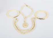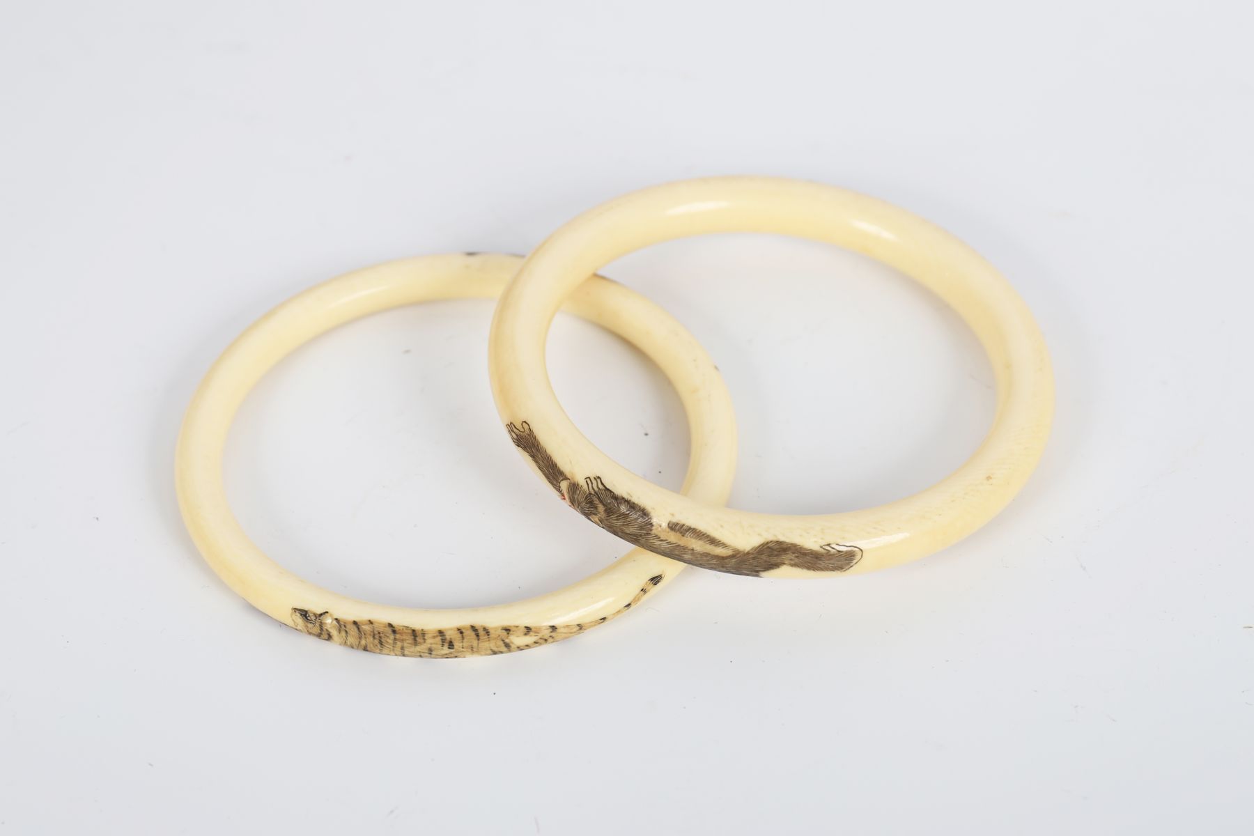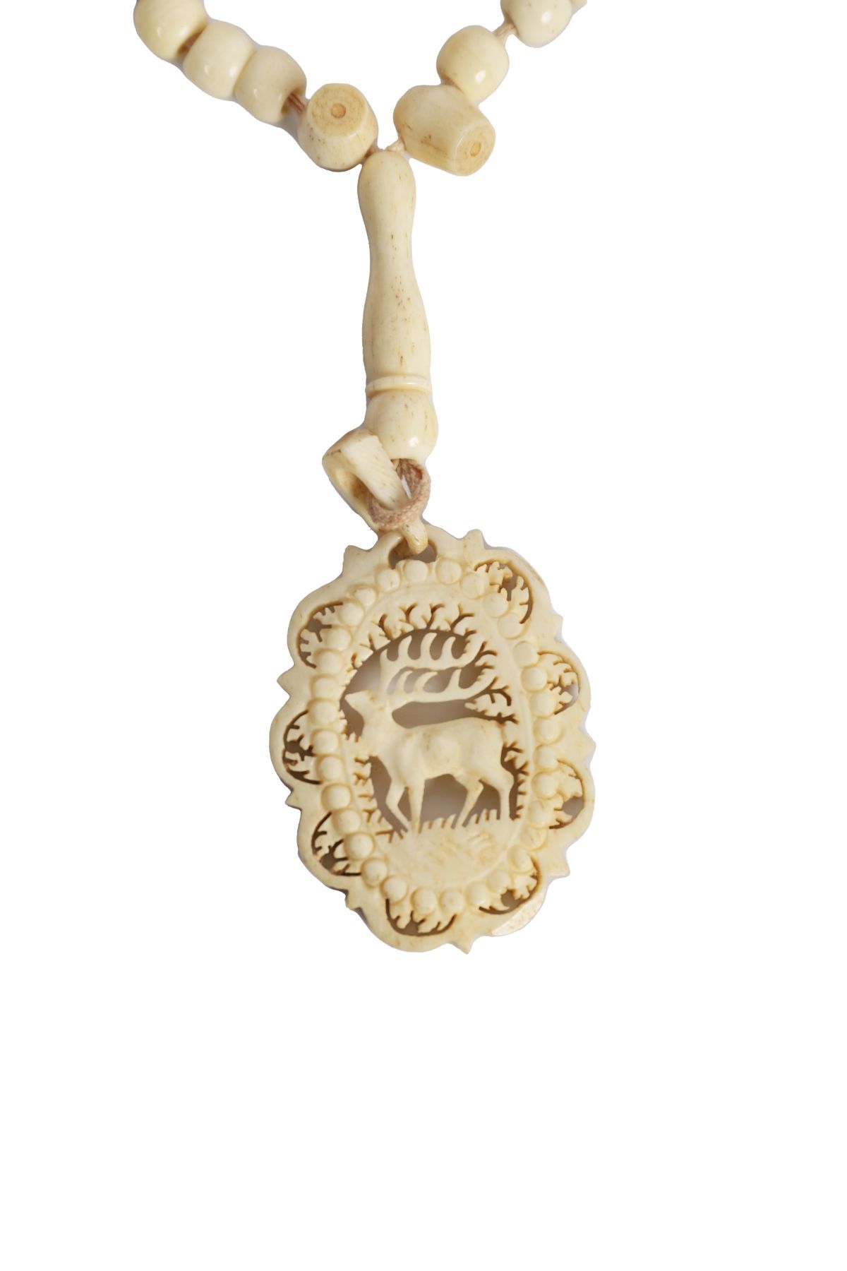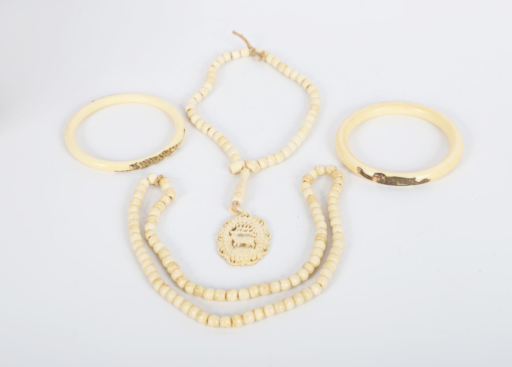 A group comprising an ivory bead necklace with finely carved oval pendant depicting a stag beneath a tree, together with a second necklace and two ivory bangles. Each bangle delicately decorated with miniature painted figures — one of a tiger, the other a monkey. Presented in a fitted case.