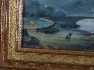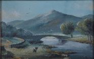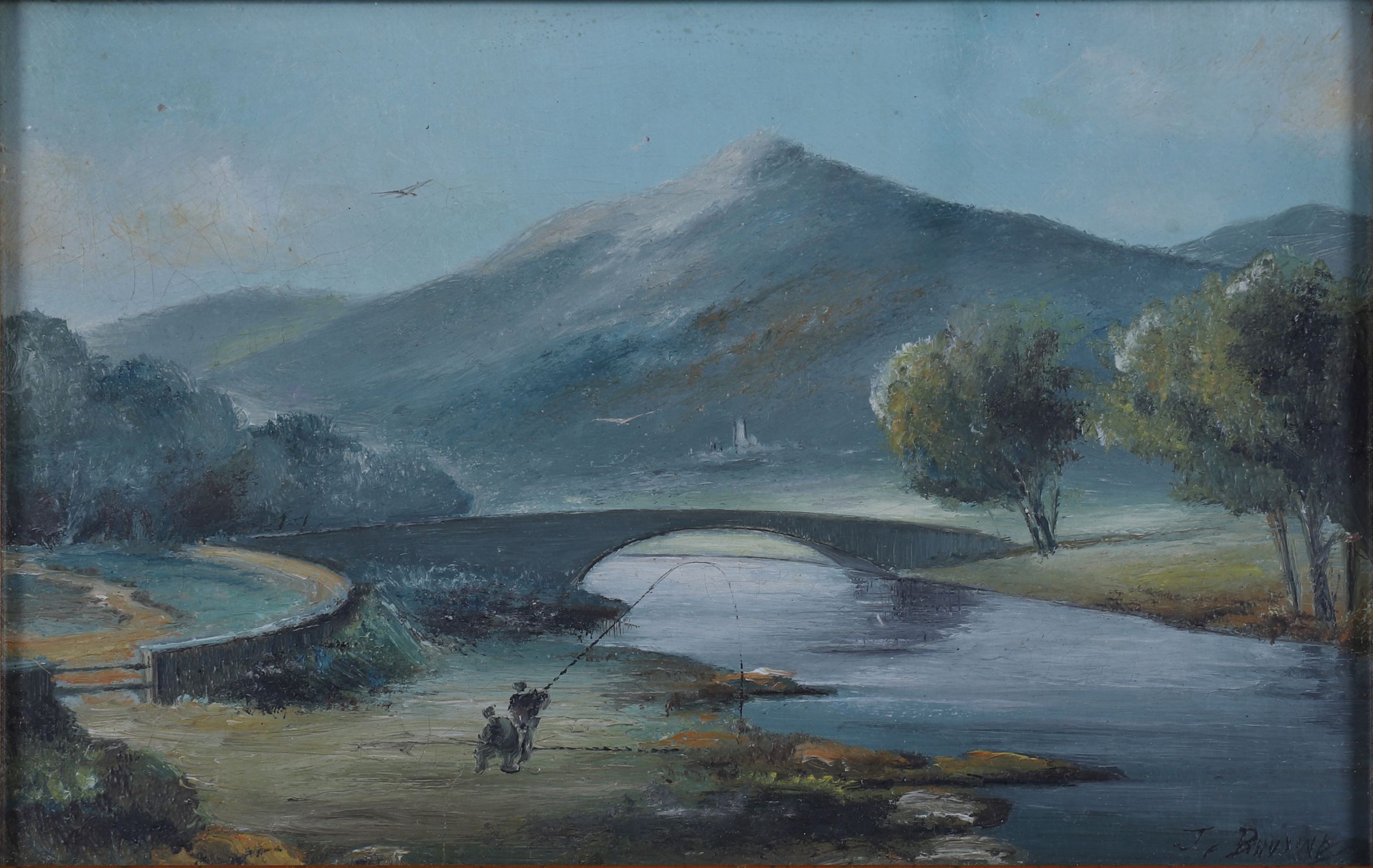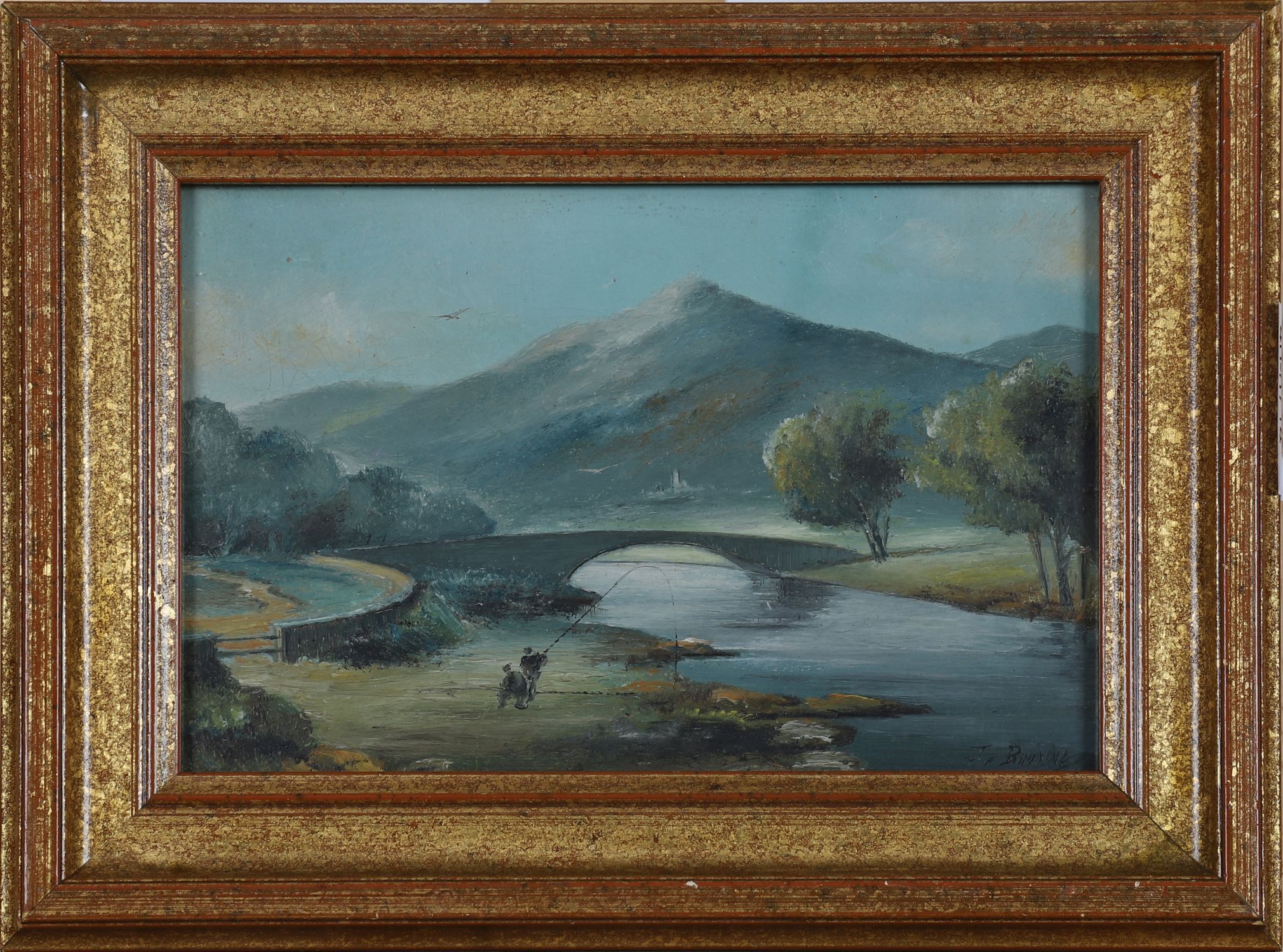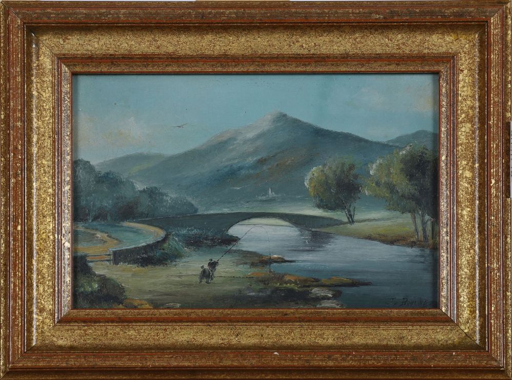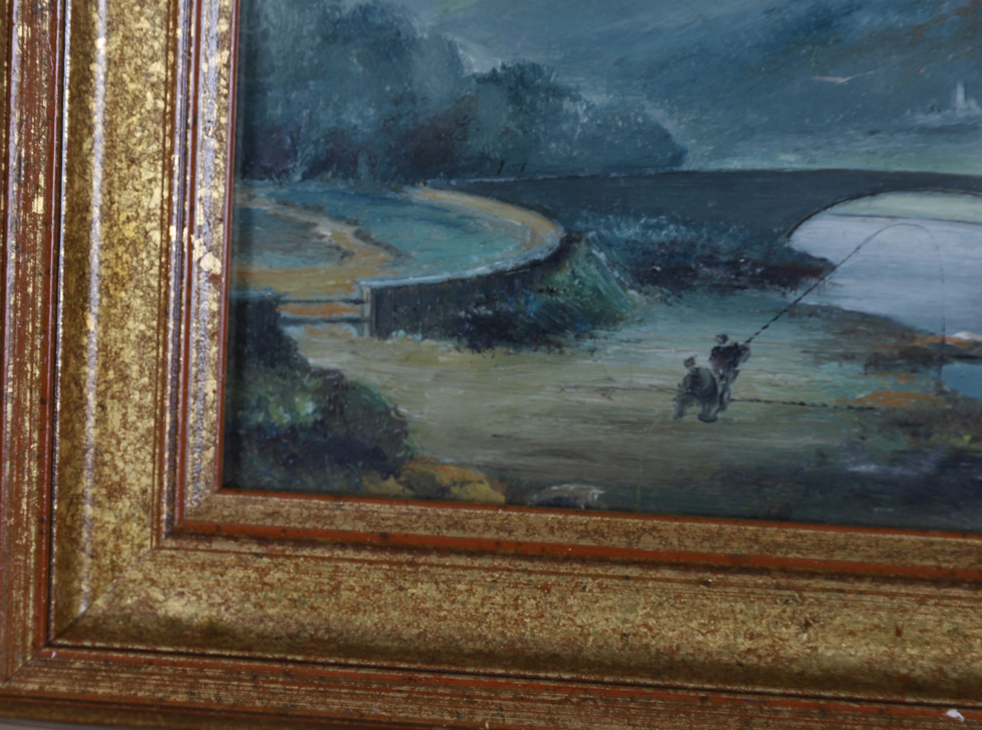 A river landscape with arched stone bridge and fisherman in the foreground, signed lower right. Presented in gilt frame. Oil on card.
