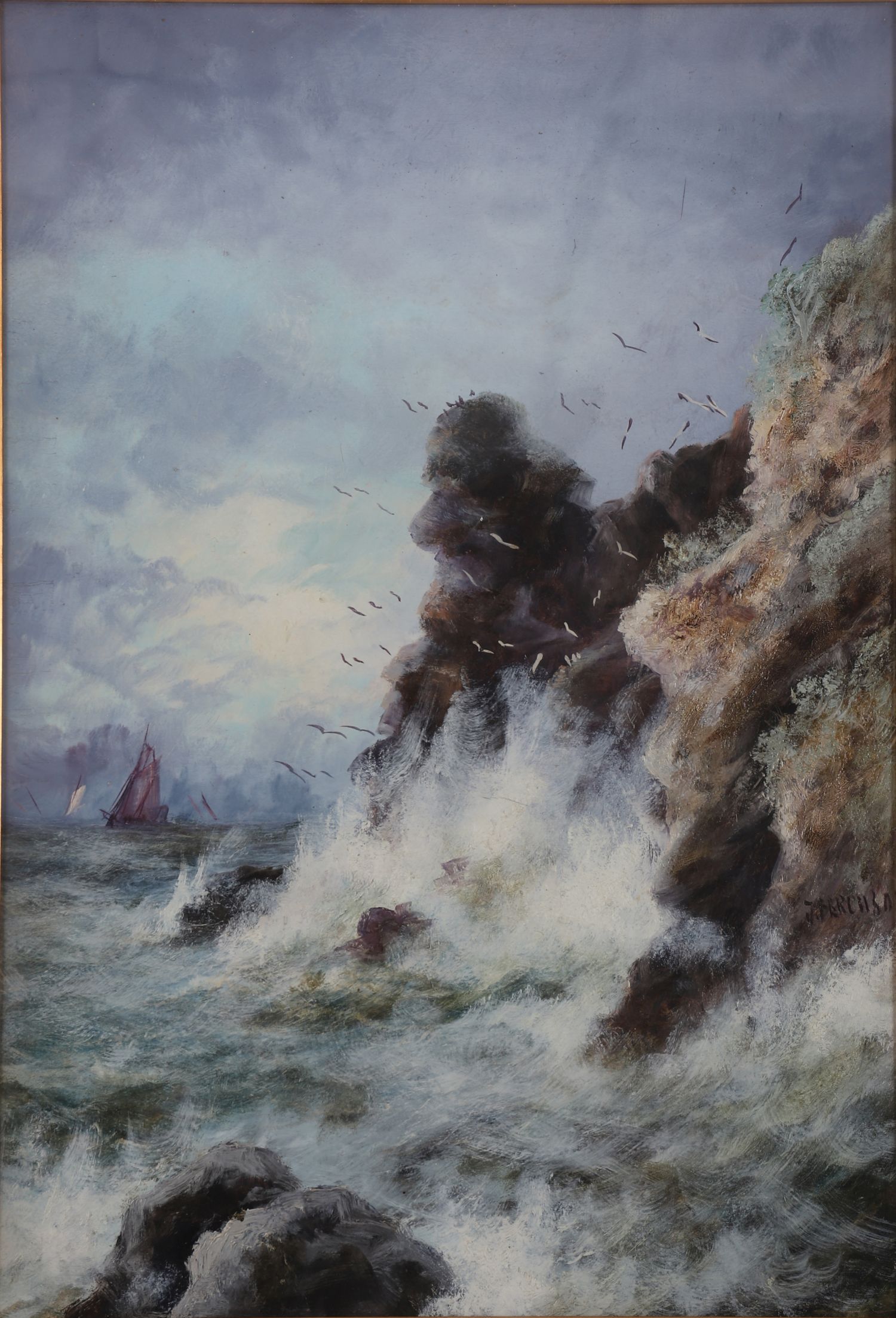 Lot 1330 J. FERGUSON, BREAKING WAVES AND SAILING SHIP