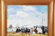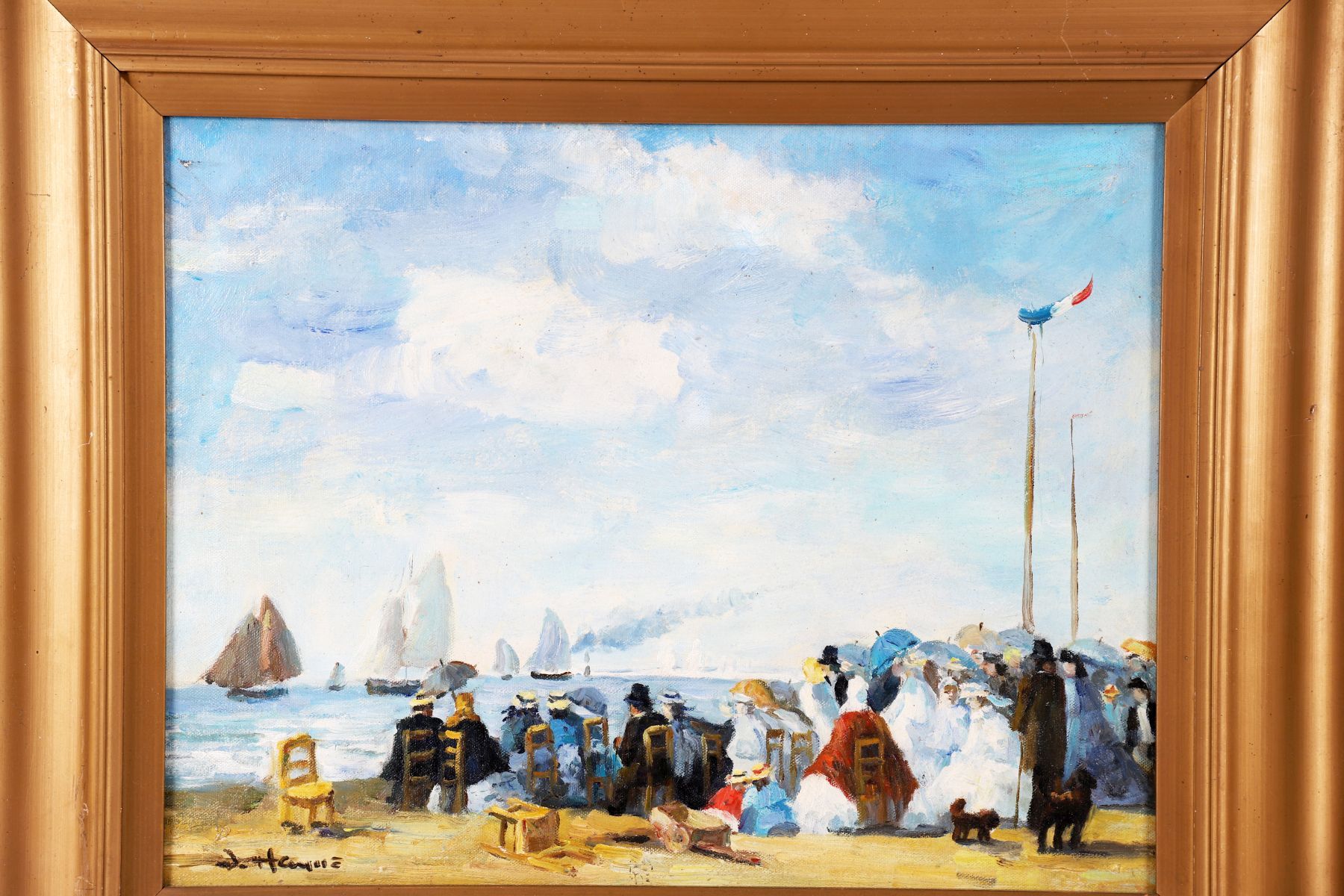 Oil on canvas depicting figures seated along a shoreline with sailing vessels beyond, signed J. HAMIZ lower left, framed.