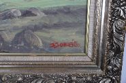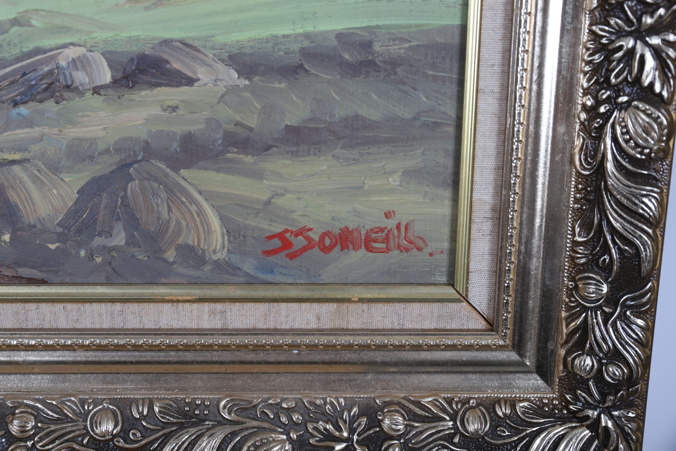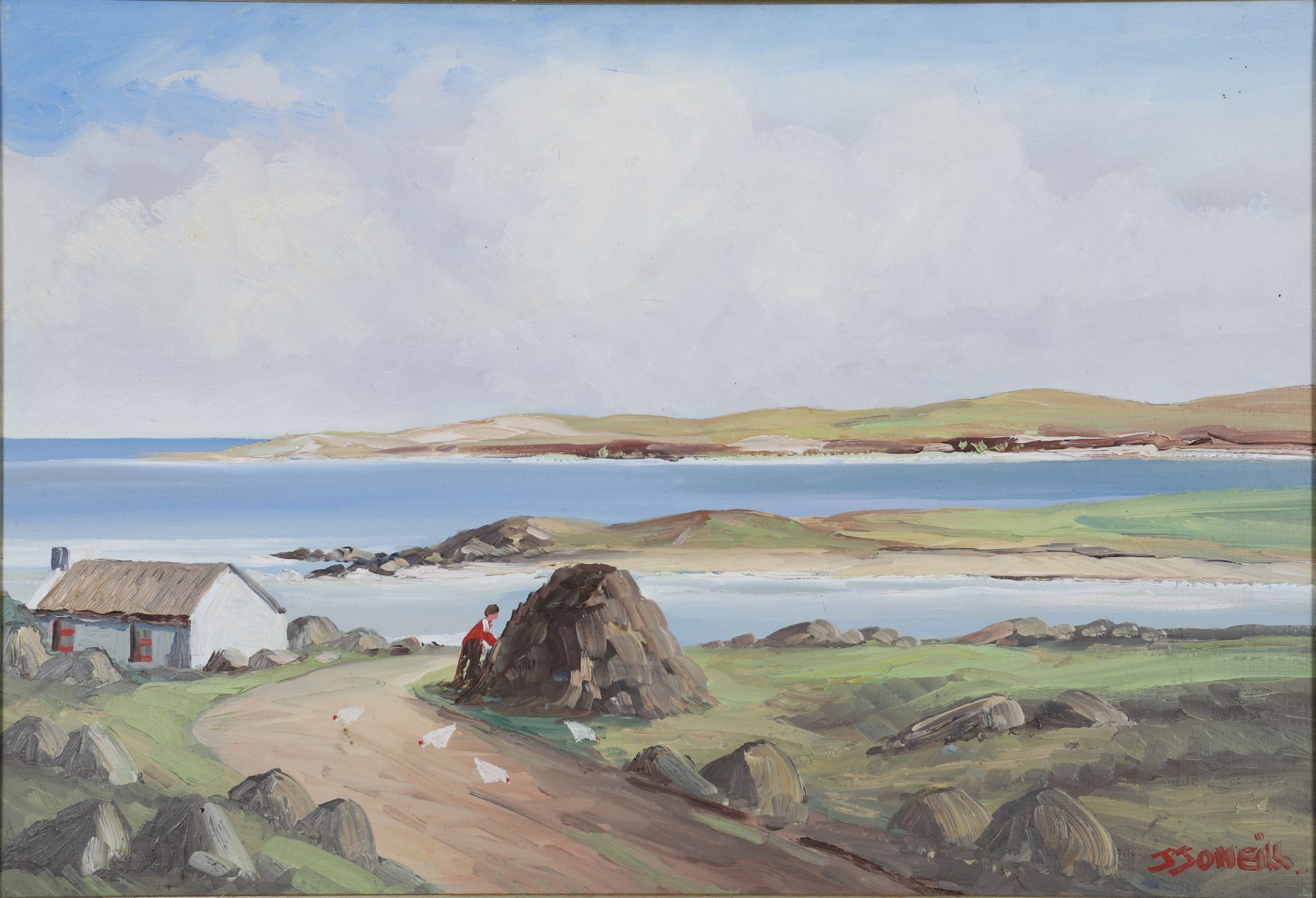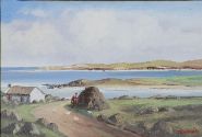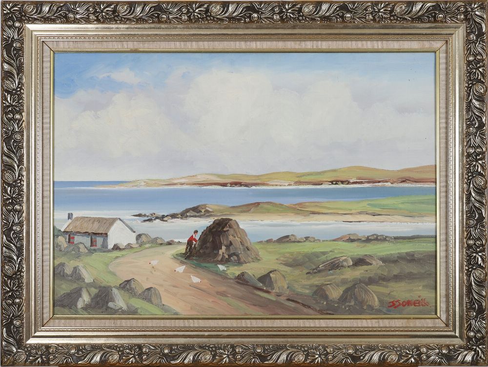 Rugged west of Ireland coastal landscape with cottages, signed oil on canvas, framed.