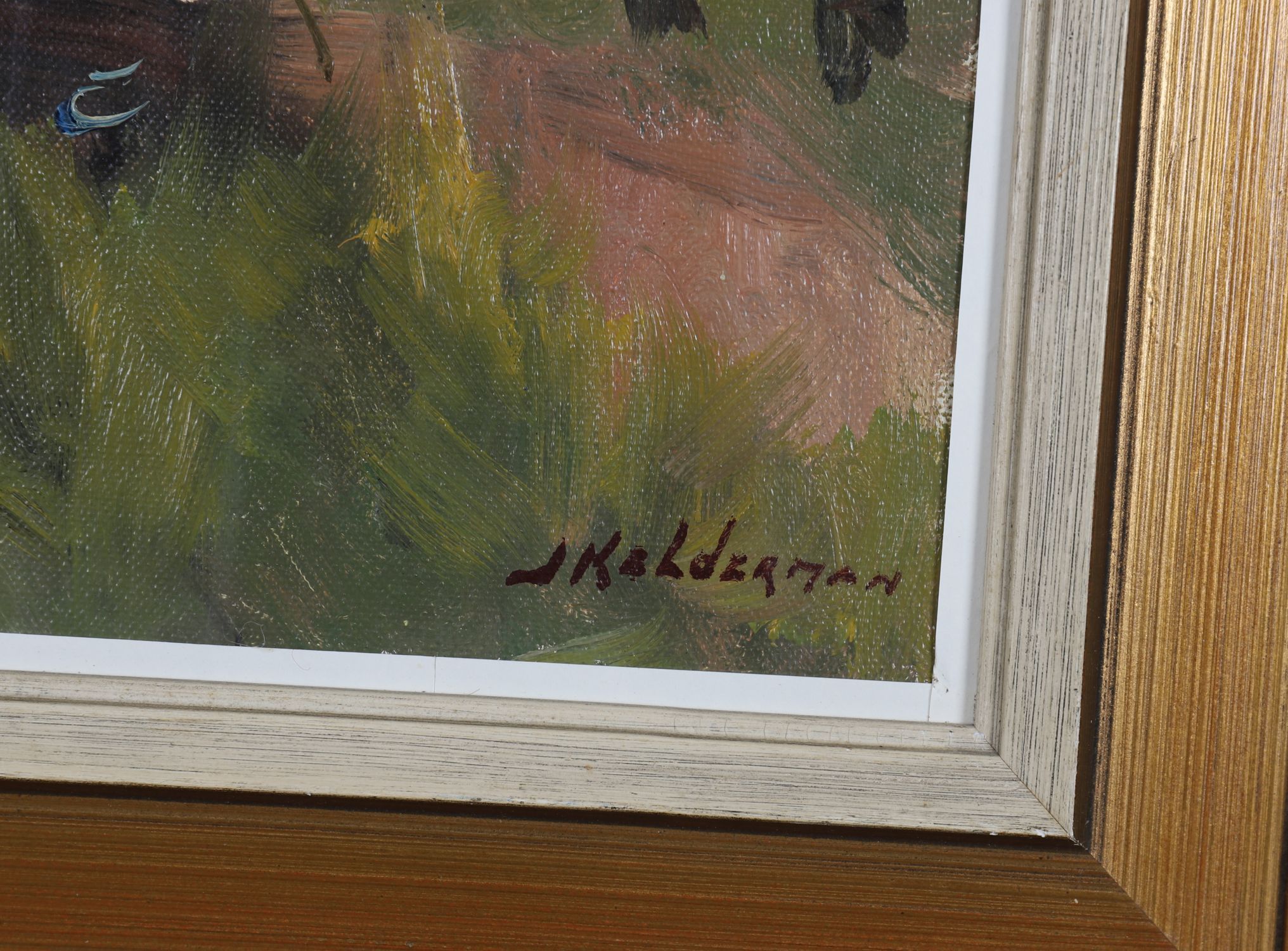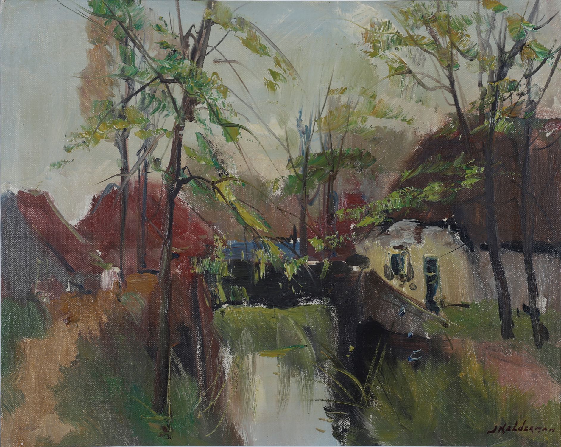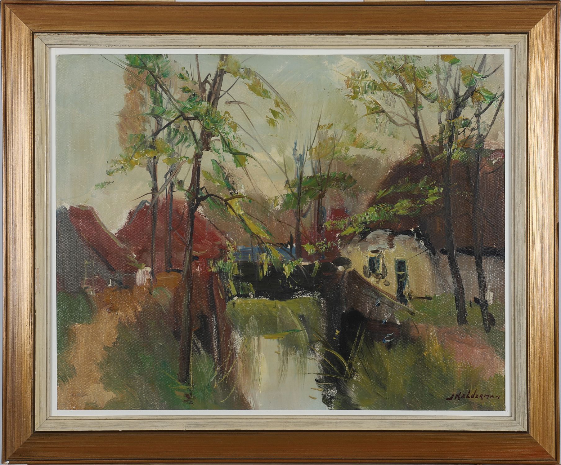 Oil on canvas, showing a village canal scene with trees and houses, executed in bold impressionist brushwork. Signed lower right. Framed. Oil on canvas.