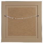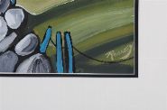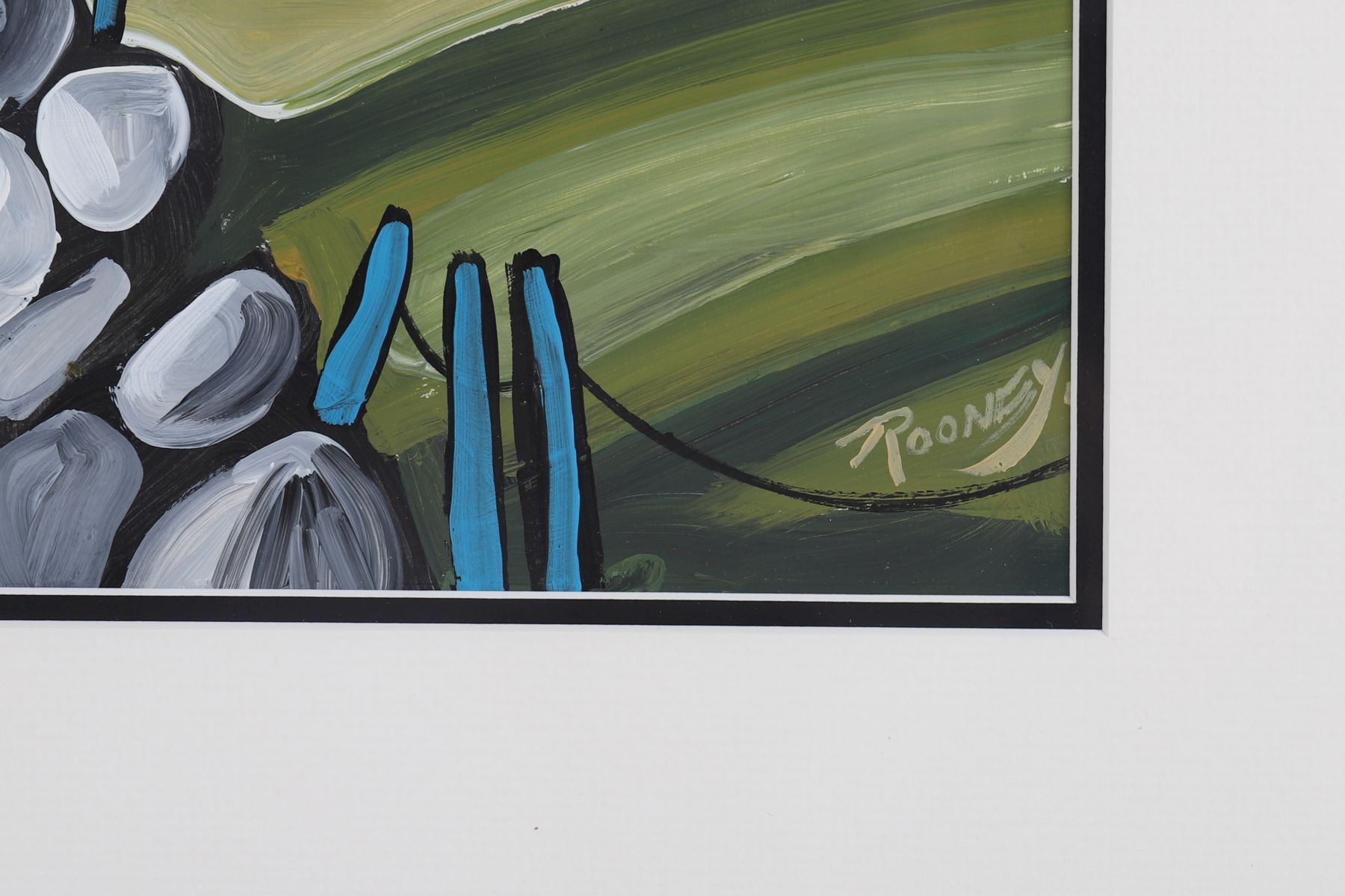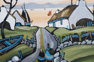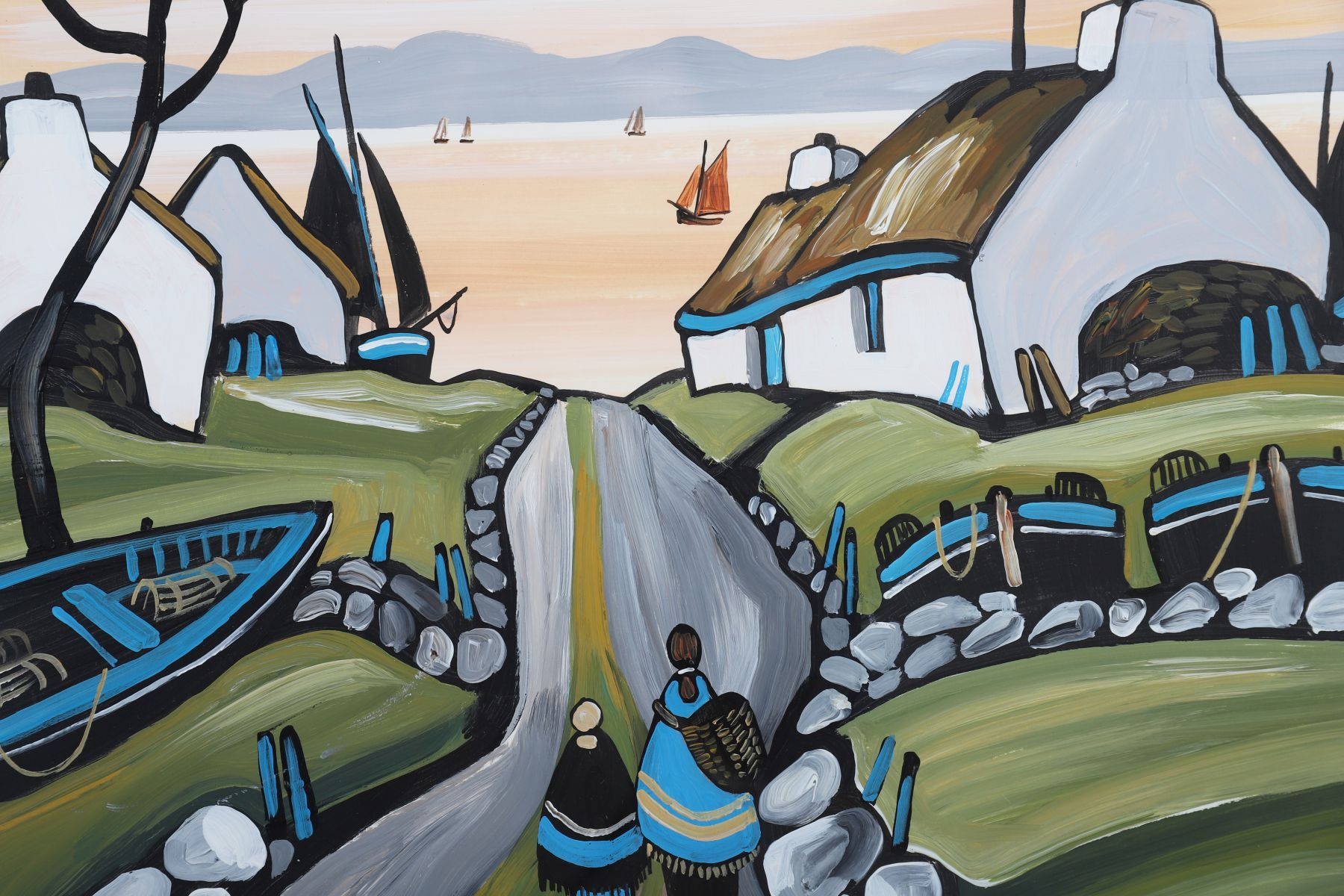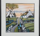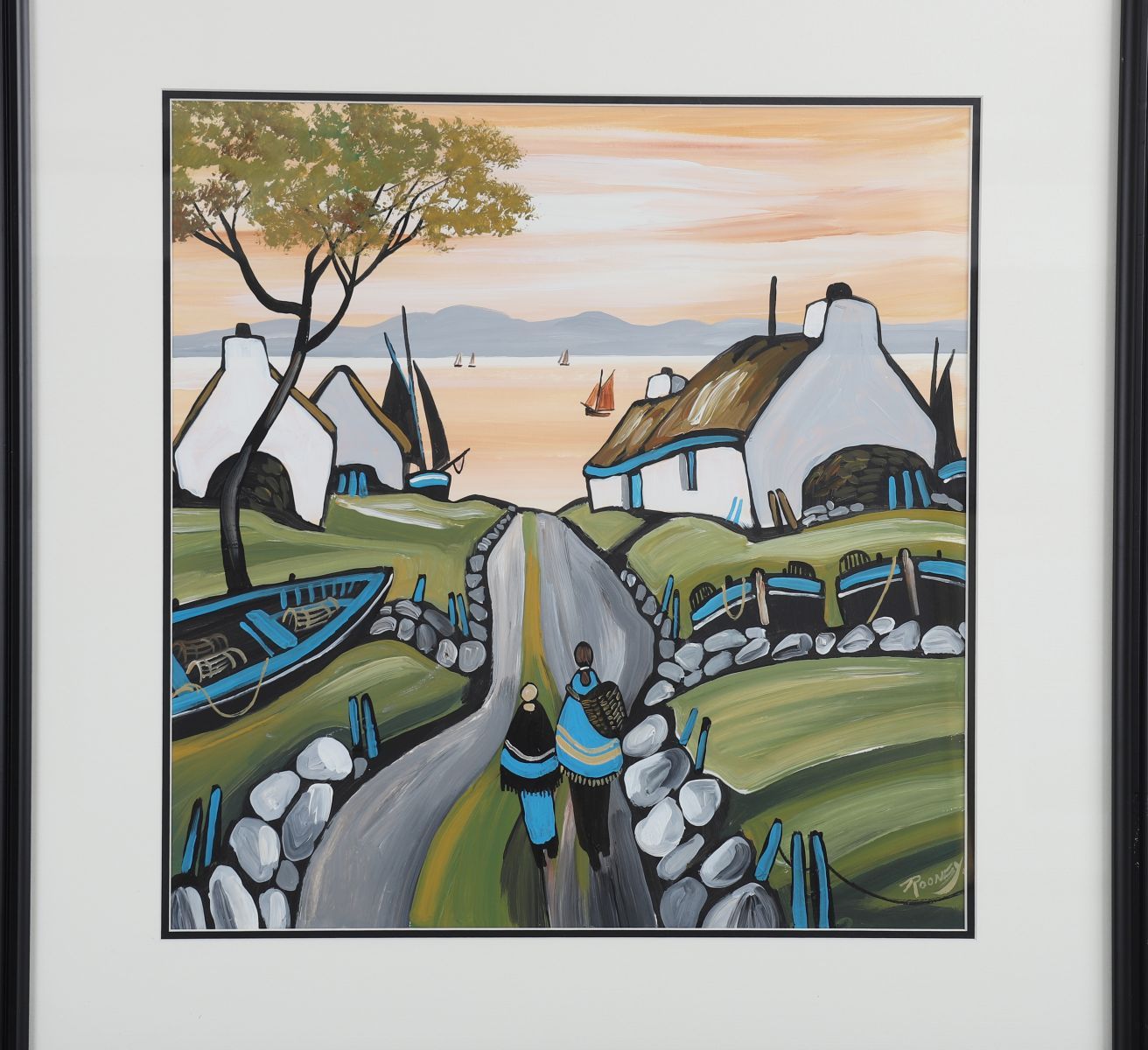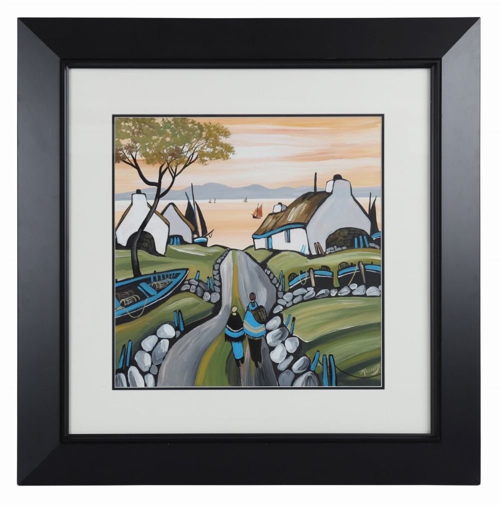 A stylised rural coastal scene depicting two figures in traditional shawls walking along a country road leading towards the sea. Flanked by whitewashed cottages, boats and stone walls, the composition is rendered in Rooney’s characteristic graphic style with strong lines and harmonious muted colours. Signed lower right and framed in a black frame with wide mount.