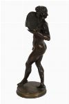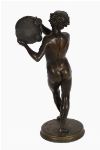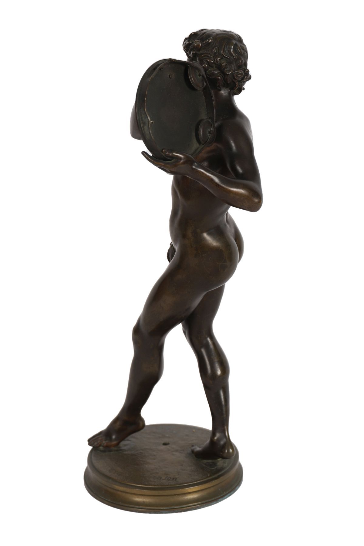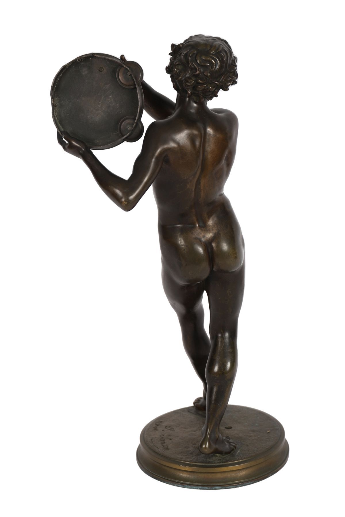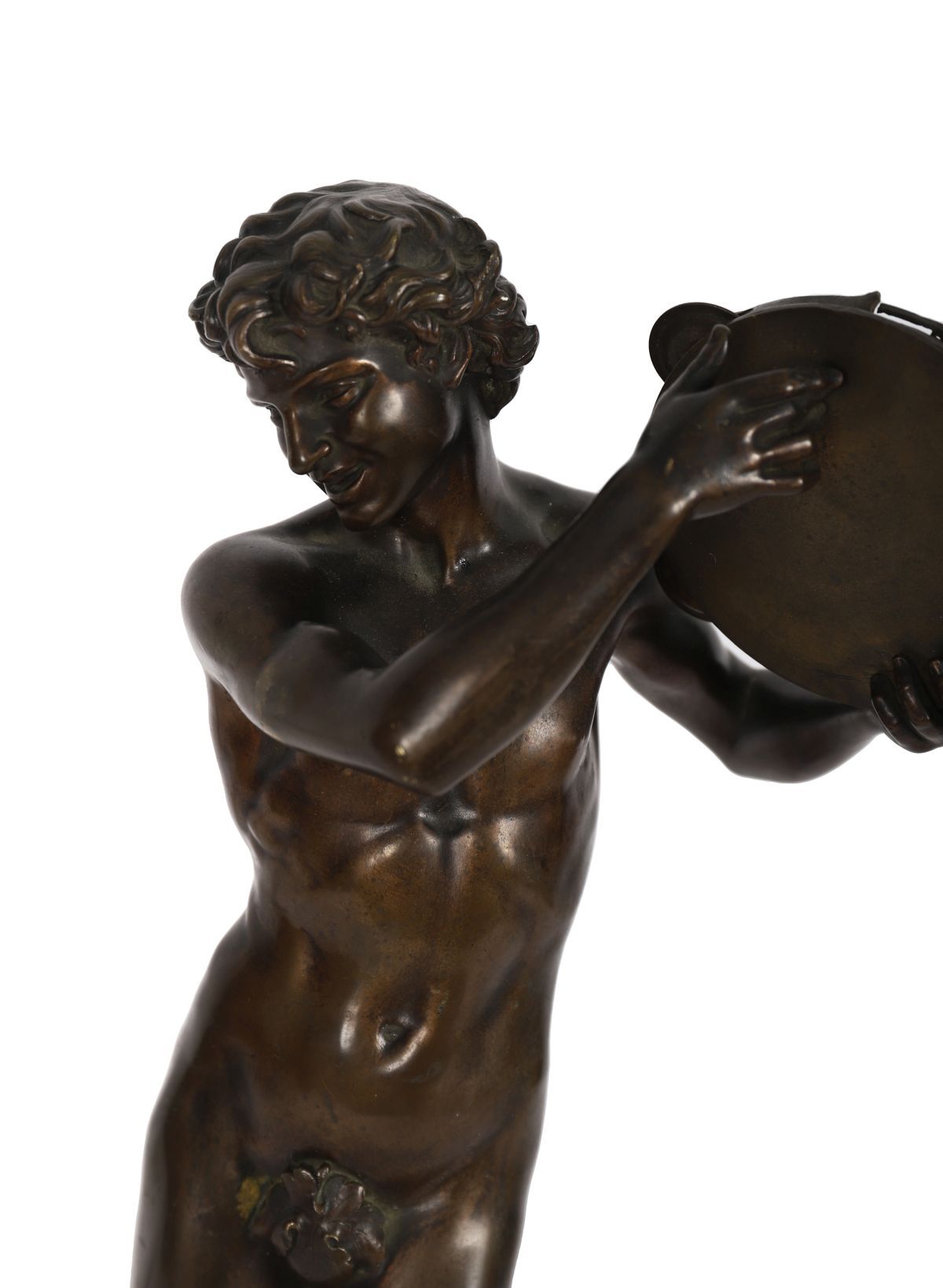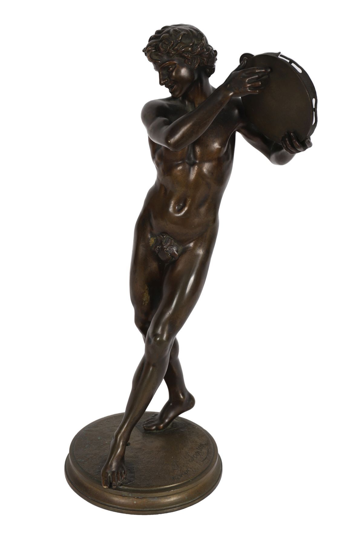 A late 19th-century Italian patinated bronze figure of a classical nude youth depicted in contrapposto, holding a tambourine aloft. The figure finely modelled with strong anatomical definition and expressive movement, raised on a circular base signed J. Samson and inscribed Roma.