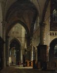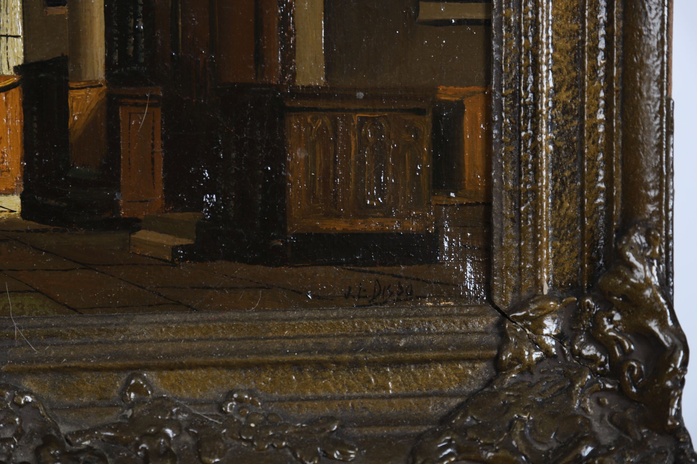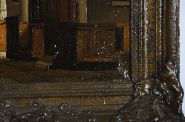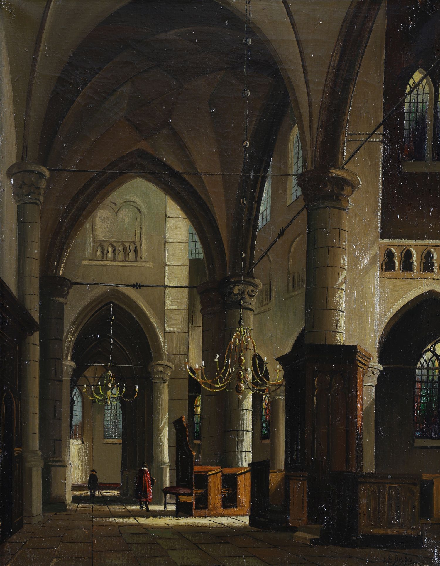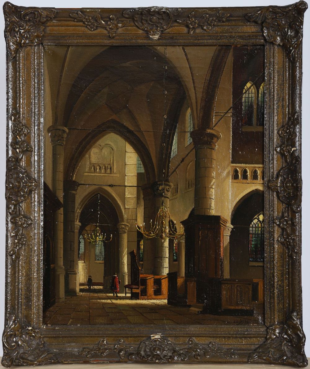An oil painting of a Gothic cathedral interior with vaulted arches, chandeliers, and small figures, signed lower right. In carved gilt frame. Oil on canvas.