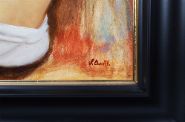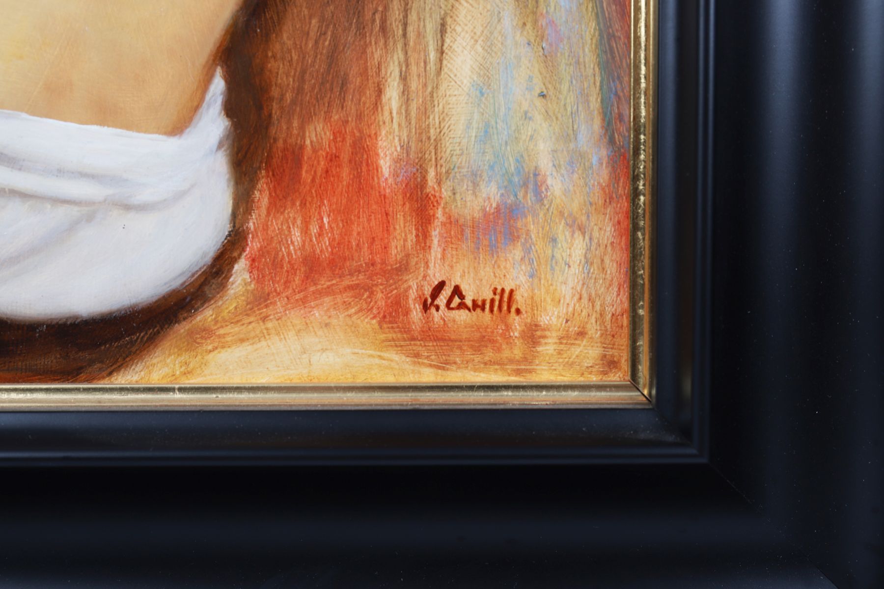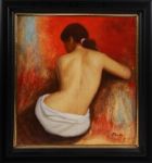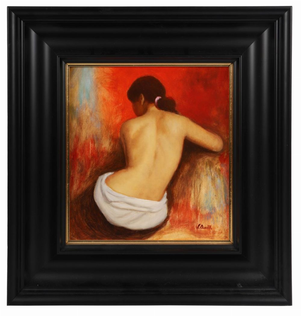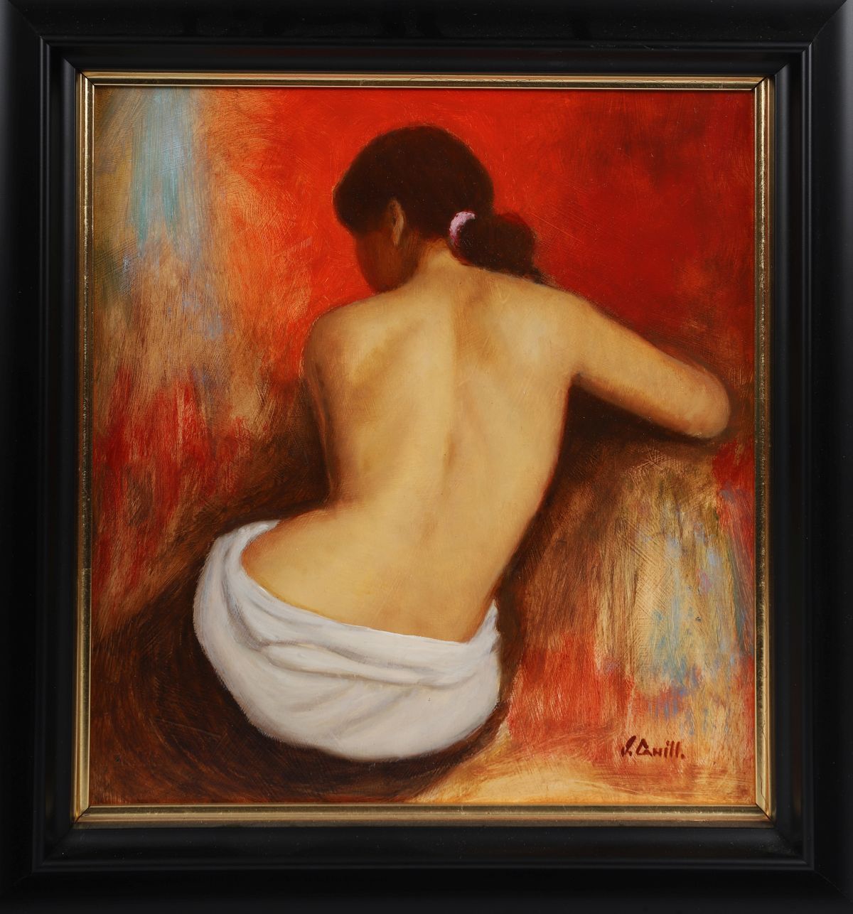 A refined figure study of a seated female nude, rendered with warm tones against a red ground. Cahill’s painterly handling and tonal gradation recall the sensuous classicism of early 20th-century atelier traditions.