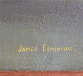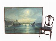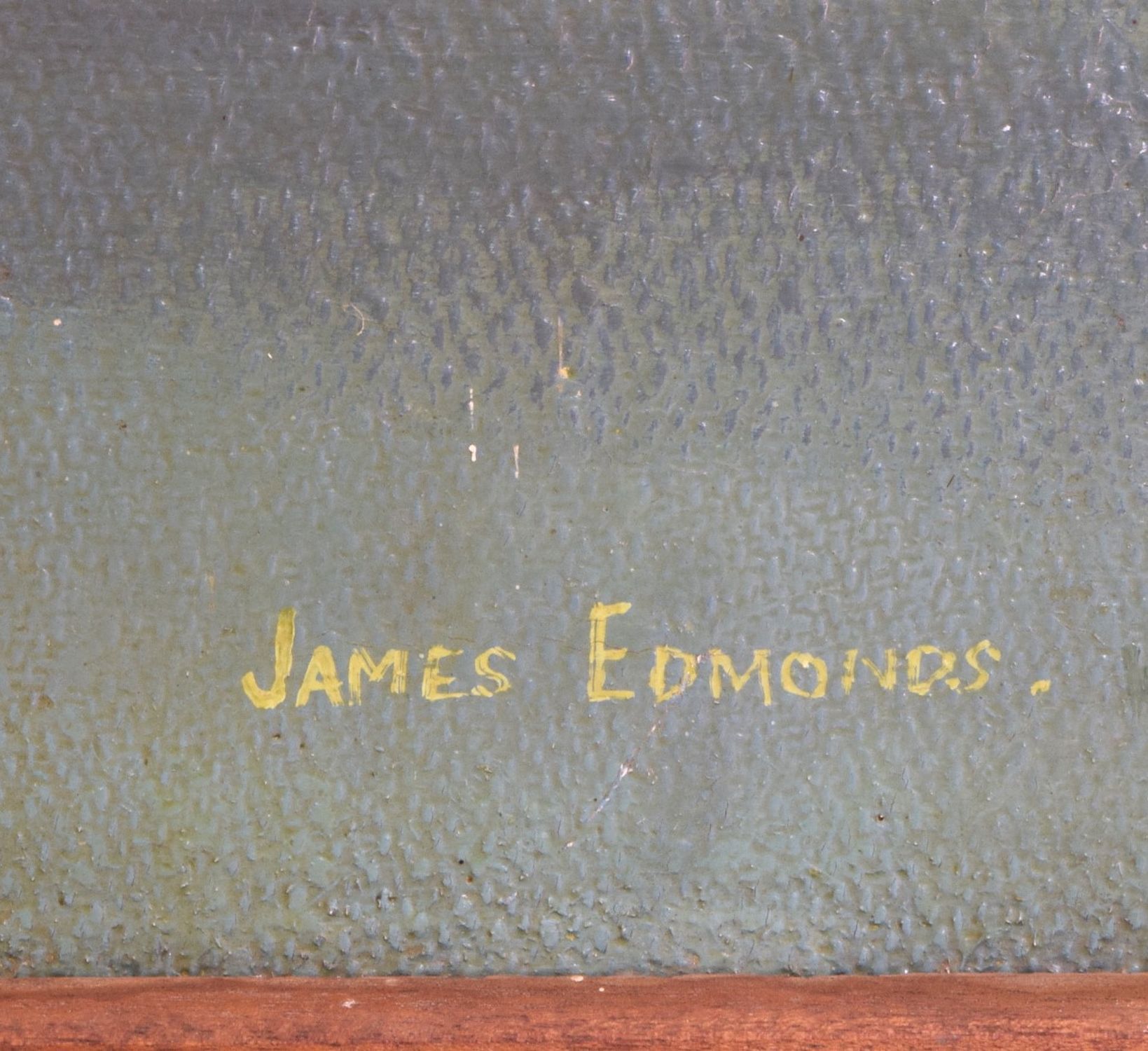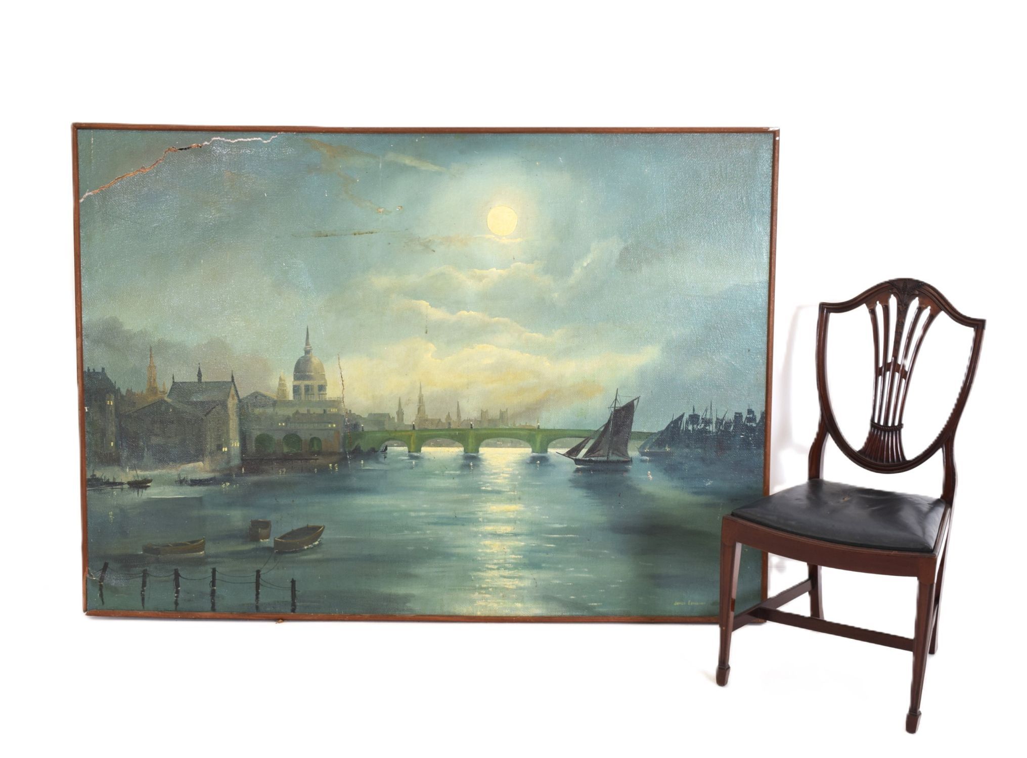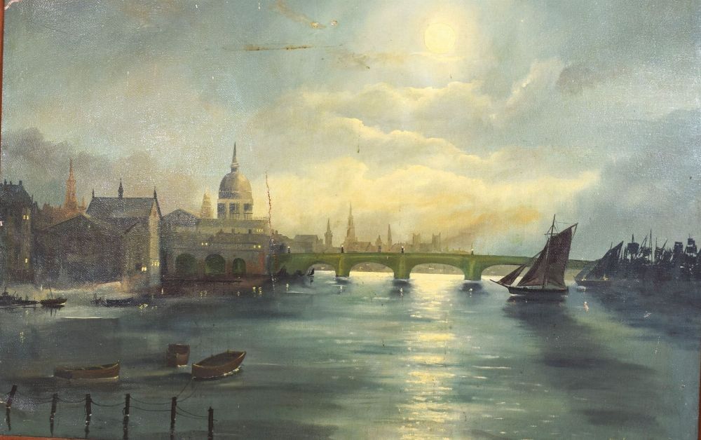 James Edmonds (19th/20th century), large oil on canvas, depicting a nocturnal view of the Thames with London Bridge and St. Paul's Cathedral under a moonlit sky. Figures, boats, and architectural silhouettes animate the riverside, the work rendered in a dramatic, atmospheric palette.