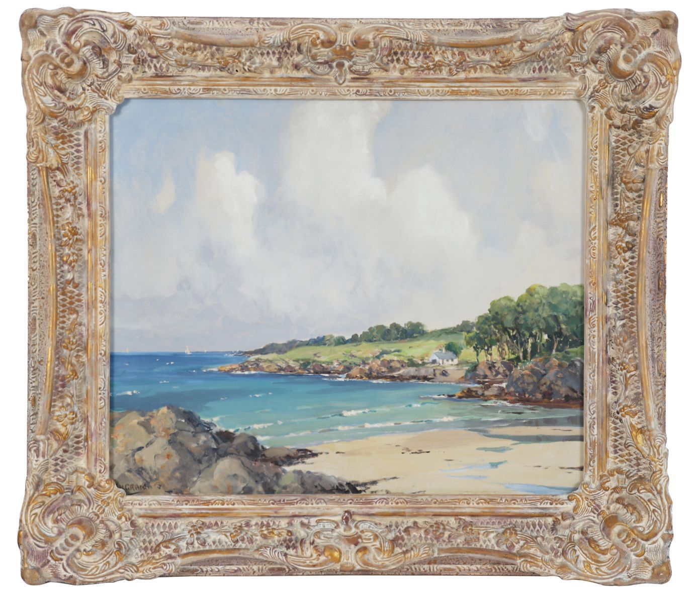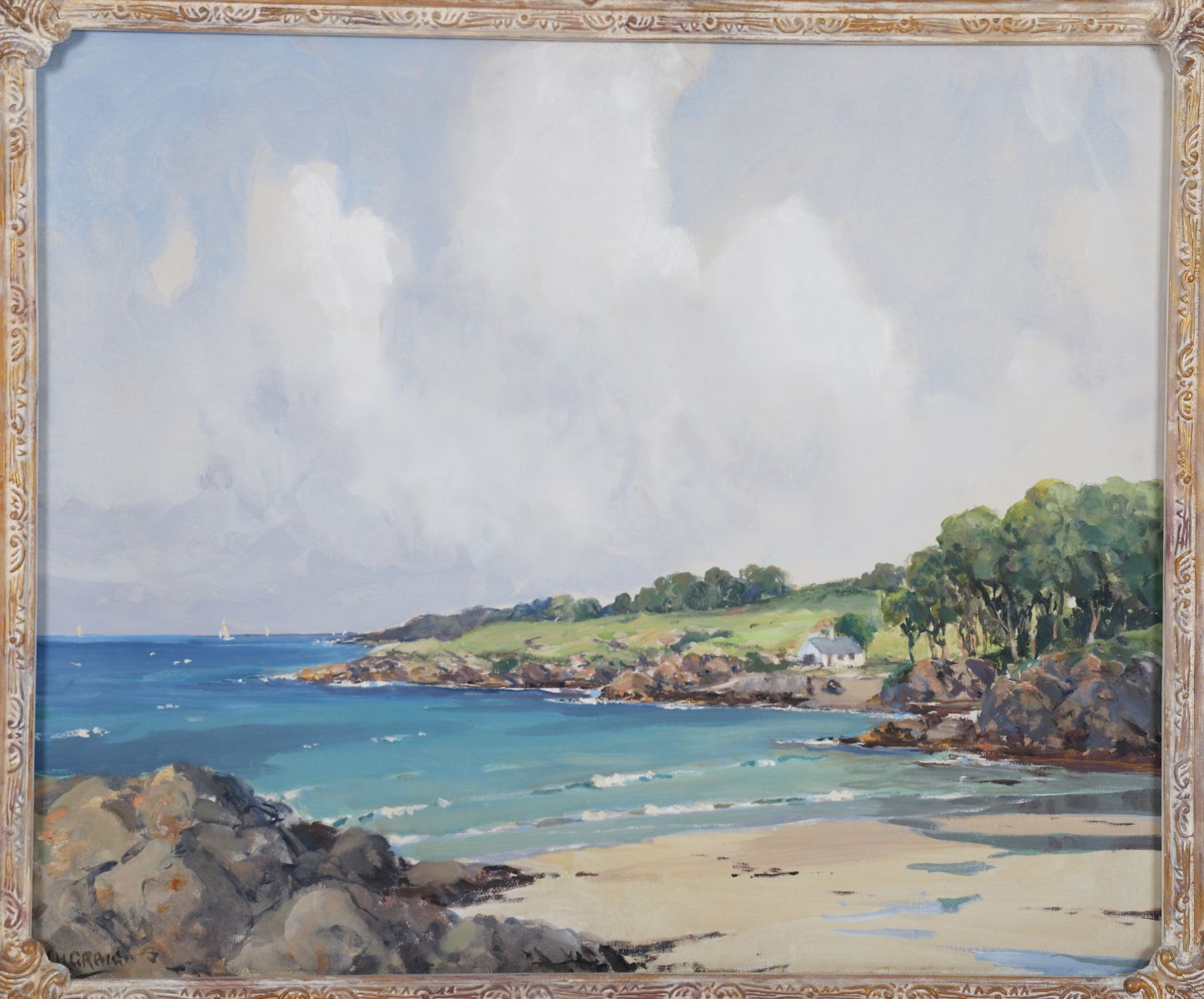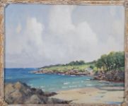 The satisfying composition here is set in an 2:1 ratio with the billowing sky, taking up two thirds of the canvas, with the lower section of greens, blues and earthy colours anchoring the beach and the cove. As such the scene would have been observed en plein air, contributing to its freshness and mood. Paul Henry's work, although more experimental, had an impact