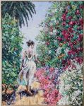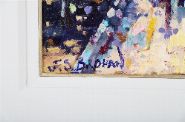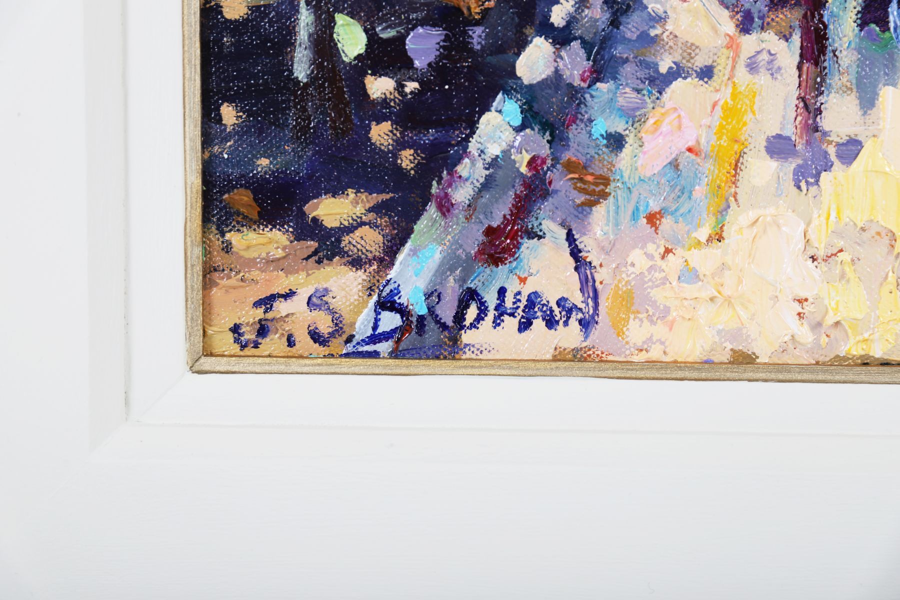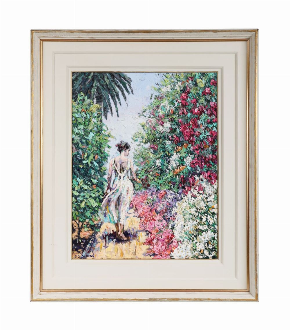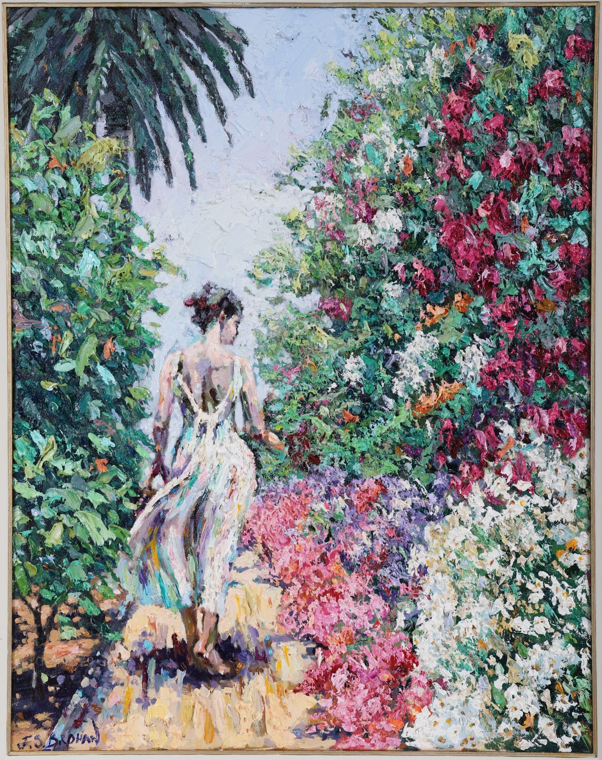 A richly textured impasto oil painting depicting a woman walking along a sunlit garden path flanked by dense flowering shrubs and lush foliage. Brohan’s distinctive palette-knife technique creates depth, movement and vibrant surface relief, with confident colour harmonies and an engaging sense of atmosphere. Signed lower left.