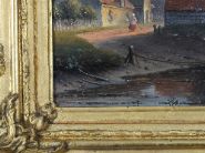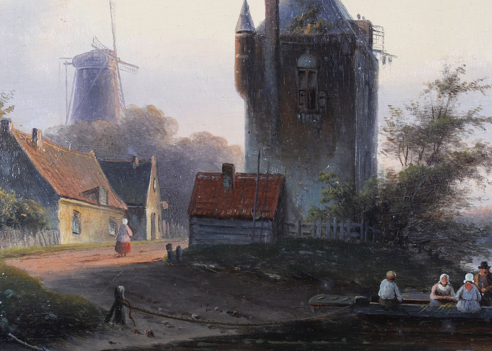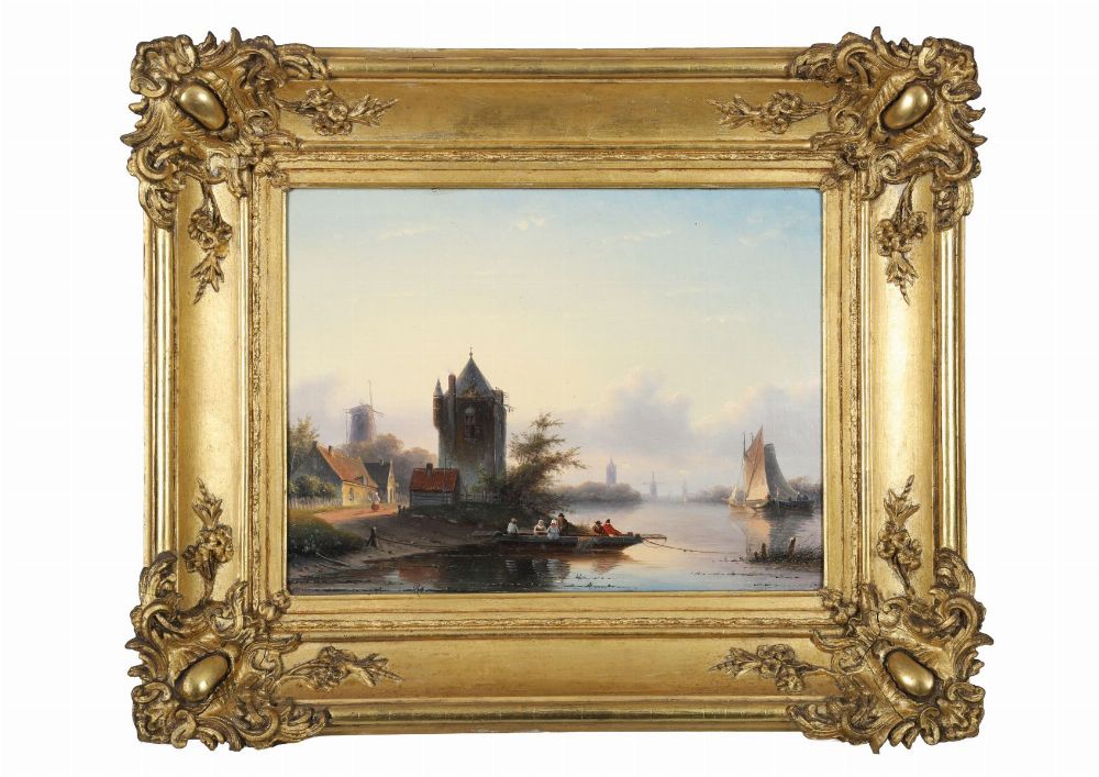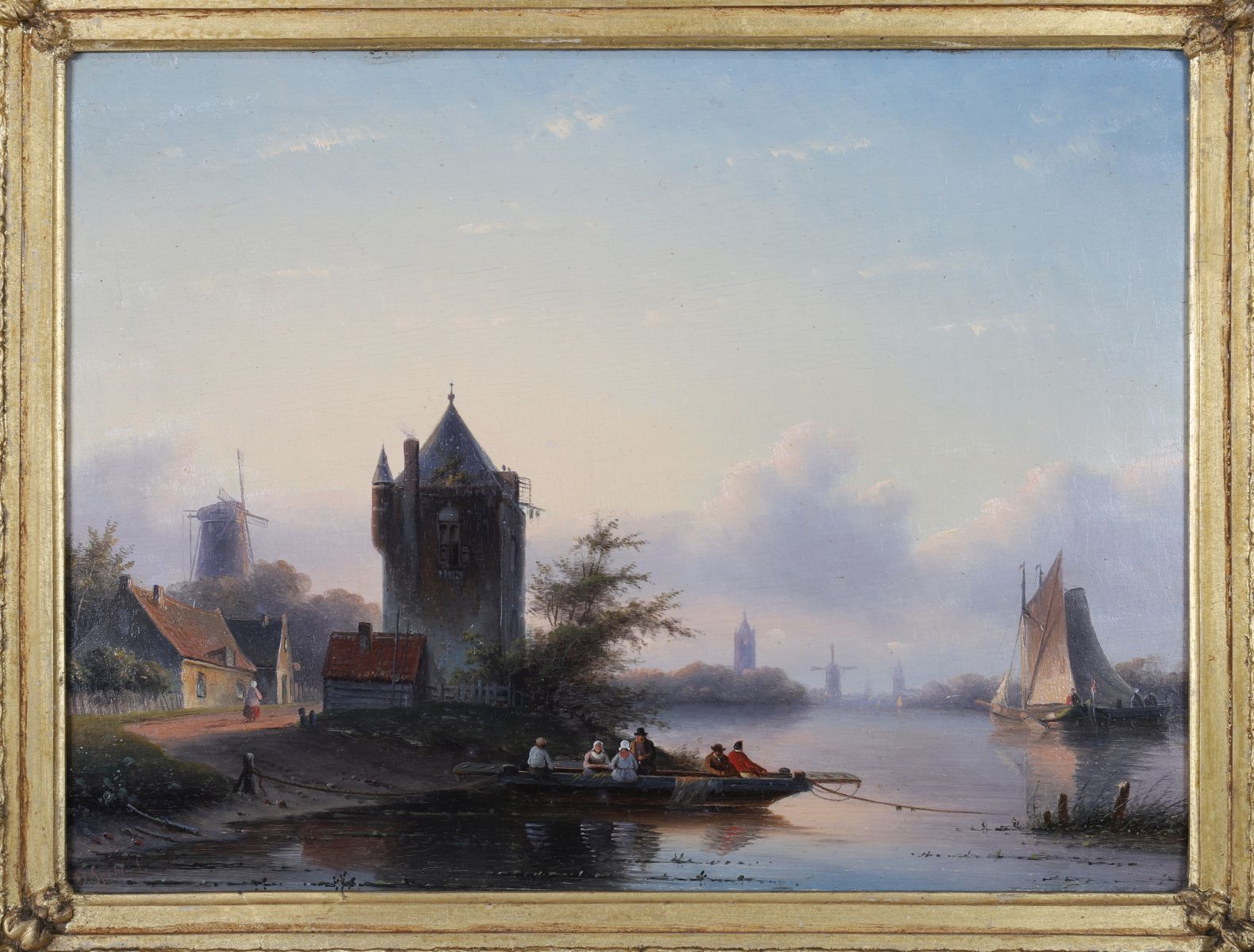 A Dutch riverside view depicting a small ferry carrying figures across calm water beside a village with windmills and a tower in the distance. Oil on panel, signed lower right. Presented in a gilt frame.