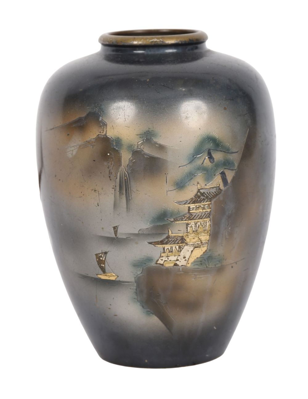 A small but finely worked Japanese Meiji-period vase, decorated with a landscape scene in subtle polychrome enamels against a dark ground. The composition features traditional pagodas set among mountains and trees, rendered with a soft atmospheric quality typical of late 19th-century cloisonné artistry.