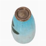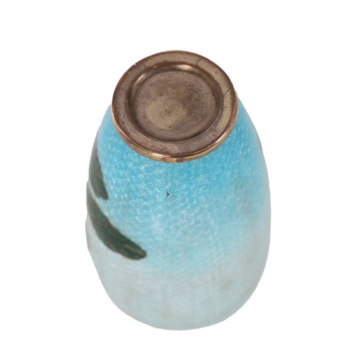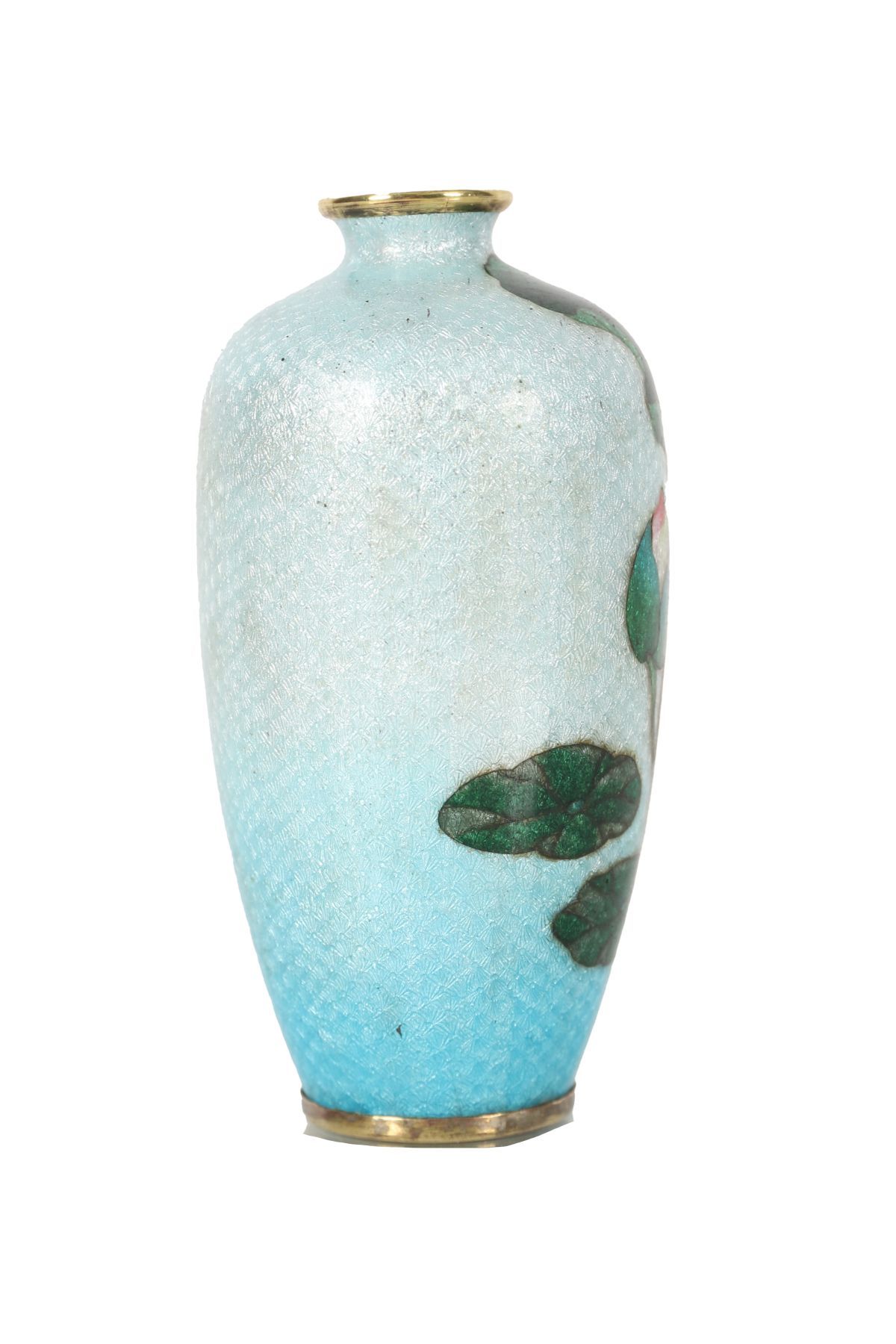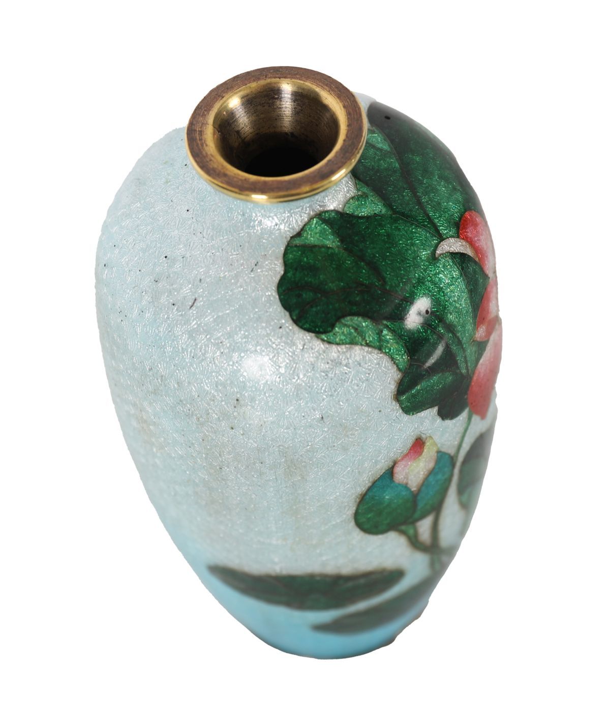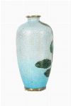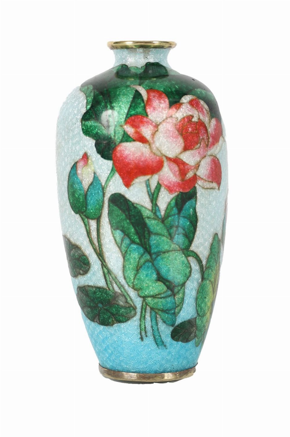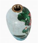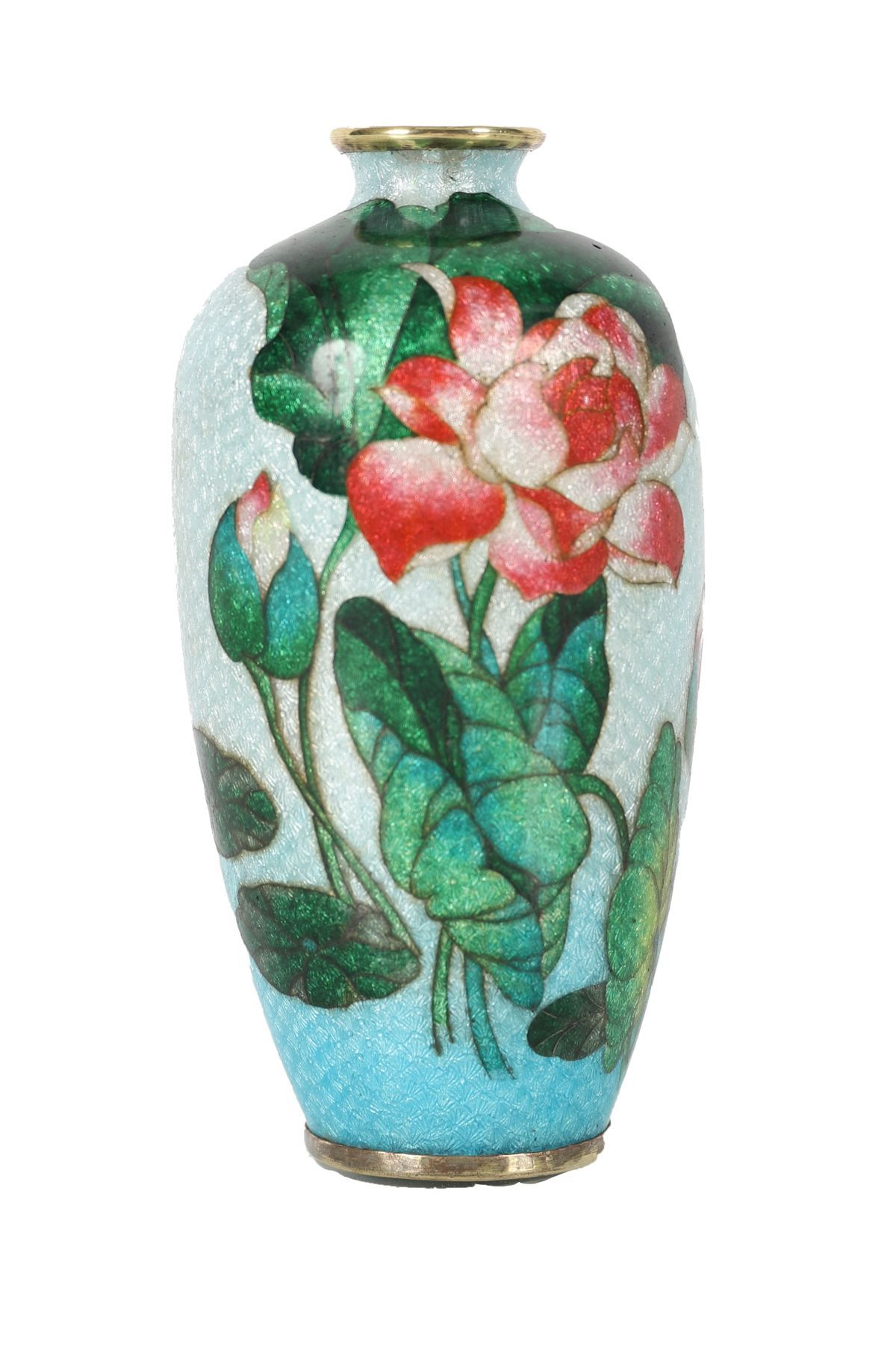 Small cloisonné enamel vase decorated with red and pink peonies among green foliage on a turquoise ground, exhibiting fine wirework and subtle gradation of enamel tones.