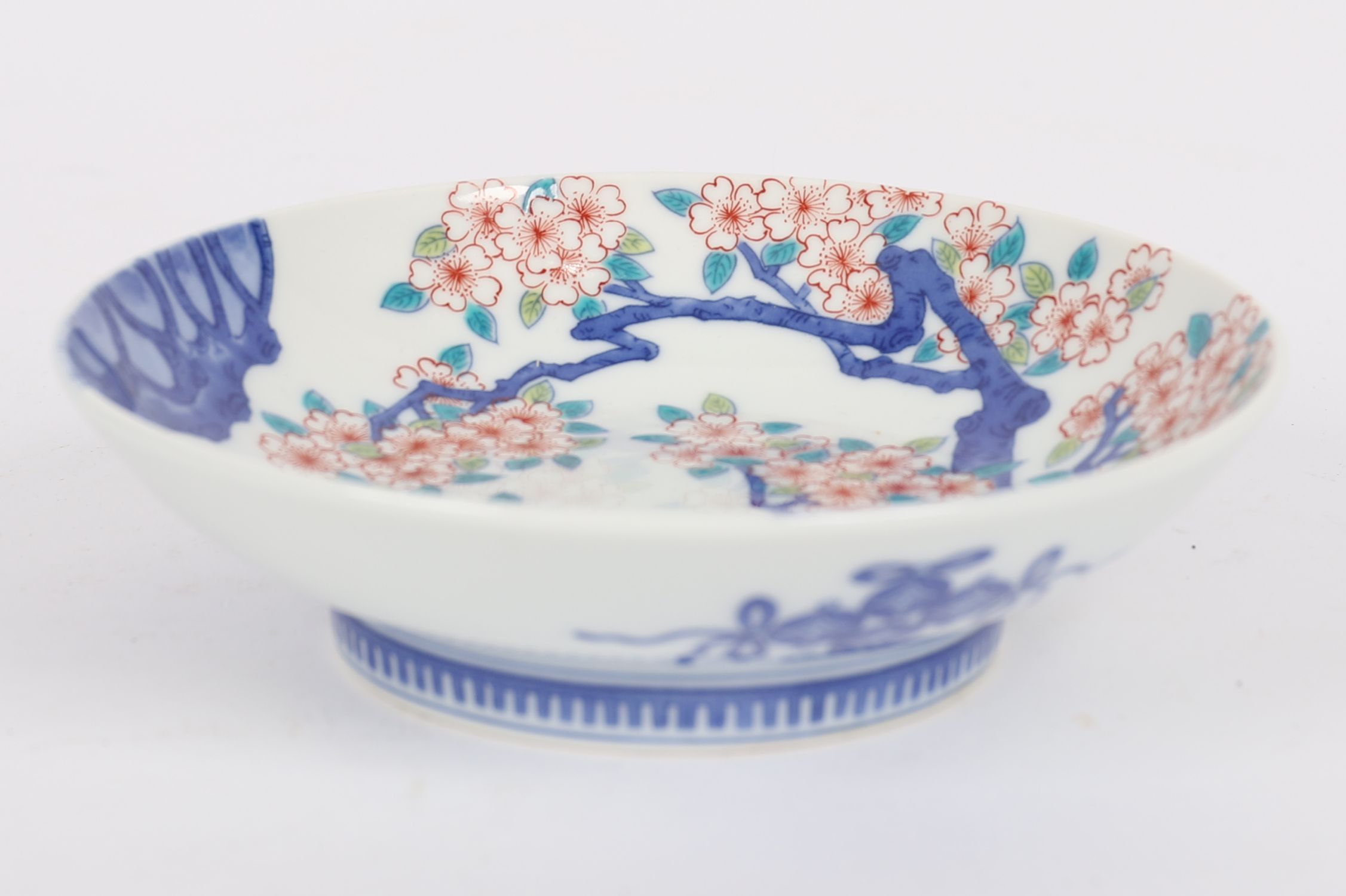 hand painted with flowering cherry blossoms in iron red and underglaze blue, a classic motif of renewal and spring.