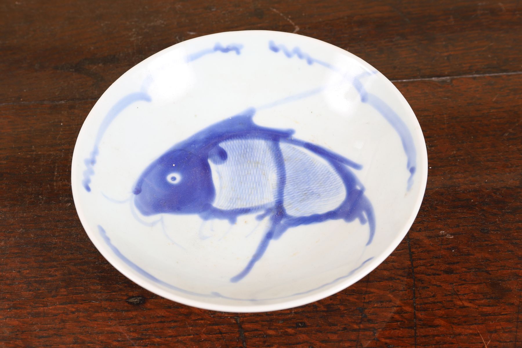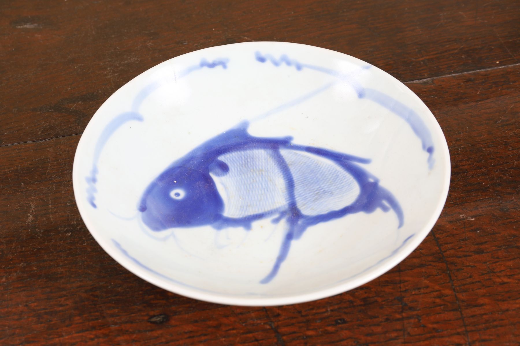 Painted with a stylised carp within a circular border, the reverse with simple brushwork decoration.