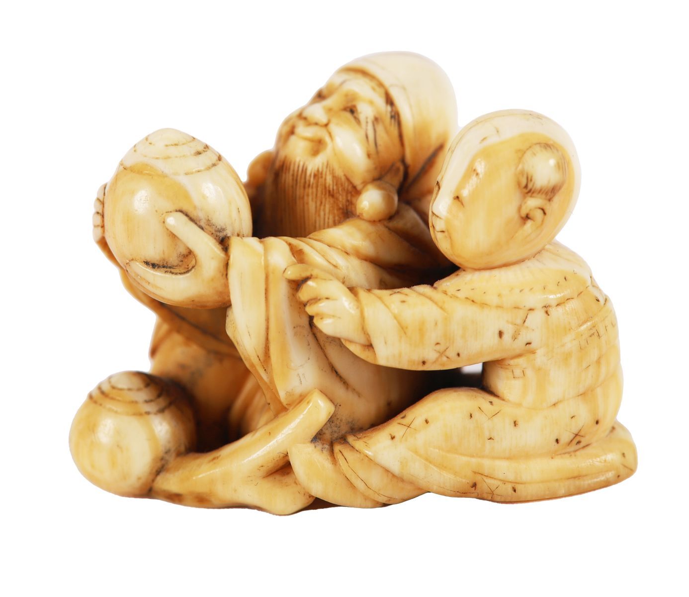 A finely carved Japanese ivory okimono depicting a seated figure holding a drum and drumstick, accompanied by a child figure, the group carved in the round with expressive facial detail and flowing drapery.