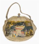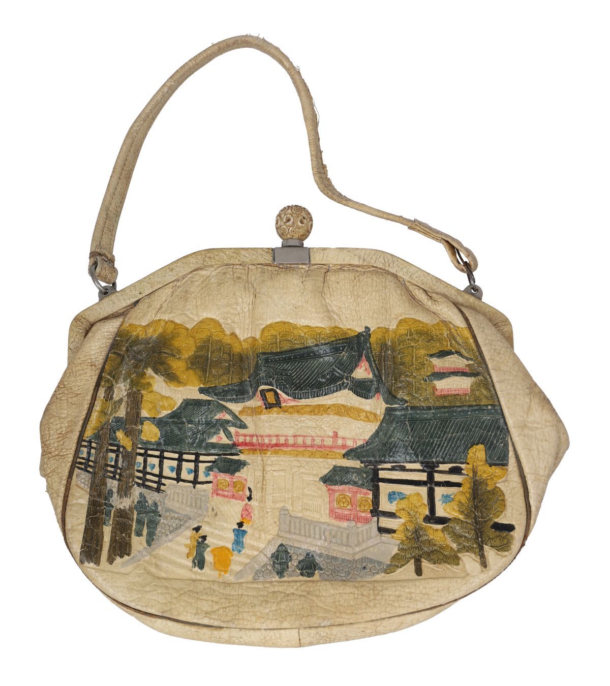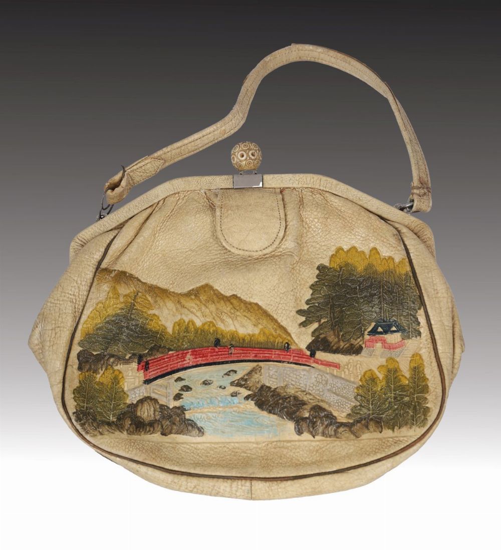 A vintage Japanese leather handbag finely painted in polychrome with a landscape scene depicting the iconic red Shinkyo Bridge at Nikko beneath forested mountains. The design is hand-tooled and painted directly onto the natural leather surface. The clasp is mounted with a carved composition bead, the interior lined in silk.