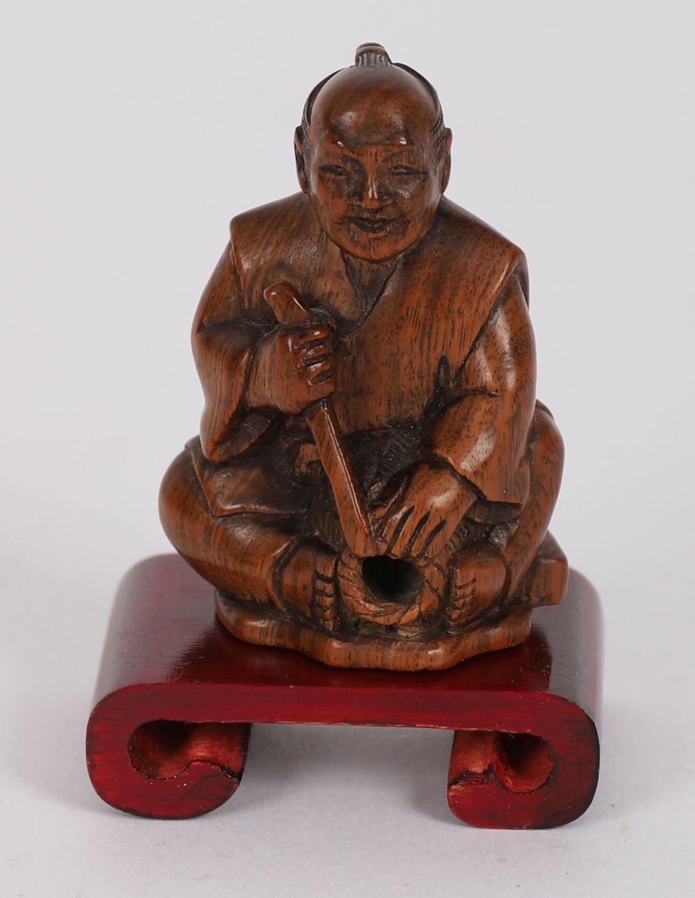 Finely carved hardwood netsuke depicting a seated elder with staff, the robes subtly detailed, signed underside. Mounted on a small hardwood display stand.