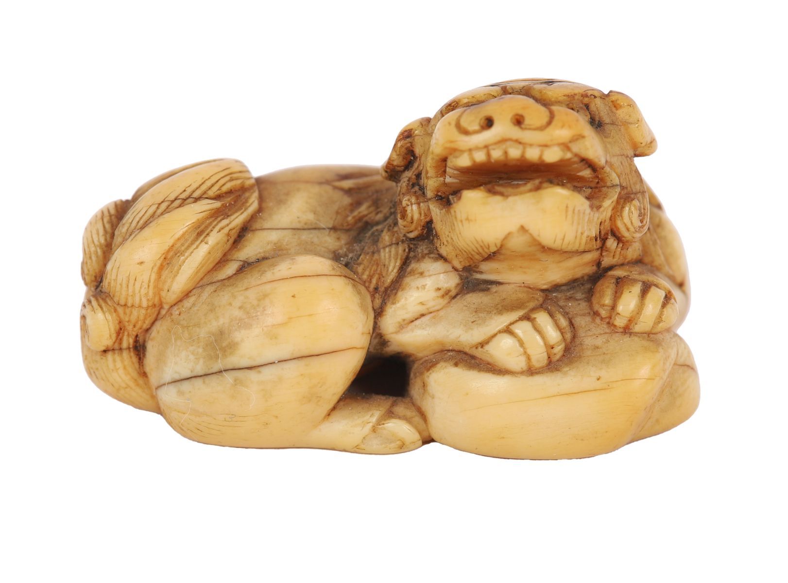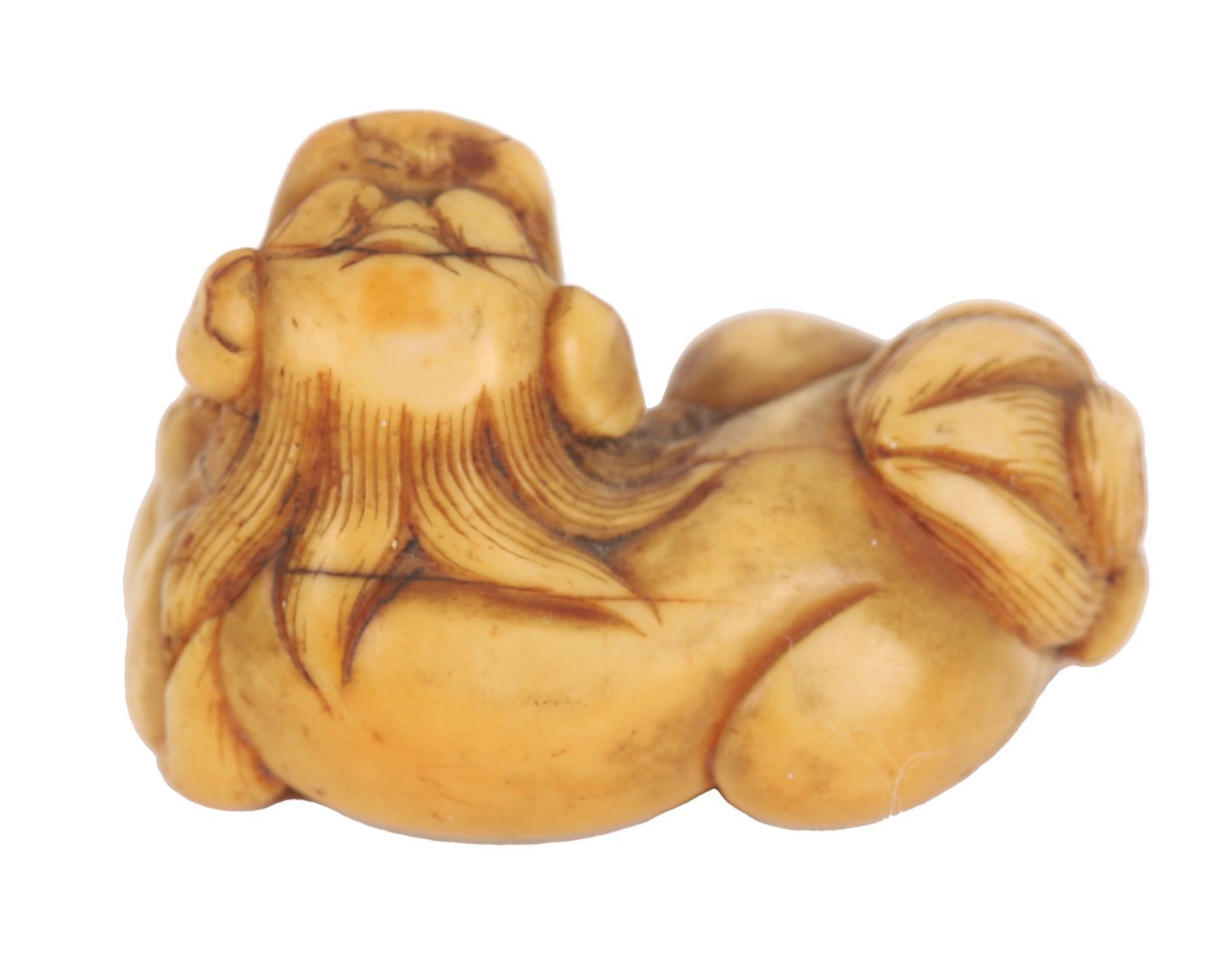 Lot 1077 JAPANESE IVORY NETSUKE OF A RECLINING SHISHI