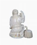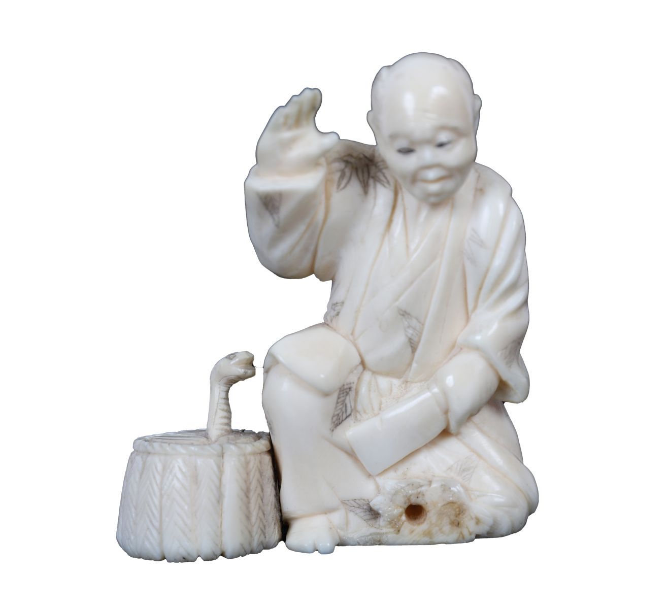 A small carved ivory figure of a boy holding an umbrella and basket, standing on a circular base.
