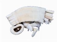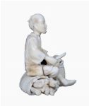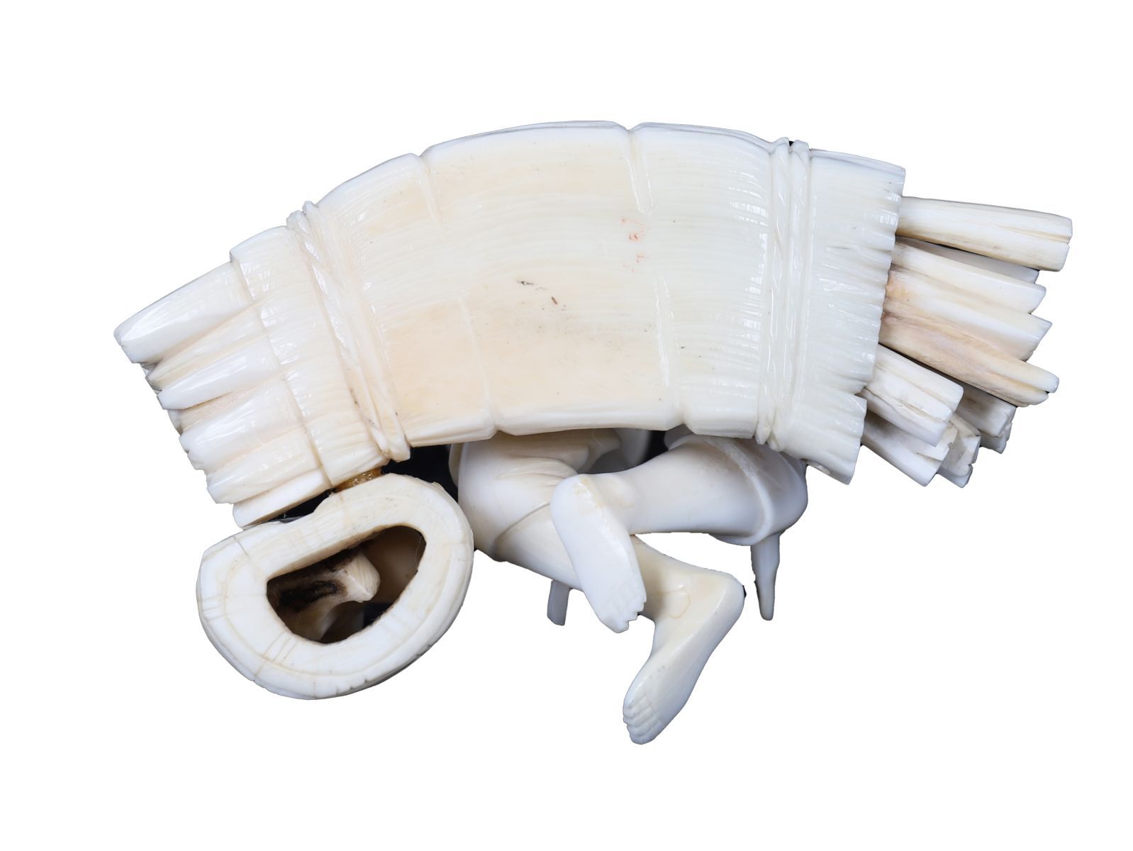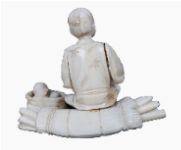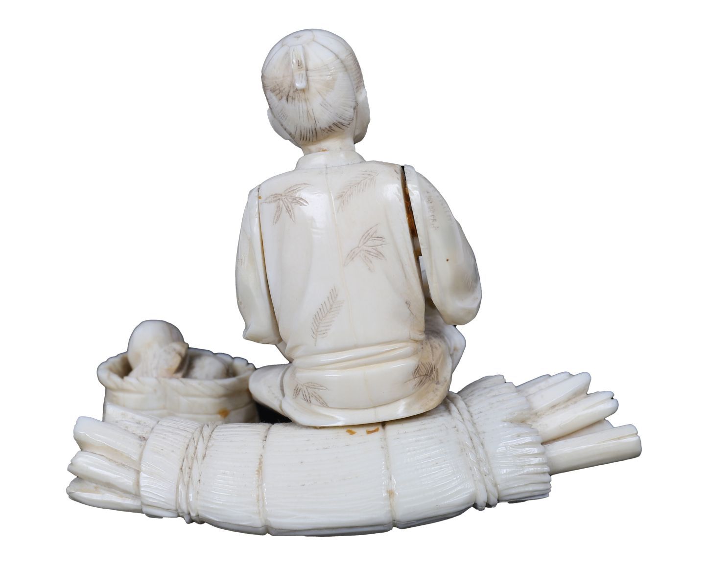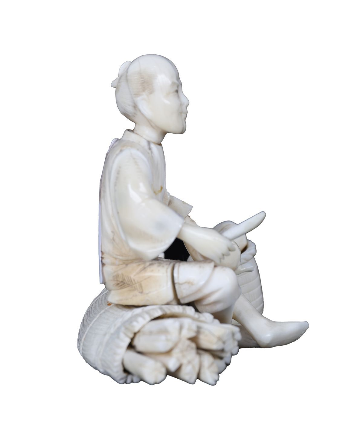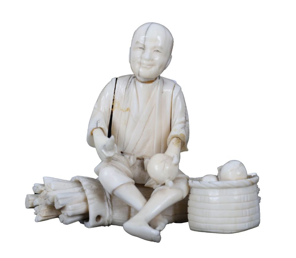Carved ivory figure of a seated farmer resting on a bundle of sticks, holding a hoe and carrying a sack of vegetables.