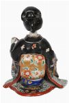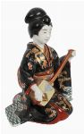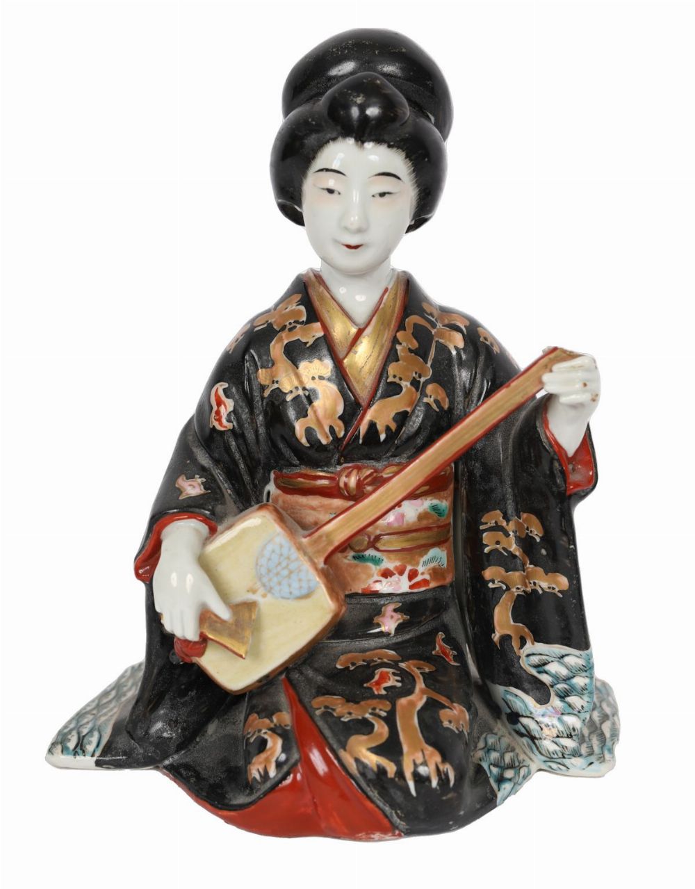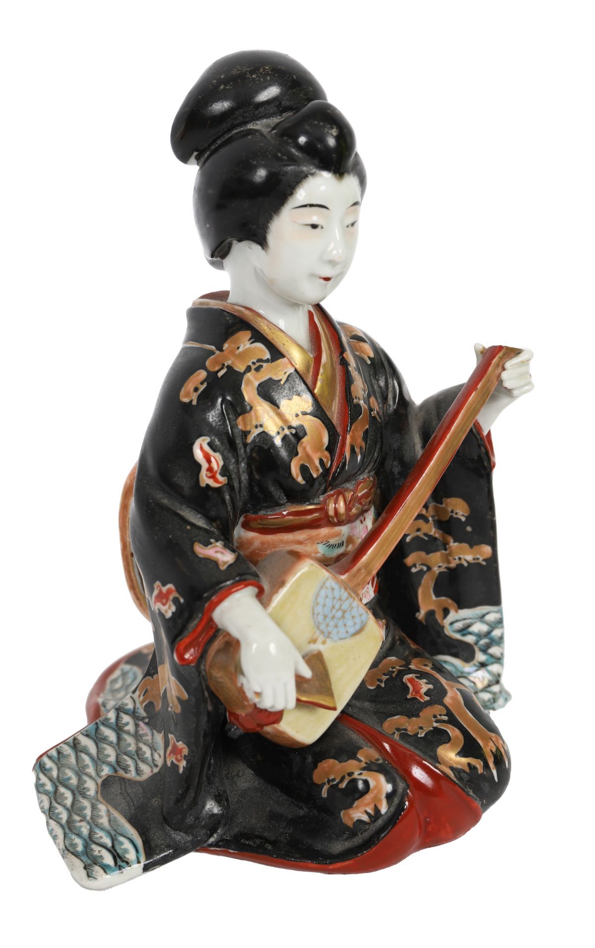 A Japanese Meiji period figure of a geisha playing a musical instrument, modelled in traditional dress with painted and gilt detail.