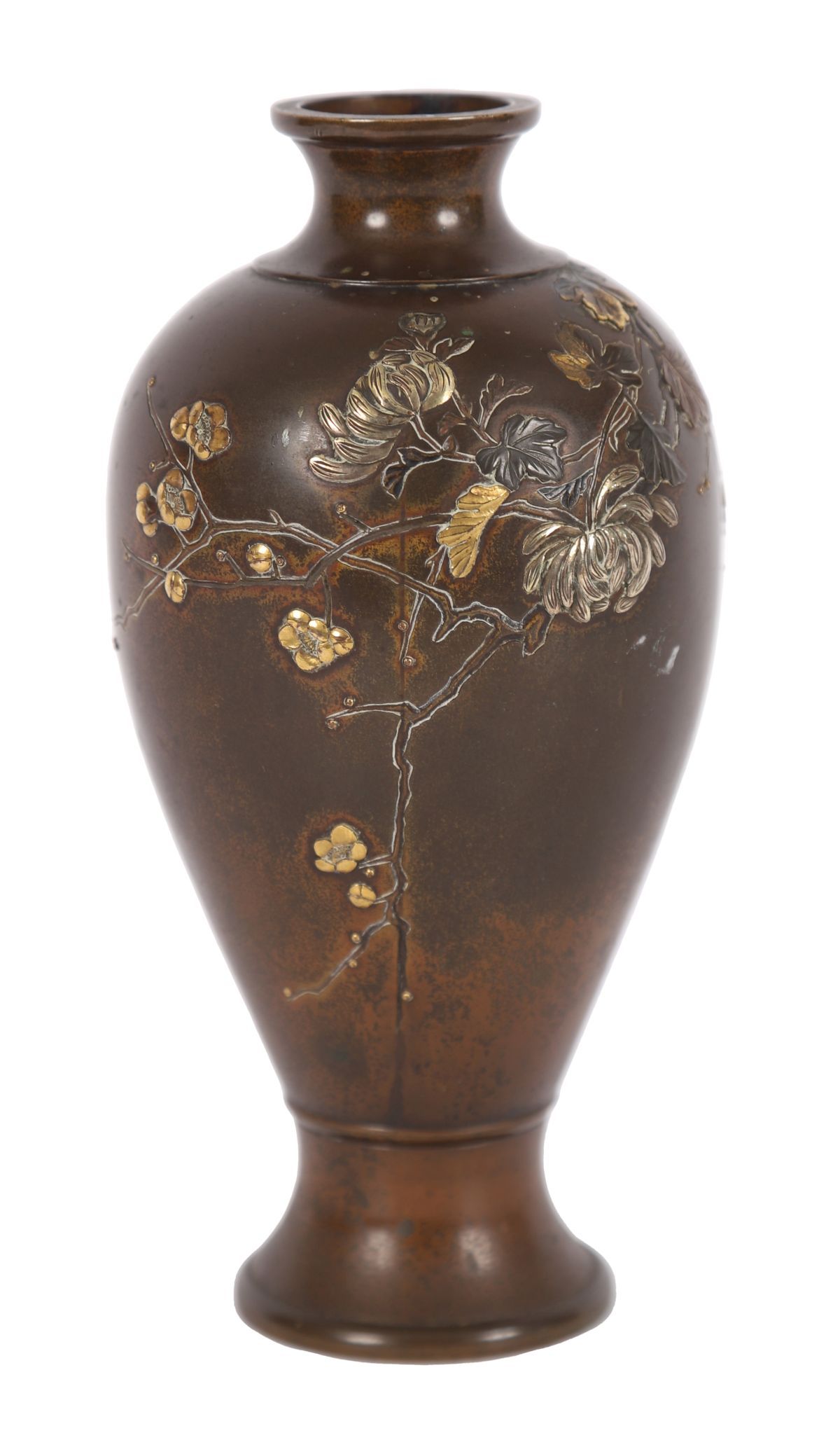 Japanese Meiji period bronze vase, decorated in relief with floral motifs and enriched with applied silver and gold detailing.