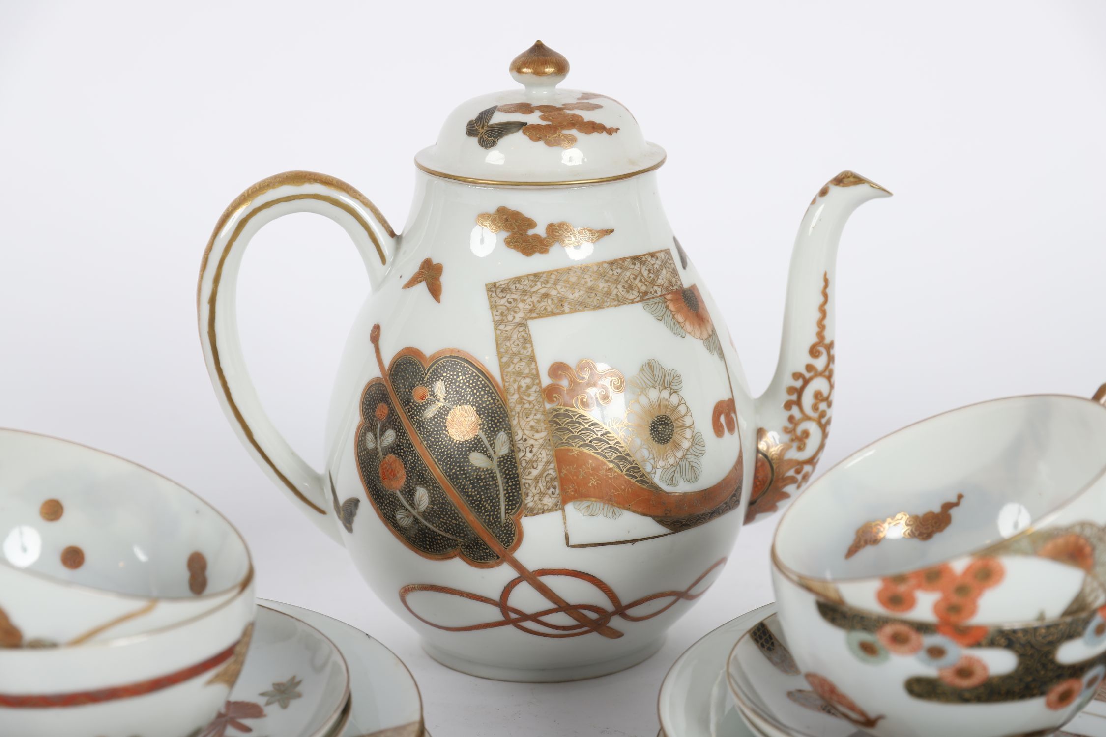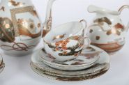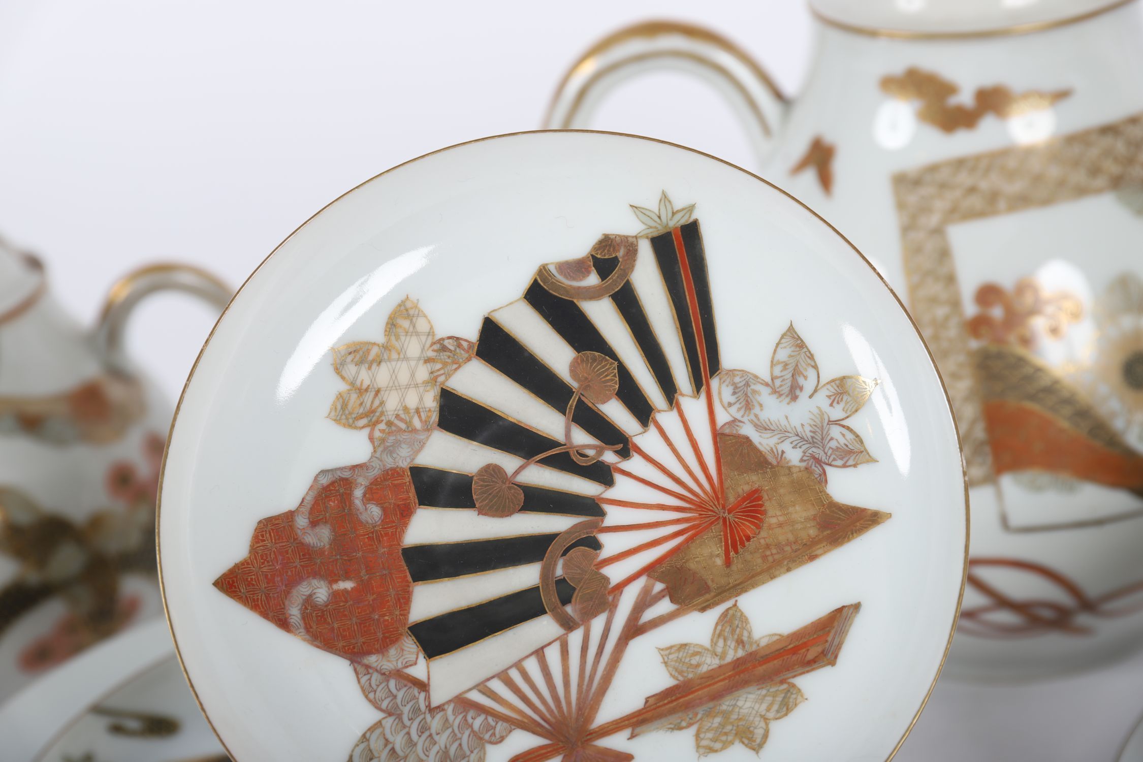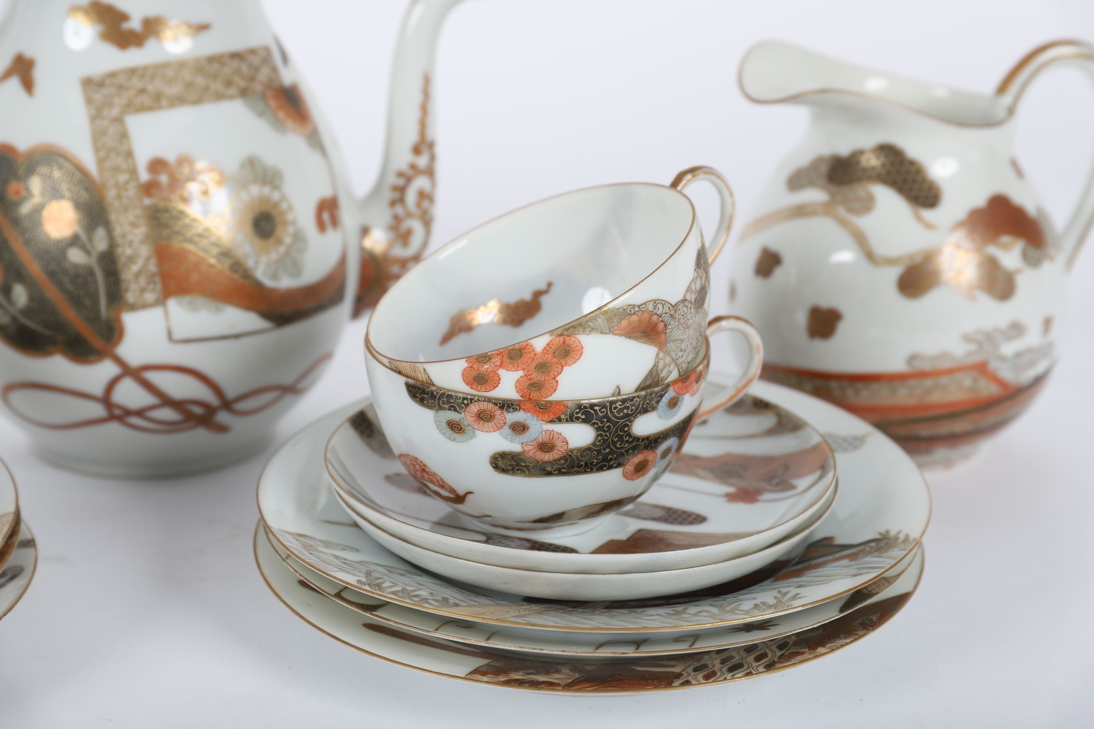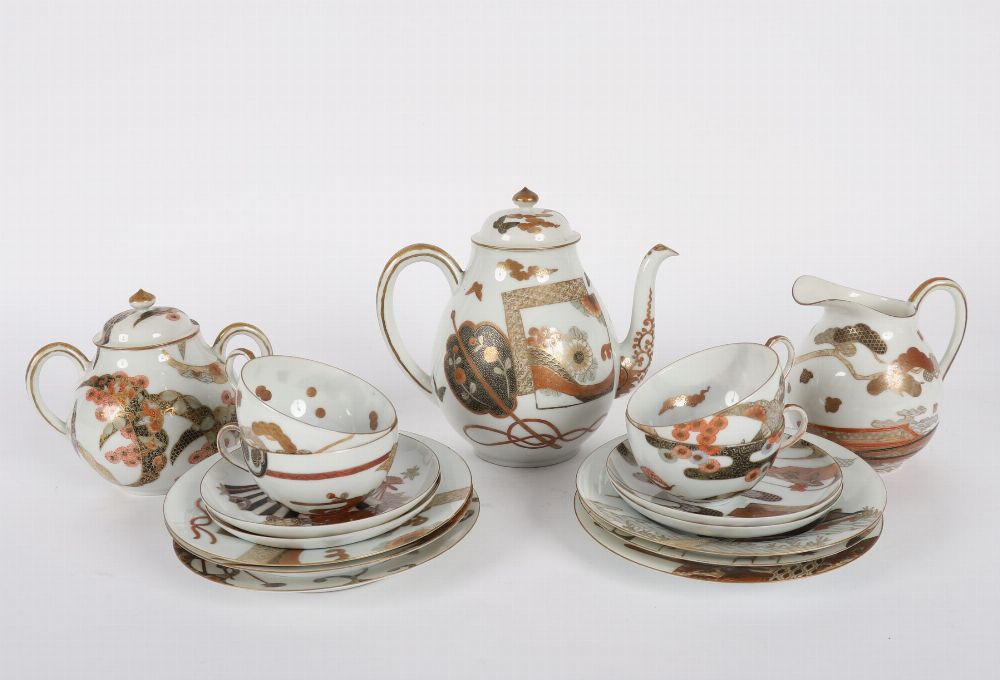 A Japanese porcelain tea set comprising 17 pieces, including teapot, lidded sugar bowl, milk jug, and matching teacups with saucers. Each decorated in traditional Japanese palette with hand-painted motifs, likely floral or scenic, and highlighted with gilt accents. Some pieces may bear marks to base. Comprising: tea pot, sugar bowl, jug, 6 side plates, 4 saucers and 4 teacups.