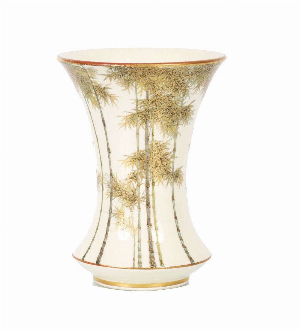 A small Japanese Satsuma vase of flared form, delicately painted with gilt bamboo and foliage on a cream crackle ground,