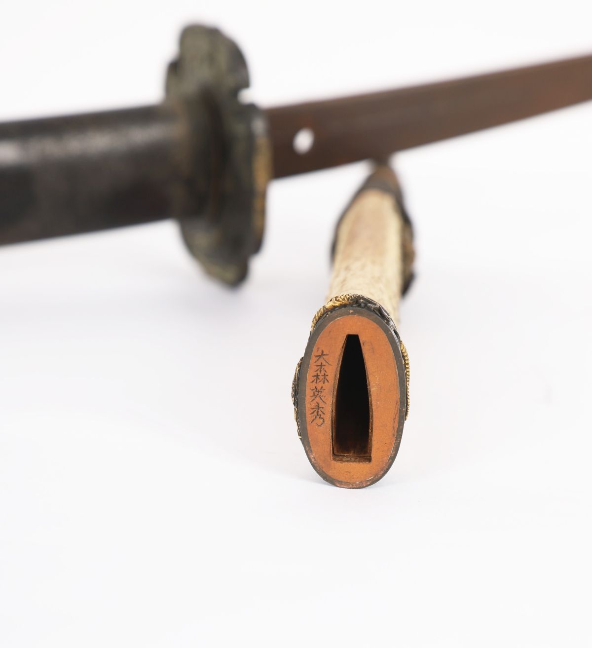 The tang aperture (nakago-ana) is signed (ÅŒmori Hidehide), a name associated with the ÅŒmori school.